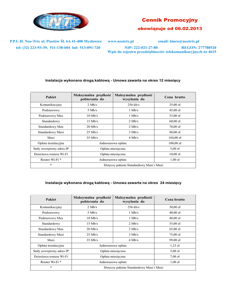 Cennik Promocyjny obowiązuje od 06.02.2013 P.P.U.H. Neo-Trix ul. Piastów Śl. 6A 41-408 Mysłowice tel: (32) 223-93-39, 511-138-604 lub 513-091-720 www.neotrix.pl email: [email protected] NIP: 222-021-27-80 REGON: 277788520 Wpis do rejestru przedsiębiorców telekomunikacyjnych nr 4615 Instalacja wykonana drogą kablową - Umowa zawarta na okres 12 miesięcy Pakiet Maksymalna prędkość Maksymalna prędkość pobierania do wysyłania do Cena brutto Komunikacyjny 2 Mb/s 256 kb/s 35,00 zł Podstawowy 5 Mb/s 1 Mb/s 45,00 zł Podstawowy Max 10 Mb/s 1 Mb/s 53,00 zł Standardowy 15 Mb/s 2 Mb/s 60,00 zł Standardowy Max 20 Mb/s 2 Mb/s 70,00 zł Standardowy Maxi 25 Mb/s 3 Mb/s 80,00 zł Maxi 35 Mb/s 4 Mb/s 104,00 zł Opłata instalacyjna Jednorazowa opłata 100,00 zł Stały zewnętrzny adres IP Opłata miesięczna 5,00 zł Dzierżawa routera Wi-Fi Opłata miesięczna 10,00 zł Router Wi-Fi * Jednorazowa opłata 1,00 zł * Dotyczy pakietu Standardowy Maxi i Maxi Instalacja wykonana drogą kablową - Umowa zawarta na okres 24 miesięcy Pakiet Komunikacyjny Maksymalna prędkość Maksymalna prędkość pobierania do wysyłania do Cena brutto 2 Mb/s 256 kb/s 30,00 zł Podstawowy 5 Mb/s 1 Mb/s 40,00 zł Podstawowy Max 10 Mb/s 1 Mb/s 48,00 zł Standardowy 15 Mb/s 2 Mb/s 55,00 zł Standardowy Max 20 Mb/s 2 Mb/s 65,00 zł Standardowy Maxi 25 Mb/s 3 Mb/s 75,00 zł Maxi 35 Mb/s 4 Mb/s 99,00 zł Opłata instalacyjna Jednorazowa opłata 1,23 zł Stały zewnętrzny adres IP Opłata miesięczna 5,00 zł Dzierżawa routera Wi-Fi Opłata miesięczna 7,00 zł Router Wi-Fi * Jednorazowa opłata 1,00 zł * Dotyczy pakietu Standardowy Maxi i Maxi Instalacja wykonana drogą Radiową - Umowa zawarta na okres 12 miesięcy Pakiet Maksymalna prędkość Maksymalna prędkość pobierania do wysyłania do Cena brutto Mini 2 Mb/s 256 kb/s 35,00 zł MiniMax 5 Mb/s 1 Mb/s 45,00 zł Optimum 8 Mb/s 2 Mb/s 55,00 zł Premium 10 Mb/s 2 Mb/s 65,00 zł Extreme 12 Mb/s 3 Mb/s 75,00 zł Opłata Instalacyjna Jednorazowa opłata 150,00 zł Stały zewnętrzny adres IP Opłata miesięczna 5,00 zł Dzierżawa routera Wi-Fi Opłata miesięczna 10,00 zł Router Wi-Fi * Jednorazowa opłata 1,00 zł * Dotyczy pakietu Premium i Extreme Instalacja wykonana drogą Radiową - Umowa zawarta na okres 24 miesięcy Pakiet Maksymalna prędkość Maksymalna prędkość pobierania do wysyłania do Cena brutto Mini 2 Mb/s 256 kb/s 30,00 zł MiniMax 5 Mb/s 1 Mb/s 40,00 zł Optimum 8 Mb/s 2 Mb/s 50,00 zł Premium 10 Mb/s 2 Mb/s 60,00 zł Extreme 12 Mb/s 3 Mb/s 70,00 zł Opłata Instalacyjna Opłata Jednorazowa 50,00 zł Stały zewnętrzny adres IP Opłata miesięczna 5,00 zł Dzierżawa routera Wi-Fi Opłata miesięczna 7,00 zł Router Wi-Fi * Jednorazowa opłata 1,00 zł * Dotyczy pakietu Premium i Extreme