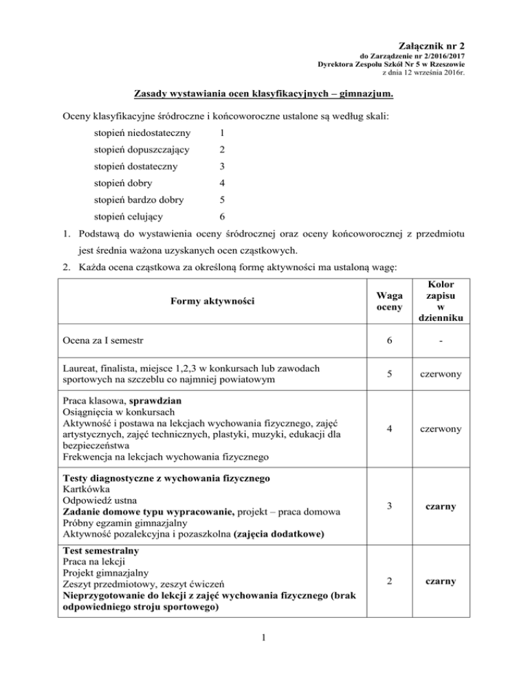 Załącznik nr 2 do Zarządzenie nr 2/2016/2017 Dyrektora Zespołu Szkół Nr 5 w Rzeszowie z dnia 12 września 2016r. Zasady wystawiania ocen klasyfikacyjnych – gimnazjum. Oceny klasyfikacyjne śródroczne i końcoworoczne ustalone są według skali: stopień niedostateczny 1 stopień dopuszczający 2 stopień dostateczny 3 stopień dobry 4 stopień bardzo dobry 5 stopień celujący 6 1. Podstawą do wystawienia oceny śródrocznej oraz oceny końcoworocznej z przedmiotu jest średnia ważona uzyskanych ocen cząstkowych. 2. Każda ocena cząstkowa za określoną formę aktywności ma ustaloną wagę: Waga oceny Kolor zapisu w dzienniku Ocena za I semestr 6 - Laureat, finalista, miejsce 1,2,3 w konkursach lub zawodach sportowych na szczeblu co najmniej powiatowym 5 czerwony Praca klasowa, sprawdzian Osiągnięcia w konkursach Aktywność i postawa na lekcjach wychowania fizycznego, zajęć artystycznych, zajęć technicznych, plastyki, muzyki, edukacji dla bezpieczeństwa Frekwencja na lekcjach wychowania fizycznego 4 czerwony Testy diagnostyczne z wychowania fizycznego Kartkówka Odpowiedź ustna Zadanie domowe typu wypracowanie, projekt – praca domowa Próbny egzamin gimnazjalny Aktywność pozalekcyjna i pozaszkolna (zajęcia dodatkowe) 3 czarny Test semestralny Praca na lekcji Projekt gimnazjalny Zeszyt przedmiotowy, zeszyt ćwiczeń Nieprzygotowanie do lekcji z zajęć wychowania fizycznego (brak odpowiedniego stroju sportowego) 2 czarny Formy aktywności 1 Zadanie domowe Nieprzygotowanie do lekcji Aktywność lekcyjna 1 Test diagnostyczny ( nie dotyczy wychowania fizycznego) 0 czarny niebieski 3. Przy zapisie ocen cząstkowych dopuszcza się stosowanie znaków „+” i „-„ przyporządkowując im odpowiednie wartości według skali: Ocena 6 -6 +5 5 -5 +4 4 -4 +3 3 -3 +2 2 -2 +1 1 Wartość 6 5,75 5,5 5 4,75 4,5 4 3,75 3,5 3 2,75 2,5 2 1,75 1,5 1 4. Oceny cząstkowe muszą być zróżnicowane pod względem wagi. 5. Formę aktywności wynikającą ze specyfiki danego przedmiotu określa nauczyciel. 6. Nauczyciel informuje uczniów o wadze danej formy aktywności. Jeżeli nauczyciel chce ocenić inną formę aktywności ( nieokreśloną w tabeli) informuje uczniów o wadze tej aktywności. 7. Jeżeli uczeń nie był obecny np. podczas pisania pracy klasowej otrzymuje wpis do dziennika:”0”. Zero jest zastępowane oceną uzyskaną przez ucznia w wyniku napisania zaległej pracy w wyznaczonym terminie lub oceną niedostateczną jeśli tego nie zrobi. 8. Pisemna praca klasowa, z której uczeń otrzymał ocenę niedostateczną może być poprawiana na wniosek ucznia w terminie ustalonym przez nauczyciela nie później niż w ciągu dwóch tygodni. Ocenę można poprawiać tylko raz. Uzyskana ocena ma wagę określoną w tabeli. 9. Ocena z testu diagnostycznego, semestralnego i próbnego egzaminu nie podlega poprawie. 10. Podstawą obliczenia średniej ważonej są wszystkie otrzymane oceny. W przypadku ocen poprawianych obie wlicza się do średniej. 11. Na podstawie ocen uzyskanych w I semestrze nauczyciel wystawia ocenę śródroczną. Ocenę końcoworoczną wystawia się na podstawie ocen uzyskanych przez ucznia w II semestrze oraz oceny za I semestr liczonej w II semestrze jako ocena cząstkowa z wagą 6. 12. Ocena końcoworoczna może być podwyższona tylko o 1 stopień w stosunku do oceny śródrocznej. 13. Na ocenę śródroczną i końcoworoczną uczeń pracuje systematycznie. Nie ma możliwości zmiany oceny w wyniku jednorazowego przygotowania się z określonej części materiału. 2 14. Ocena proponowana śródroczna lub końcoworoczna nie jest oceną ostateczną. Może ulec zmianie – podwyższeniu lub obniżeniu, ze względu na otrzymanie dodatkowych ocen cząstkowych. 15. W przypadku uczniów, którzy osiągnęli średnią ważoną na granicy oceny niedostatecznej, nauczyciel ma prawo wystawić zagrożenie oceną niedostateczną (śródroczna lub końcoworoczna). 16. Ocena śródroczna i końcoworoczna wystawiana jest tylko na podstawie średniej ważonej ocen cząstkowych następująco: Średnia ważona Stopień poniżej 1,61 od 1,61 do 2,60 od 2,61 do 3,65 od 3,66 do 4,60 od 4,61 do 5,30 od 5,31 niedostateczny dopuszczający dostateczny dobry bardzo dobry celujący Obliczanie średniej ważonej odbywa się według algorytmu: mnożymy każdą ocenę przez jej wagę, sumujemy wszystkie iloczyny i dzielimy przez sumę wszystkich wag (jeśli jakaś waga została użyta kilka razy to tyle samo razy trzeba ją dodać do sumy). Przykład waga oceny 4: 6 waga oceny 3: 3 waga oceny 2: 1,1,4 obliczenie średniej ważonej: 4 6 3 3 (1 1 4) 2 24 9 12 45 3,46 4 3 23 13 13 Otrzymana ocena: dostateczny. 3