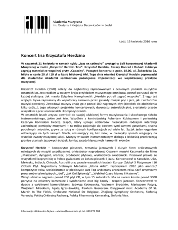 Łódź, 13 kwietnia 2016 roku Koncert tria Krzysztofa Herdzina W czwartek 21 kwietnia w ramach cyklu „Jazz ex cathedra” wystąpi w Sali koncertowej Akademii Muzycznej w Łodzi „Krzysztof Herdzin Trio”. Krzysztof Herdzin, Cezary Konrad i Robert Kubiszyn zagrają materiał ze wspólnej płyty „Capacity”. Początek koncertu o godz. 18.00, ul. Żubardzka 2a, bilety w cenie 20 zł i 10 zł w kasie biletowej AM. Tego dnia również Krzysztof Herdzin poprowadzi dla studentów Akademii seminarium poświęcone improwizacji we współczesnej praktyce muzycznej. Krzysztof Herdzin (1970) należy do najbardziej zapracowanych i cenionych polskich muzyków ostatnich lat. Jest rzadkim w naszym kraju przykładem muzycznego omnibusa, potrafi poruszać się w każdej stylistyce. Jak mawia Zbigniew Namysłowski: „Herdzin potrafi zagrać wszystko”. Z tego też względu bywa zapraszany do współpracy zarówno przez gwiazdy muzyki pop i jazz, jak i wirtuozów muzyki poważnej. Zawodowi muzycy znają go z ponad 180 nagranych płyt (dorobek do obdzielenia kilku osób…), jego własnych projektów koncertowych, dwunastu autorskich płyt, a ostatnio przede wszystkim z prac aranżerskich i kompozytorskich. W ostatnich latach artysta powrócił do swojej ulubionej formy muzykowania i ukochanego składu instrumentalnego, jakim jest trio. Wspólnie z kontrabasistą Robertem Kubiszynem i perkusistą Cezarym Konradem tworzą zespół, który ujmuje odbiorców niezwykłym rodzajem interakcji zachodzącej pomiędzy muzykami – ta trójka pasjonuje się bowiem tymi samymi gatunkami, słucha podobnych artystów, grywa ze sobą w różnych konfiguracjach od wielu lat. Są jak jeden organizm odbierający na tych samych falach, rozumiejący się bez słów, w niezwykły sposób reagujący na wszelkie zwroty muzycznej akcji. Muzycy w swoim instrumentalnym dialogu z lekkością przekraczają granice utartych jazzowych ścieżek, łamiąc zasady klasycznych harmonii i rytmów. Krzysztof Herdzin – kompozytor piosenek, tematów jazzowych i dużych form orkiestrowych należących do muzyki współczesnej, orkiestrator nagrodzonej Oscarem muzyki Kaczmarka do filmu „Marzyciel”, dyrygent, aranżer, producent płytowy, wykładowca akademicki. Pracował prawie ze wszystkimi liczącymi się w Polsce gwiazdami ze świata piosenki i jazzu. Koncertował w Kanadzie, USA, Meksyku, Indiach, Chinach, Australii oraz prawie wszystkich krajach Europy. Zdobył 3 Platynowe i 16 Złotych Płyt. Nagrodzony Srebrnym Medalem „Gloria Artis”, Fryderykiem 2012 jako aranżer/ kompozytor roku, sześciokrotnie w plebiscycie Jazz Top wybierany aranżerem roku. Szef artystyczny programów telewizyjnych „Idol”, „Jak Oni Śpiewają”, „Wehikuł Czasu Manna i Materny”. Wziął udział w nagraniu ponad 200 płyt CD, w tym 15 autorskich. Ma na swoim koncie ponad 3000 partytur na orkiestry kameralne i symfoniczne oraz big bandy i zespoły jazzowe. Koncertował w duecie z wybitnymi kameralistami: Jadwigą Kotnowską, Vadimem Brodskim, Mariuszem Patyrą, Wojtkiem Mrozkiem, Agatą Igras-Sawicką, Pawłem Gusnarem. Dyrygował m.in: Academy Of St. Martin In The Fields, Orchestre National De Belgique, Zhejiang Symphony Orchestra, Sinfonią Varsovią, Polską Orkiestrą Radiową, Polską Fiharmonią Kameralną, Sinfonią Viva. Informacje: Aleksandra Bęben – [email protected], tel. 668 271 308 Cezary Konrad – wybitny perkusista, nieprzerwanie od roku 1992 uznawany za najlepszego polskiego perkusistę jazzowego według rankingu Jazz Top w czasopiśmie „Jazz Forum”. Współpracował m.in. z Leszkiem Możdżerem, Zbigniewem Namysłowskim, Markiem Napiórkowskim, Tomaszem Stańko oraz z zagranicznymi muzykami, takimi jak: Karrin Allyson, Randy Brecker, Deborah Brown, Mino Cinelu, Joe de Franco, Paul Imm, Didier Lockwood, Pat Metheny, Nippy Noya, Susan Weinert. Robert Kubiszyn – znakomity gitarzysta basowy i kontrabasista mający na koncie współpracę m.in. z Markiem Napiórkowskim, Adamem Pierończykiem, Deanem Brownem, Jonem Herringtonem, Mino Cinelu, Zbigniewem Namysłowskim, Marią Schneider. Wydał solowy album „Before Sunrise”. Więcej informacji: http://www.amuz.lodz.pl/lifemotion/pl/aktualnosci/63-2016/150495-koncert-z-cyklu-jazz-excathedra-21-04-2016/ Informacje: Aleksandra Bęben – [email protected], tel. 668 271 308