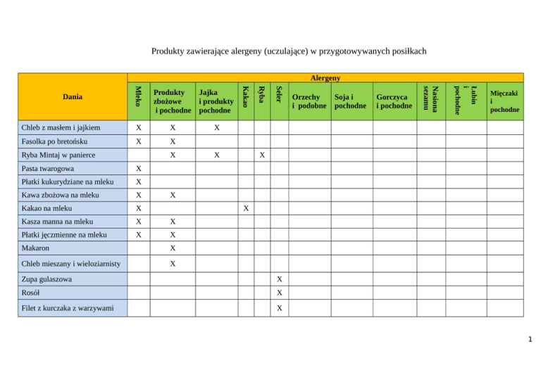 Produkty zawierające alergeny (uczulające) w przygotowywanych posiłkach Alergeny X X Ryba Mintaj w panierce X Pasta twarogowa X Płatki kukurydziane na mleku X Kawa zbożowa na mleku X Kakao na mleku X Kasza manna na mleku X X Płatki jęczmienne na mleku X X X Soja i pochodne Gorczyca i pochodne Łubin i pochodne Fasolka po bretońsku X Orzechy i podobne Nasiona sezamu X Seler X Ryba Chleb z masłem i jajkiem Jajka i produkty pochodne Kakao Mleko Produkty zbożowe i pochodne Dania Mięczaki i pochodne X X X Makaron X Chleb mieszany i wieloziarnisty X Zupa gulaszowa X Rosół X Filet z kurczaka z warzywami X 1 Alergeny X Chleb z masłem i jajkiem X X Ryba duszona z warzywami X X X X Barszcz czerwony Łopatka w sosie własnym z warzywami Mięczaki i pochodne X Płatki jaglane na mleku Makaron na mleku X Gorczyca i pochodne X Pierś z kurczaka w płatkach kukurydzianych Chleb mieszany z masłem i żółtym serem Łazanki z kapustą i mięsem z warzywami X Soja i pochodne Łubin i pochodne X Orzechy i podobne Nasiona sezamu Płatki ryżowe na mleku Seler X Jajka i produkty pochodne Ryba Makaron z serem Produkty zbożowe i pochodne Kakao Mleko Dania X X X X 2 Alergeny X Zupa pomidorowa X X Zupa ogórkowa X X Buraczki zasmażane X Kotlet z piersi kurczaka w panierce Mięso z indyka w sosie śmietanowo-koperkowym Krupnik z mięsem i ziemniakami X Pulpety w sosie pomidorowym X X Gorczyca i pochodne Mięczaki i pochodne Kasza gryczana Soja i pochodne Łubin i pochodne X Orzechy i podobne Nasiona sezamu X Seler Kotlet mielony Ryba Jajka i produkty pochodne Kakao Mleko Produkty zbożowe i pochodne Dania X X X X 3