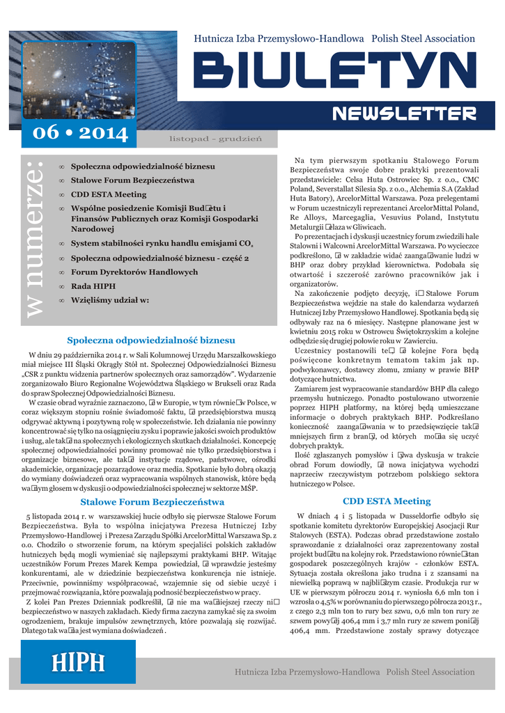 Hutnicza Izba Przemysłowo-Handlowa Polish Steel Association w numerze: 06 • 2014 listopad - grudzień • Społeczna odpowiedzialność biznesu • Stalowe Forum Bezpieczeństwa • CDD ESTA Meeting • Wspólne posiedzenie Komisji Budżetu i Finansów Publicznych oraz Komisji Gospodarki Narodowej • System stabilności rynku handlu emisjami CO2 • Społeczna odpowiedzialność biznesu - część 2 • Forum Dyrektorów Handlowych • Rada HIPH • Wzięliśmy udział w: Społeczna odpowiedzialność biznesu W dniu 29 października 2014 r. w Sali Kolumnowej Urzędu Marszałkowskiego miał miejsce III Śląski Okrągły Stół nt. Społecznej Odpowiedzialności Biznesu „CSR z punktu widzenia partnerów społecznych oraz samorządów". Wydarzenie zorganizowało Biuro Regionalne Województwa Śląskiego w Brukseli oraz Rada do spraw Społecznej Odpowiedzialności Biznesu. W czasie obrad wyraźnie zaznaczono, że w Europie, w tym również w Polsce, w coraz większym stopniu rośnie świadomość faktu, że przedsiębiorstwa muszą odgrywać aktywną i pozytywną rolę w społeczeństwie. Ich działania nie powinny koncentrować się tylko na osiągnięciu zysku i poprawie jakości swoich produktów i usług, ale także na społecznych i ekologicznych skutkach działalności. Koncepcję społecznej odpowiedzialności powinny promować nie tylko przedsiębiorstwa i organizacje biznesowe, ale także instytucje rządowe, państwowe, ośrodki akademickie, organizacje pozarządowe oraz media. Spotkanie było dobrą okazją do wymiany doświadczeń oraz wypracowania wspólnych stanowisk, które będą ważnym głosem w dyskusji o odpowiedzialności społecznej w sektorze MŚP. Na tym pierwszym spotkaniu Stalowego Forum Bezpieczeństwa swoje dobre praktyki prezentowali przedstawiciele: Celsa Huta Ostrowiec Sp. z o.o., CMC Poland, Severstallat Silesia Sp. z o.o., Alchemia S.A (Zakład Huta Batory), ArcelorMittal Warszawa. Poza prelegentami w Forum uczestniczyli reprezentanci ArcelorMittal Poland, Re Alloys, Marcegaglia, Vesuvius Poland, Instytutu Metalurgii Żelaza w Gliwicach. Po prezentacjach i dyskusji uczestnicy forum zwiedzili hale Stalowni i Walcowni ArcelorMittal Warszawa. Po wycieczce podkreślono, że w zakładzie widać zaangażowanie ludzi w BHP oraz dobry przykład kierownictwa. Podobała się otwartość i szczerość zarówno pracowników jak i organizatorów. Na zakończenie podjęto decyzję, iż Stalowe Forum Bezpieczeństwa wejdzie na stałe do kalendarza wydarzeń Hutniczej Izby Przemysłowo Handlowej. Spotkania będą się odbywały raz na 6 miesięcy. Następne planowane jest w kwietniu 2015 roku w Ostrowcu Świętokrzyskim a kolejne odbędzie się drugiej połowie roku w Zawierciu. Uczestnicy postanowili też, że kolejne Fora będą poświęcone konkretnym tematom takim jak np. podwykonawcy, dostawcy złomu, zmiany w prawie BHP dotyczące hutnictwa. Zamiarem jest wypracowanie standardów BHP dla całego przemysłu hutniczego. Ponadto postulowano utworzenie poprzez HIPH platformy, na której będą umieszczane informacje o dobrych praktykach BHP. Podkreślano konieczność zaangażowania w to przedsięwzięcie także mniejszych firm z branży, od których można się uczyć dobrych praktyk. Ilość zgłaszanych pomysłów i żywa dyskusja w trakcie obrad Forum dowiodły, że nowa inicjatywa wychodzi naprzeciw rzeczywistym potrzebom polskiego sektora hutniczego w Polsce. CDD ESTA Meeting Stalowe Forum Bezpieczeństwa 5 listopada 2014 r. w warszawskiej hucie odbyło się pierwsze Stalowe Forum Bezpieczeństwa. Była to wspólna inicjatywa Prezesa Hutniczej Izby Przemysłowo-Handlowej i Prezesa Zarządu Spółki ArcelorMittal Warszawa Sp. z o.o. Chodziło o stworzenie forum, na którym specjaliści polskich zakładów hutniczych będą mogli wymieniać się najlepszymi praktykami BHP. Witając uczestników Forum Prezes Marek Kempa powiedział, że wprawdzie jesteśmy konkurentami, ale w dziedzinie bezpieczeństwa konkurencja nie istnieje. Przeciwnie, powinniśmy współpracować, wzajemnie się od siebie uczyć i przejmować rozwiązania, które pozwalają podnosić bezpieczeństwo w pracy. Z kolei Pan Prezes Dzienniak podkreślił, że nie ma ważniejszej rzeczy niż bezpieczeństwo w naszych zakładach. Kiedy firma zaczyna zamykać się za swoim ogrodzeniem, brakuje impulsów zewnętrznych, które pozwalają się rozwijać. Dlatego tak ważna jest wymiana doświadczeń . W dniach 4 i 5 listopada w Dusseldorfie odbyło się spotkanie komitetu dyrektorów Europejskiej Asocjacji Rur Stalowych (ESTA). Podczas obrad przedstawione zostało sprawozdanie z działalności oraz zaprezentowany został projekt budżetu na kolejny rok. Przedstawiono również stan gospodarek poszczególnych krajów - członków ESTA. Sytuacja została określona jako trudna i z szansami na niewielką poprawą w najbliższym czasie. Produkcja rur w UE w pierwszym półroczu 2014 r. wyniosła 6,6 mln ton i wzrosła o 4,5% w porównaniu do pierwszego półrocza 2013 r., z czego 2,3 mln ton to rury bez szwu, 0,6 mln ton rury ze szwem powyżej 406,4 mm i 3,7 mln rury ze szwem poniżej 406,4 mm. Przedstawione zostały sprawy dotyczące Hutnicza Izba Przemysłowo-Handlowa Polish Steel Association www.hiph.org postępowań AD, które w najbliższym czasie zostaną wniesione oraz poddane przeglądowi. Poruszono również problem modernizacji instrumentów ochrony rynku UE, europejskiego planu dla stali oraz dyskutowano na temat przyznania Chinom statusu gospodarki rynkowej. Wspólne posiedzenie Komisji Budżetu i Finasów Publicznych oraz Komisji Gospodarki Narodowej W dniu 18 listopada 2014 r. wzięlismy udział we wspólnym posiedzeniu Komisji Budżetu i Finansów Publicznych oraz Komisji Gospodarki Narodowej Senatu RP odnośnie wpływu zmian legislacyjnych i administracyjnych na szarą strefę na rynku prętów zbrojeniowych i na finanse publiczne. Po przedstawieniu informacji (w formie prezentacji HIPH, PU