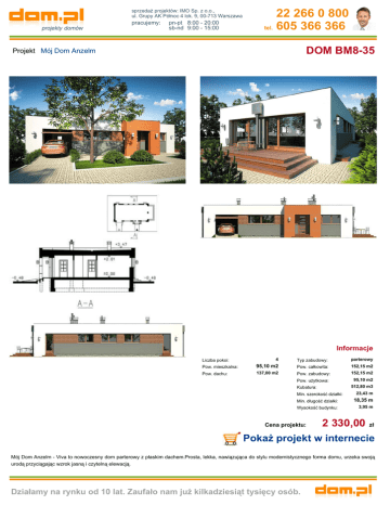 sprzedaż projektów: IMO Sp. z o.o., ul. Grupy AK Północ 4 lok. 9, 00-713 Warszawa pracujemy: pn-pt 8:00 - 20:00 sb-nd 9:00 - 15:00 22 266 0 800 tel. 605 366 366 DOM BM8-35 Projekt Mój Dom Anzelm Informacje 4 Typ zabudowy: parterowy Pow. mieszkalna: 95,10 m2 Pow. całkowita: 152,15 m2 Pow. dachu: 137,00 m2 Pow. zabudowy: 152,15 m2 Liczba pokoi: Pow. użytkowa: 95,10 m2 512,80 m3 Kubatura: Min. szerokość działki: 23,43 m Min. długość działki: 18,35 m Wysokość budynku: 3,95 m Cena projektu: 2 330,00 zł Pokaż projekt w internecie Mój Dom Anzelm - Viva to nowoczesny dom parterowy z płaskim dachem.Prosta, lekka, nawiązująca do stylu modernistycznego forma domu, urzeka swoją urodą przyciągając wzrok jasną i czytelną elewacją. Działamy na rynku od 10 lat. Zaufało nam już kilkadziesiąt tysięcy osób.