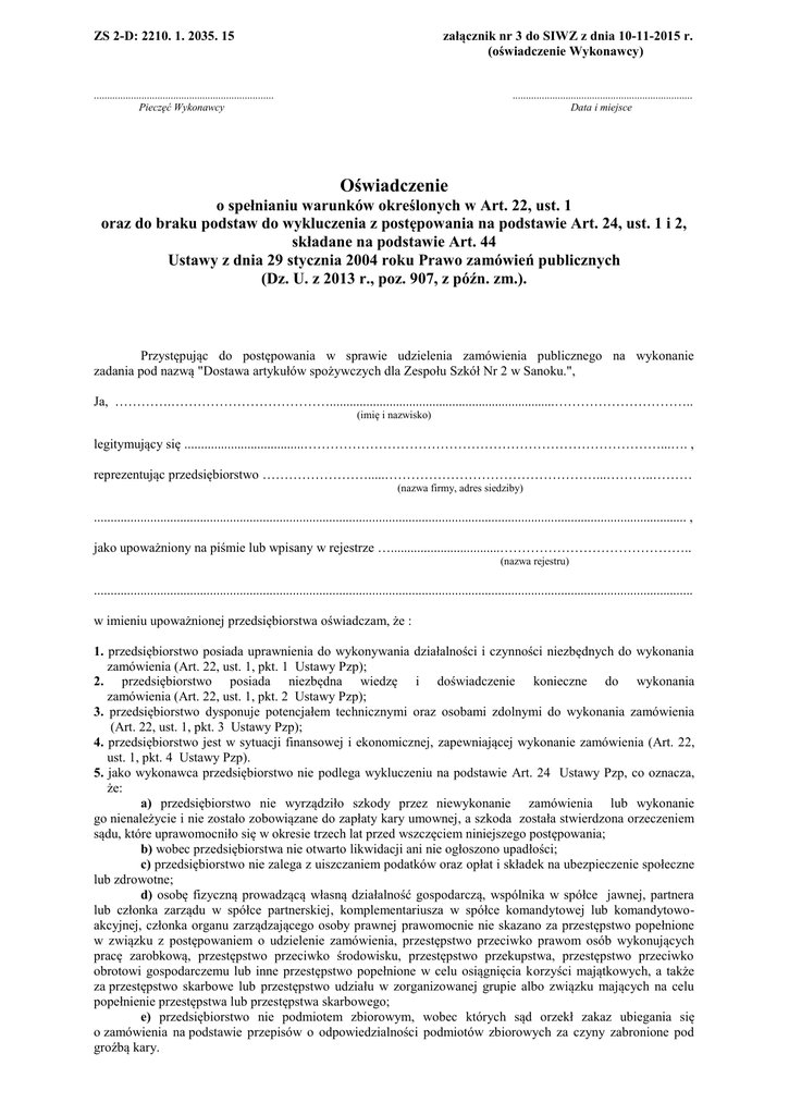 załącznik nr 3 do SIWZ z dnia 10-11-2015 r. (oświadczenie Wykonawcy) ZS 2-D: 2210. 1. 2035. 15 .................................................................... Pieczęć Wykonawcy .................................................................... Data i miejsce Oświadczenie o spełnianiu warunków określonych w Art. 22, ust. 1 oraz do braku podstaw do wykluczenia z postępowania na podstawie Art. 24, ust. 1 i 2, składane na podstawie Art. 44 Ustawy z dnia 29 stycznia 2004 roku Prawo zamówień publicznych (Dz. U. z 2013 r., poz. 907, z późn. zm.). Przystępując do postępowania w sprawie udzielenia zamówienia publicznego na wykonanie zadania pod nazwą "Dostawa artykułów spożywczych dla Zespołu Szkół Nr 2 w Sanoku.", Ja, ………….………………………………....................................................................………………………….. (imię i nazwisko) legitymujący się ....................................………………………………………………………………………...…. , reprezentując przedsiębiorstwo …………………….....…………………………………………...………..……… (nazwa firmy, adres siedziby) ................................................................................................................................................................................... , jako upoważniony na piśmie lub wpisany w rejestrze ….................................…………………………………….. (nazwa rejestru) ..................................................................................................................................................................................... w imieniu upoważnionej przedsiębiorstwa oświadczam, że : 1. przedsiębiorstwo posiada uprawnienia do wykonywania działalności i czynności niezbędnych do wykonania zamówienia (Art. 22, ust. 1, pkt. 1 Ustawy Pzp); 2. przedsiębiorstwo posiada niezbędna wiedzę i doświadczenie konieczne do wykonania zamówienia (Art. 22, ust. 1, pkt. 2 Ustawy Pzp); 3. przedsiębiorstwo dysponuje potencjałem technicznymi oraz osobami zdolnymi do wykonania zamówienia (Art. 22, ust. 1, pkt. 3 Ustawy Pzp); 4. przedsiębiorstwo jest w sytuacji finansowej i ekonomicznej, zapewniającej wykonanie zamówienia (Art. 22, ust. 1, pkt. 4 Ustawy Pzp). 5. jako wykonawca przedsiębiorstwo nie podlega wykluczeniu na podstawie Art. 24 Ustawy Pzp, co oznacza, że: a) przedsiębiorstwo nie wyrządziło szkody przez niewykonanie zamówienia lub wykonanie go nienależycie i nie zostało zobowiązane do zapłaty kary umownej, a szkoda została stwierdzona orzeczeniem sądu, które uprawomocniło się w okresie trzech lat przed wszczęciem niniejszego postępowania; b) wobec przedsiębiorstwa nie otwarto likwidacji ani nie ogłoszono upadłości; c) przedsiębiorstwo nie zalega z uiszczaniem podatków oraz opłat i składek na ubezpieczenie społeczne lub zdrowotne; d) osobę fizyczną prowadzącą własną działalność gospodarczą, wspólnika w spółce jawnej, partnera lub członka zarządu w spółce partnerskiej, komplementariusza w spółce komandytowej lub komandytowoakcyjnej, członka organu zarządzającego osoby prawnej prawomocnie nie skazano za przestępstwo popełnione w związku z postępowaniem o udzielenie zamówienia, przestępstwo przeciwko prawom osób wykonujących pracę zarobkową, przestępstwo przeciwko środowisku, przestępstwo przekupstwa, przestępstwo przeciwko obrotowi gospodarczemu lub inne przestępstwo popełnione w celu osiągnięcia korzyści majątkowych, a także za przestępstwo skarbowe lub przestępstwo udziału w zorganizowanej grupie albo związku mających na celu popełnienie przestępstwa lub przestępstwa skarbowego; e) przedsiębiorstwo nie podmiotem zbiorowym, wobec których sąd orzekł zakaz ubiegania się o zamówienia na podstawie przepisów o odpowiedzialności podmiotów zbiorowych za czyny zabronione pod groźbą kary. f) przedsiębiorstwo nie jest Wykonawcą, który wykonywał bezpośrednio czynności związane z przygotowaniem prowadzonego postępowania lub posługiwał się w celu sporządzenia oferty osobami uczestniczącymi w dokonywaniu tych czynności; g) przedsiębiorstwo nie złożyło nieprawdziwych informacji mających wpływ lub mogących mieć wpływ na wynik prowadzonego postępowania. 6. Na każde żądanie Zamawiającego dostarczę niezwłocznie odpowiednie dokumenty potwierdzające prawdziwość każdej z kwestii zawartej w oświadczeniu; 7. Zapoznaliśmy się ze Specyfikacją Istotnych Warunków Zamówienia oraz Załącznikami do SIWZ (a w tym projektem umowy) i akceptujemy je bez jakichkolwiek zastrzeżeń. 8. Wyrażam zgodę na zakup towarów u innego dostawcy na mój koszt w przypadku, gdy nie dostarczę Zamawiającemu zamówionego towaru w terminie określonym Umową o dostawy w postępowaniu z dnia 10-11-2015 r. Podstawą do takiego działania będzie protokół reklamacyjny Zamawiającego stwierdzający brak dostawy zamówionego towaru. ………………….................................................... podpis