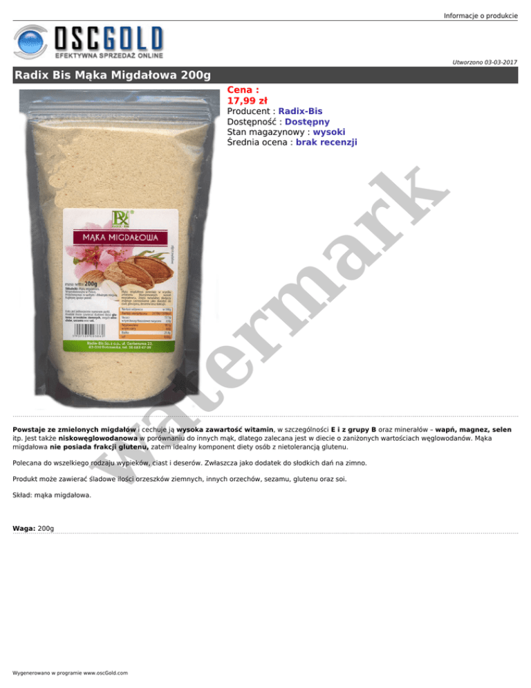 Informacje o produkcie Utworzono 03-03-2017 Radix Bis Mąka Migdałowa 200g Cena : 17,99 zł at er m ar k Producent : Radix-Bis Dostępność : Dostępny Stan magazynowy : wysoki Średnia ocena : brak recenzji w Powstaje ze zmielonych migdałów i cechuje ją wysoka zawartość witamin, w szczególności E i z grupy B oraz minerałów – wapń, magnez, selen itp. Jest także niskowęglowodanowa w porównaniu do innych mąk, dlatego zalecana jest w diecie o zaniżonych wartościach węglowodanów. Mąka migdałowa nie posiada frakcji glutenu, zatem idealny komponent diety osób z nietolerancją glutenu. Polecana do wszelkiego rodzaju wypieków, ciast i deserów. Zwłaszcza jako dodatek do słodkich dań na zimno. Produkt może zawierać śladowe ilości orzeszków ziemnych, innych orzechów, sezamu, glutenu oraz soi. Skład: mąka migdałowa. Waga: 200g Wygenerowano w programie www.oscGold.com