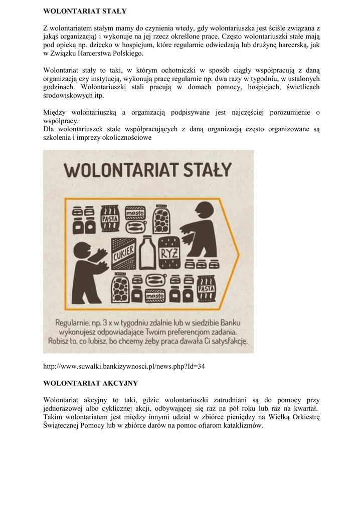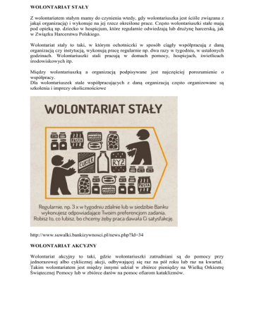 WOLONTARIAT STAŁY Z wolontariatem stałym mamy do czynienia wtedy, gdy wolontariuszka jest ściśle związana z jakąś organizacją) i wykonuje na jej rzecz określone prace. Często wolontariuszki stałe mają pod opieką np. dziecko w hospicjum, które regularnie odwiedzają lub drużynę harcerską, jak w Związku Harcerstwa Polskiego. Wolontariat stały to taki, w którym ochotniczki w sposób ciągły współpracują z daną organizacją czy instytucją, wykonują pracę regularnie np. dwa razy w tygodniu, w ustalonych godzinach. Wolontariuszki stali pracują w domach pomocy, hospicjach, świetlicach środowiskowych itp. Między wolontariuszką a organizacją podpisywane jest najczęściej porozumienie o współpracy. Dla wolontariuszek stale współpracujących z daną organizacją często organizowane są szkolenia i imprezy okolicznościowe http://www.suwalki.bankizywnosci.pl/news.php?Id=34 WOLONTARIAT AKCYJNY Wolontariat akcyjny to taki, gdzie wolontariuszki zatrudniani są do pomocy przy jednorazowej albo cyklicznej akcji, odbywającej się raz na pół roku lub raz na kwartał. Takim wolontariatem jest między innymi udział w zbiórce pieniędzy na Wielką Orkiestrę Świątecznej Pomocy lub w zbiórce darów na pomoc ofiarom kataklizmów. http://www.bankizywnosci.pl/38-n-81/archiwum/koncert-gwiazd-podziel-sie-posilkiem-wbydgoszczy.html WOLONTARIAT ZAGRANICZNY Wolontariat zagraniczny / europejski (EVS) , jak sama nazwa wskazuje dotyczy pracy wolontariuszki za granicą, nie tylko w państwach Uni Europejskiej, ale także w krajach partnerskich, i to nie tylko z Europy! W ramach wolontariatu zagranicznego przeprowadzane są międzynarodowe wymiany wolontariuszek. W zamian za pracę na rzecz goszczących organizacji otrzymujemy zakwaterowanie, wyżywienie oraz kieszonkowe i kurs języka urzędowego kraju w jakim świadczymy pomoc. Workcampy- nazwą tą określa się kilkutygodniowe projekty, w ramach których międzynarodowa grupa wolontariuszek wykonuje prace na rzecz społeczności lokalnej, np. sadzi drzewa, stawia płoty, pracuje z dziećmi oraz z ludźmi starszymi. Wolontariuszki muszą wypracować określoną ilość godzin; często jest to pełne osiem godzin pracy. W zamian otrzymują zakwaterowanie i wyżywienie. Workcampy często organizowane są w bardzo atrakcyjnych miejscach. Misje - Organizowaniem wyjazdów misyjnych zajmuje się między innymi Polska Akcja Humanitarna. Wolontariuszki pracują tam w miejscowych domach dziecka, prowadzą półkolonie i grupy terapeutyczne. Są to często fachowczynie z różnych dziedzin, m.in. lekarki, psycholożki, informatyczki. http://studia.dlastudenta.pl/artykul/Wyjedz_na_wolontariat_zagraniczny,65580.html WOLONTARIAT INTERNETOWY Bardzo specyficzną, ale jak najbardziej godną polecenia formą pracy wolontariackiej jest wolontariat internetowy. Poświęcając kilka minut dziennie i bez wychodzenia z domu można naprawdę wiele zdziałać. Wystarczy wejść na specjalna stronę internetową i kliknąć w banerek. W zamian za takie kliknięcie sponsorzy/ki (najczęściej firmy) przekazują pieniądze na szczytny cel. W zależności od akcji i odbiorców, mogą to być: • • • • dofinansowania na posiłki dla dzieci, jak w przypadku Pajacyka www.pajacyk.pl, pomocy charytatywnej dla potrzebujących, jaką zajmuje się Ogólnopolska Akcja Charytatywna OKRUSZEK www.okruszek.org.pl, pomoc w budowaniu domów dla niezamożnych rodzin, jaką prowadzi Habitat for Humanisty www.habitat.pl i wiele innych. Wolontariat internetowy to nie tylko klikanie. Równie dobrze możemy pomagać na odległość, na przykład udzielając specjalistycznych porad na forach, wykonując jakąś prezentację czy tłumacząc teksty. http://ngo.powiat.tczew.pl/wolontariat-rodzaje-wolontariatu/wolontariat-rodzaje-wolontariatu.html http://sp.zswerbkowice.eu/aktualnosci/pajacyk