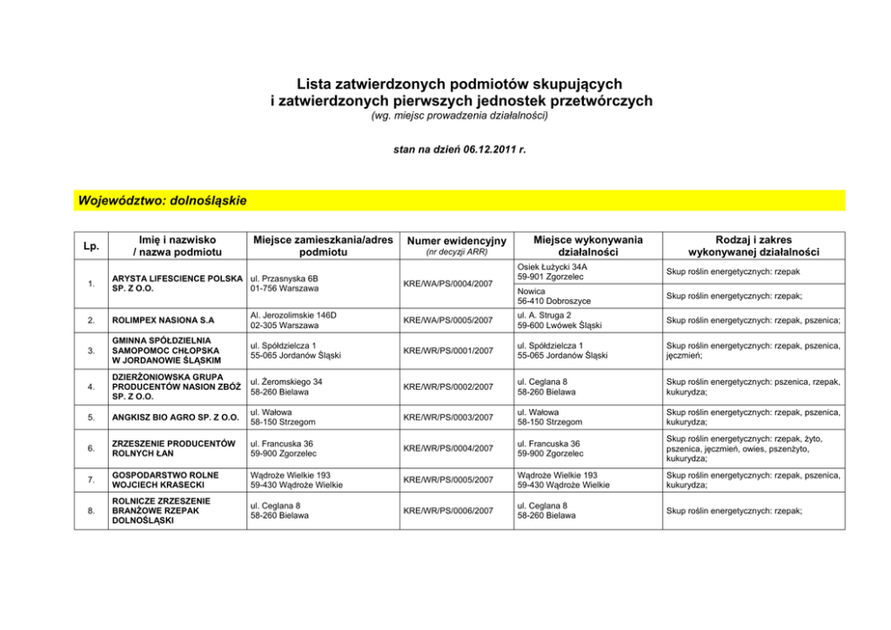 Lista zatwierdzonych podmiotów skupujących i zatwierdzonych pierwszych jednostek przetwórczych (wg. miejsc prowadzenia działalności) stan na dzień 06.12.2011 r. Województwo: dolnośląskie Lp. 1. Imię i nazwisko / nazwa podmiotu Miejsce zamieszkania/adres podmiotu ARYSTA LIFESCIENCE POLSKA ul. Przasnyska 6B SP. Z O.O. 01-756 Warszawa Numer ewidencyjny (nr decyzji ARR) KRE/WA/PS/0004/2007 Miejsce wykonywania działalności Rodzaj i zakres wykonywanej działalności Osiek Łużycki 34A 59-901 Zgorzelec Skup roślin energetycznych: rzepak Nowica 56-410 Dobroszyce Skup roślin energetycznych: rzepak; 2. ROLIMPEX NASIONA S.A Al. Jerozolimskie 146D 02-305 Warszawa KRE/WA/PS/0005/2007 ul. A. Struga 2 59-600 Lwówek Śląski Skup roślin energetycznych: rzepak, pszenica; 3. GMINNA SPÓŁDZIELNIA SAMOPOMOC CHŁOPSKA W JORDANOWIE ŚLĄSKIM ul. Spółdzielcza 1 55-065 Jordanów Śląski KRE/WR/PS/0001/2007 ul. Spółdzielcza 1 55-065 Jordanów Śląski Skup roślin energetycznych: rzepak, pszenica, jęczmień; 4. DZIERŻONIOWSKA GRUPA PRODUCENTÓW NASION ZBÓŻ SP. Z O.O. ul. Żeromskiego 34 58-260 Bielawa KRE/WR/PS/0002/2007 ul. Ceglana 8 58-260 Bielawa Skup roślin energetycznych: pszenica, rzepak, kukurydza; 5. ANGKISZ BIO AGRO SP. Z O.O. ul. Wałowa 58-150 Strzegom KRE/WR/PS/0003/2007 ul. Wałowa 58-150 Strzegom Skup roślin energetycznych: rzepak, pszenica, kukurydza; 6. ZRZESZENIE PRODUCENTÓW ROLNYCH ŁAN ul. Francuska 36 59-900 Zgorzelec KRE/WR/PS/0004/2007 ul. Francuska 36 59-900 Zgorzelec Skup roślin energetycznych: rzepak, żyto, pszenica, jęczmień, owies, pszenżyto, kukurydza; 7. GOSPODARSTWO ROLNE WOJCIECH KRASECKI Wądroże Wielkie 193 59-430 Wądroże Wielkie KRE/WR/PS/0005/2007 Wądroże Wielkie 193 59-430 Wądroże Wielkie Skup roślin energetycznych: rzepak, pszenica, kukurydza; 8. ROLNICZE ZRZESZENIE BRANŻOWE RZEPAK DOLNOŚLĄSKI ul. Ceglana 8 58-260 Bielawa KRE/WR/PS/0006/2007 ul. Ceglana 8 58-260 Bielawa Skup roślin energetycznych: rzepak; ul. Rudnowska 76 67-200 Głogów Skup roślin energetycznych: rzepak, pszenica, jęczmień, żyto, owies, pszenżyto, kukurydza, słonecznik; ul. Grunwaldzka 8 59-500 Złotoryja Skup roślin energetycznych: rzepak, pszenica, jęczmień, żyto, owies, pszenżyto, kukurydza, słonecznik; ul. Kolejowa 25 55-081 Mietków Skup roślin energetycznych: rzepak, pszenica, kukurydza; ul. Norwida 5 55-080 Kąty Wrocławskie Skup roślin energetycznych: rzepak, pszenica, kukurydza; OSADKOWSKI-CEBULSKI SP. Z O.O. ul. Nasienna 6 59-220 Legnica 10. MIECZYSŁAW KORKUŚ FIRMA HANDLOWO-USŁUGOWA KOMEX ul. Nowowiejska 2a 55-080 Kąty Wrocławskie KRE/WR/PS/0008/2007 11. AMBROŻY SP. Z O.O. ul. Namysłowska 21 56-420 Bierutów KRE/WR/PS/0009/2007 ul. Słoneczna 9 56-504 Dziadowa Kłoda Skup roślin energetycznych: rzepak, zboża, kukurydza; 12. PHPU AGRO-MAT ANDRZEJ TRACZ Braszowice 4B 57-200 Ząbkowice Śląskie KRE/WR/PJP/0008/2007 Braszowice 4B 57-200 Ząbkowice Śląskie Skup roślin energetycznych: pszenica, żyto, owies, jęczmień, kukurydza, rzepak. Produkcja oleju rzepakowego. 13. PRYWATNE PUH HERIM R. PŁÓCIENNIK, H. RAFAŁOWICZ SP.J. ul. Kolejowa 39 55-081 Mietków KRE/WR/PS/0012/2007 ul. Kolejowa 39 55-081 Mietków Skup roślin energetycznych: rzepak, kukurydza; 14. SPÓŁDZIELNIA KÓŁEK ROLNICZYCH ul. ul. Spółdzielcza 4 55-080 Kąty Wrocławskie KRE/WR/PS/0013/2007 ul. Spółdzielcza 4-6 55-080 Kąty Wrocławskie Skup roślin energetycznych: rzepak, jęczmień, pszenica, kukurydza; 15. CENTRALA NASIENNA SP. Z O.O. ul. Żytnia 1 55-300 Środa Śląska KRE/WR/PS/0014/2007 ul. Żytnia 1 55-300 Środa Śląska Skup roślin energetycznych: kukurydza, pszenica, żyto, jęczmień, owies; ul. 3-go Maja 61 55-200 Oława Skup roślin energetycznych: kukurydza, rzepak, pszenica, żyto, jęczmień, owies; 16. PPH PINIO RENATA JASTRZĘBSKA Lutomia Dolna 76 58-100 Świdnica KRE/WR/PS/0015/2007 Lutomia Dolna 76 58-100 Świdnica Skup roślin energetycznych: wierzba energetyczna; 17. DOLNOŚLĄSKIE MŁYNY S.A. Ujazd Górny 22a 55-340 Udanin KRE/WR/PS/0016/2007 Ujazd Górny 22a 55-340 Udanin Skup roślin energetycznych: pszenica, rzepak; 18. ROLNICZE PRZEDSIĘBIORSTWO PRODUKCYJNO-HANDLOWE ZIĘBICE SP. Z O.O. ul. Wojska Polskiego 15 57-220 Ziębice KRE/WR/PS/0017/2007 Kalinowice Dolne 57-220 Ziębice Skup roślin energetycznych: rzepak, pszenica, kukurydza; ul. Bolesława Chrobrego 15 57-220 Ziębice Skup roślin energetycznych: rzepak, pszenica, kukurydza; PPHU AGROL SP Z O.O. Bobolice 9 57-200 Ząbkowice Śląskie Tomice 1 57-200 Ząbkowice Śląskie Skup roślin energetycznych: rzepak, pszenica, kukurydza, buraki cukrowe; Bobolice 9 57-200 Ząbkowice Śląskie Skup roślin energetycznych: rzepak, pszenica, kukurydza, buraki cukrowe; 9. 19. KRE/WR/PS/0007/2007 KRE/WR/PS/0018/2007 20. 21. 22. 23. 24. 25. 26. OSADKOWSKI S.A. BIOESTRY SP. Z O.O. PRZEDSIĘBIORSTWO HANDLOWO – ZAOPATRZENIOWE ZAPROL SP. Z O.O. PHU AGRO-PLUS TADEUSZ STADNIK PRZEDSIĘBIORSTWO PRODUKCJI HANDLU I USŁUG PLON W ORSKU SP. Z O.O. PRPHU GOPASZ SP Z O.O. PRUH HODROL SP. Z O.O. ul. Kolejowa 6 56-420 Bierutów ul. Wincentego Witosa 7 56-200 Góra ul. Jaworzyńska 258 59-220 Legnica Małuszów 61 59-424 Męcinka Orsk 11D 59-305 Rudna KRE/WR/PS/0019/2007 KRE/WR/PS/0020/2007 KRE/WR/PS/0021/2007 KRE/WR/PS/0022/2007 KRE/WR/PJP/0001/2007 ul. Wojska Polskiego 37 56-300 Milicz KRE/WR/PJP/0002/2007 Żabice 52 59-140 Chocianów KRE/WR/PJP/0003/2007 ul. Kaszycka 3 55-110 Prusice Skup roślin energetycznych: rzepak, pszenica, żyto, jęczmień, owies, kukurydza; ul. Kopernika 37 58-100 Świdnica Skup roślin energetycznych: rzepak, pszenica, żyto, jęczmień, owies, kukurydza; Górzec 14 57-100 Strzelin Skup roślin energetycznych: rzepak, pszenica, żyto, jęczmień, owies, kukurydza; ul. Krzywoustego 29 56-400 Oleśnica Skup roślin energetycznych: rzepak, pszenica, żyto, jęczmień, owies, kukurydza; ul. Długa 20 57-150 Kondratowice Skup roślin energetycznych: rzepak, pszenica, żyto, 