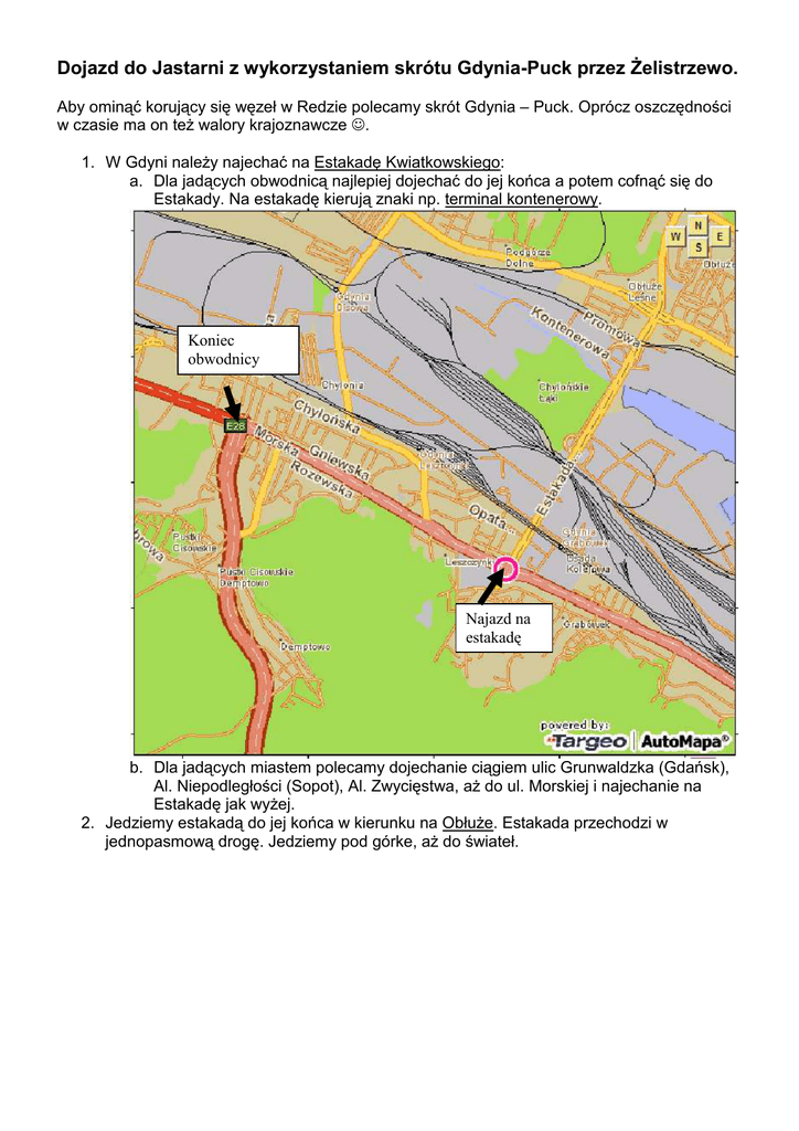 Dojazd do Jastarni z wykorzystaniem skrótu Gdynia-Puck przez śelistrzewo. Aby ominąć korujący się węzeł w Redzie polecamy skrót Gdynia – Puck. Oprócz oszczędności w czasie ma on teŜ walory krajoznawcze ☺. 1. W Gdyni naleŜy najechać na Estakadę Kwiatkowskiego: a. Dla jadących obwodnicą najlepiej dojechać do jej końca a potem cofnąć się do Estakady. Na estakadę kierują znaki np. terminal kontenerowy. Koniec obwodnicy Najazd na estakadę b. Dla jadących miastem polecamy dojechanie ciągiem ulic Grunwaldzka (Gdańsk), Al. Niepodległości (Sopot), Al. Zwycięstwa, aŜ do ul. Morskiej i najechanie na Estakadę jak wyŜej. 2. Jedziemy estakadą do jej końca w kierunku na ObłuŜe. Estakada przechodzi w jednopasmową drogę. Jedziemy pod górke, aŜ do świateł. 3. Skręcamy w lewo, droga zamienia się w dwupasmową i jedziemy do jej końca 4. Skręcamy w prawo 3. Na światłach w lewo 4. A następnie skręcamy w prawo i jedziemy w kierunku Kosakowa. 6. w prawo 5. w lewo 4 5. W Kosakowie skręcamy na pierwszym skrzyŜowaniu w lewo 6. Po ok. 300m skręcamy w prawo zgodnie z kierunkowskazem „Cmentarz Komunalny” 7. Po lewej mijamy cmentarz i jedziemy do końca drogi. Skręcamy w lewo. 8. skręt w prawo – Puck 15 km 7. w lewo 6 . 5 . 8. Jedziemy ok. 700m, poczym zacznają się płyty betonowe. Jedzimy po nich ok. 300m, skręcamy w prawo zgodnie ze znakiem Puck 15km. 9. WjeŜdŜamy na drogę z duŜą ilością mostków. NaleŜy na nich zwalniać. Inaczej grozi nam efektowny wyskok niczym na rajdach WRC a nasze łódki zostaną statkami powietrznymi ☺. Jedziemy wzdłuŜ głównej drogi przez miejscowości Betlejem, Smolno. WjeŜdŜamy do śelistrzewa. 10. W miejscowości śelistrzewo skręcamy w prawo a za przejazdem kolejowym w lewo zgodnie z główną drogą. 10 11. DojeŜdŜamy do Pucka, gdzie na pierwszym rondzie skręcamy w lewo a następnie kierujemy się wg. znaków do Władysławowa. Gdzie znajduje się port Jachtowy w Jastarni oraz Biuro regat? - Port jachtowy znajduje się przy głównej drodze Władysławowo Hel. - Biuro regat znajduje się w niebieskim kontenerze zaraz u wjazdu do Portu Jachtowego.