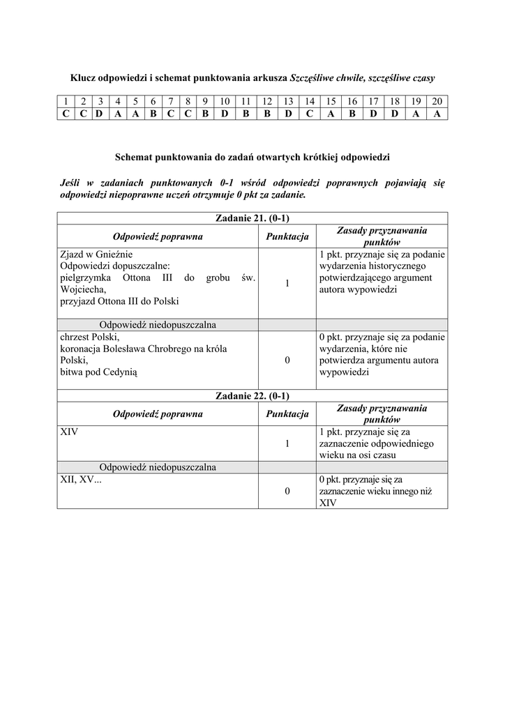 Klucz odpowiedzi i schemat punktowania arkusza Szczęśliwe chwile, szczęśliwe czasy 1 C 2 3 C D 4 A 5 A 6 B 7 8 9 C C B 10 D 11 B 12 B 13 D 14 C 15 A 16 B 17 D 18 D 19 A 20 A Schemat punktowania do zadań otwartych krótkiej odpowiedzi Jeśli w zadaniach punktowanych 0-1 wśród odpowiedzi poprawnych pojawiają się odpowiedzi niepoprawne uczeń otrzymuje 0 pkt za zadanie. Zadanie 21. (0-1) Odpowiedź poprawna Zjazd w Gnieźnie Odpowiedzi dopuszczalne: pielgrzymka Ottona III do Wojciecha, przyjazd Ottona III do Polski Punktacja grobu Odpowiedź niedopuszczalna chrzest Polski, koronacja Bolesława Chrobrego na króla Polski, bitwa pod Cedynią św. 1 0 Zasady przyznawania punktów 1 pkt. przyznaje się za podanie wydarzenia historycznego potwierdzającego argument autora wypowiedzi 0 pkt. przyznaje się za podanie wydarzenia, które nie potwierdza argumentu autora wypowiedzi Zadanie 22. (0-1) Odpowiedź poprawna Punktacja XIV 1 Odpowiedź niedopuszczalna XII, XV... 0 Zasady przyznawania punktów 1 pkt. przyznaje się za zaznaczenie odpowiedniego wieku na osi czasu 0 pkt. przyznaje się za zaznaczenie wieku innego niż XIV Zadanie 23. (0-1) Odpowiedź poprawna Punktacja „Był to zarazem czas budowania naszego parlamentaryzmu i naszego znaczenia w gospodarce Europy”’ „Polska jagiellońska była gospodarce europejskiej potrzebna”, „dynastia kierująca moją ojczyzną panuje również na Litwie, w Czechach, na Węgrzech, włada Pomorzem Gdańskim…” „Witano by mnie wtedy na dworach panów europejskich z największą rewerencją, bo widziano by we mnie przedstawiciela jagiellońskiego Commonwealthu…” Odpowiedź niedopuszczalna Np. Witano by mnie wtedy na dworach z największą rewerencją. Dynastia Jagiellonów panowała w całej Europie. 1 0 Zasady przyznawania punktów 1 pkt. przyznaje się za wypisanie 3 różnych argumentów Uwaga! Uczeń może podać argumenty własnymi słowami pod warunkiem, że oddają one sens wypowiedzi autora. 0 pkt. przyznaje się za: – wypisanie fragmentów niebędących argumentami – podanie własnymi słowami informacji nieoddających sensu wypowiedzi autora Zadanie 24. (0-1) Odpowiedź poprawna Np. Od tej pory Polska nieustannie rozwijała się. Od tej pory Polska nieustannie umacniała się. Odpowiedź dopuszczalna: ”Szła do przodu” – bardzo szybko rozwijała się Odpowiedź niedopuszczalna Np. Polska od tej pory będzie nieustannie szła do przodu. Od tej pory Polska nieustannie podążała naprzód Od tej pory Polska nieustannie zmieniała się. Punktacja 1 0 Zasady przyznawania punktów 1 pkt. przyznaje się za zastąpienie potocznego zwrotu oficjalnym oddającym sens wypowiedzi autora 0 pkt. przyznaje się za: – brak zastąpienia zwrotu potocznego oficjalnym – zastąpienie zwrotu potocznego oficjalnym zmieniającym sens wypowiedzi autora Zadanie 25. (0-1) Odpowiedź poprawna Punktacja Po II wojnie światowej (współczesnych), Kazimierza Wielkiego, XV w. 1 Odpowiedź niedopuszczalna Np. Z dalszego okresu, Kazimierza Wielkiego, XIV w... 0 Zasady przyznawania punktów 1 pkt. przyznaje się za uzupełnienie luk odpowiednimi informacjami z map konturowych. 0 pkt. za uzupełnienie tekstu informacjami niewynikającymi z map. Zadanie 26. (0-1) Odpowiedź poprawna Np. Kwiecie miłe i piękne – przyjemność, zabawa, zachwyt, euforia, szczęście, bohater przeżywał miłe i spokojne chwile..., Kwiecie jadowite – zło, zagrożenie, niebezpieczeństwo, brzydota, bohater przeżywał złe chwile..., Odpowiedź niedopuszczalna Np. Kwiecie miłe i piękne – ukochana ojczyzna, możliwość lepszego życia, Kwiecie jadowite – brak tolerancji, niebezpieczeństwo czyhające na Polaków , Punktacja 1 0 Zasady przyznawania punktów 1 pkt przyznaje się za wyjaśnienie znaczenia poszczególnych elementów obrazu, dopuszcza się także opisowe wyjaśnienie znaczenia poszczególnych elementów obrazu 0 pkt. przyznaje się za wyjaśnienie sprzeczne z wymową przytoczonego fragmentu. Zadanie 27. (0-3) KRYTERIA OCENY DEDYKACJI lp. kryterium punktacja zasady przydzielania punktów 1. Realizacja tematu. 0–1 4. Poprawność językowa. 0–1 5. Poprawność zapisu. 0–1 1 pkt przyznaje się za wskazanie adresata, nadawcy, określenie miejsca, czasu (wystarczy rok) oraz celu (z jakiej okazji?) i przyczyny ( wskazanie cech książki lub adresata dedykacji). 1 pkt przyznaje się za poprawność frazeologiczna, fleksyjną, składniową. 1 pkt przyznaje się za poprawność ortograficzną i interpunkcyjną. Łącznie: 3 punkty lp. KRYTERIA OCENY DEDYKACJI dla uczniów ze specyficznymi trudnościami w uczeniu się kryterium punktacja zasady przydzielania punktów 1. Realizacja tematu. 0–1 4. Poprawność językowa. 0–1 5. Poprawność zapisu. 0–1 Łącznie: 3 punkty 1 pkt przyznaje się za wskazanie adresata, nadawcy, określenie miejsca, czasu (wystarczy rok) oraz celu (z jakiej okazji?) i przyczyny (wskazanie cech książki lub adresata dedykacji). 1 pkt przyznaje się za poprawność frazeologiczna, fleksyjną, składniową. 1 pkt przyznaje się za poprawność ortograficzną i interpunkcyjną (dopuszcza się 1 błąd ortograficzny i 1 błąd interpunkcyjny). Zadanie 28. (0-5) KRYTERIA OCENY OGŁOSZENIA lp. kryterium punktacja zasady przydzielania punktów 1. Realizacja tematu. 0–1 2. Dostosowanie wypowiedzi do sytuacji komunikacyjnej. 0–1 3. Kompozycja wypowiedzi. 0–1 4. Poprawność językowa. 0–1 5. Poprawność zapisu. 0–1 1 pkt przyznaje się za wskazanie nadawcy, celu, czasu i miejsca (dopuszcza się niedokładne określenie miejsca, np. brak podania numeru sali). 1 pkt przyznaje się za dostosowanie wypowiedzi do sytuacji komunikacyjnej (przewaga informacji nad perswazją). 1 pkt przyznaje się za odpowiedni dla ogłoszenia układ graficzny treści (wyróżniony adresat i nadawca). 1 pkt przyznaje się za poprawność językową (dopuszcza się 1 błąd). 1 pkt przyznaje się za poprawność ortograficzną i interpun