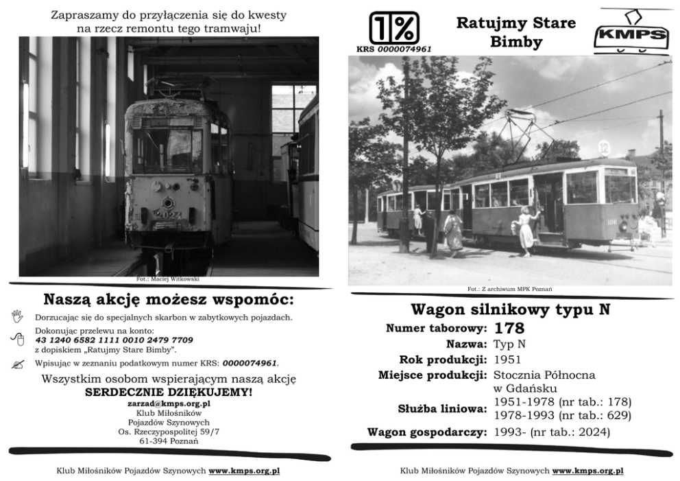 Zapraszamy do przyłączenia się do kwesty na rzecz remontu tego tramwaju! KRS 0000074961 Ratujmy Stare Bimby Fot.: Maciej Witkowski Naszą akcję możesz wspomóc: Dorzucając się do specjalnych skarbon w zabytkowych pojazdach. Dokonując przelewu na konto: 43 1240 6582 1111 0010 2479 7709 z dopiskiem „Ratujmy Stare Bimby”. Wpisując w zeznaniu podatkowym numer KRS: 0000074961. Wszystkim osobom wspierającym naszą akcję SERDECZNIE DZIĘKUJEMY! [email protected] Klub Miłośników Pojazdów Szynowych Os. Rzeczypospolitej 59/7 61-394 Poznań Klub Miłośników Pojazdów Szynowych www.kmps.org.pl Fot.: Z archiwum MPK Poznań Wagon silnikowy typu N Numer taborowy: 178 Nazwa: Typ N Rok produkcji: 1951 Miejsce produkcji: Stocznia Północna w Gdańsku 1951-1978 (nr tab.: 178) Służba liniowa: 1978-1993 (nr tab.: 629) Wagon gospodarczy: 1993- (nr tab.: 2024) Klub Miłośników Pojazdów Szynowych www.kmps.org.pl Historia tramwaju Wagon silnikowy N o numerze taborowym 178, został wyprodukowany w gdańskiej Stoczni Północnej. W tym samym roku został przekazany do Poznania i otrzymał numer taborowy 178. Na przełomie lat 60-tych i 70-tych XX wieku przeszedł remont połączony z przebudową na jednostronny – drzwi pozostawiono na jednym boku, jednak przerobione na dwudzielne rozsuwane, napędzane przezwojonym elektrycznym silnikiem z ręcznej wiertarki. Pozostał jednak dwukierunkowy, tzn. stanowiska sterownicze zachowano na obydwu końcach wagonu. Takie rozwiązanie pozwoliło na wykorzystywanie tramwaju w ruchu wahadłowym po jednym torze, zarówno pojedynczo jak i w zestawieniu trzywagonowym, w którym w jednym kierunku jechał jako ostatni, a w drodze powrotnej jako pierwszy z możliwością sterowania z „tylnego pulpitu”, drzwi miał wtedy z lewej strony. Od roku 1993, po wycofaniu z ruchu liniowego służył jako holownik o numerze taborowym 2024 w zajezdni tramwajowej przy ulicy Gajowej. Fot.: z archiwum MPK Poznań Dlaczego warto wyremontować eNa? Przeprowadzenie renowacji i odbudowy zabytkowego tramwaju typu N pozwoli na ponowne przywrócenie go do ruchu na poznańskich torowiskach. Stanowić będzie „żywy eksponat muzealny” przypominający historię poznańskich tramwajów. Wyremontowany tramwaj będzie dostępny dla ogółu społeczeństwa – korzystanie i zwiedzanie możliwe będzie podczas licznych imprez otwartych organizowanych przez Miejskie Przedsiębiorstwo Komunikacyjne w Poznaniu Sp. z o.o. przy współudziale stowarzyszenia Klub Miłośników Pojazdów Szynowych oraz w formie uczestnictwa w przejazdach turystycznych i wycieczkach tematycznych. Jednocześnie tramwaj byłyby świetnym uzupełnieniem szeregu wydarzeń miejskich, uroczystości oraz rocznic historycznych związanych z komunikacją miejską w Poznaniu. Byłby atrakcją weekendowych kursów linii turystycznych nr 0 jeżdżącej w okresie od maja do września. Na pokładzie wyremontowanego tramwaju obsługę pełnić będą konduktorzy w historycznych mundurach – członkowie Klubu Miłośników Pojazdów Szynowych. Stowarzyszenie od szeregu lat organizuje liczne imprezy komunikacyjne przyciągające mieszkańców Poznania, a także pasjonatów historii komunikacji miejskiej z innych miast Polski i Europy. Imprezy takie jak: „Katarzynka" (święto patronki tramwajarzy Św. Katarzyny), czy "Świąteczna Bimba", na stałe wpisały się już w kalendarz wydarzeń kulturalnych Poznania. Rysunek tramwaju Przywrócenie tramwaju do ruchu Należy odtworzyć we właściwych miejscach wszystkie cztery otwory drzwiowe oraz płaty drzwi wraz z prowadnicami i zamkami, wykrój okien, świetliki tablic kierunkowych. Należy zainstalować oświetlenie zewnętrzne zasilane z wysokiego napięcia (żarówki łączone szeregowo) – okrągłe reflektory i światła pozycyjne, kierunkowskazy boczne nie migowe Fot.: Maciej Witkowski Tramwaj wymaga odbudowy oraz dzwonki mechaniczne, wyciez odtworzeniem stanu zgodnego raczki szyb czołowych o napędzie z czasów produkcji. Remontowi podlega ręcznym oraz pantograf nożycowy stalowa konstrukcja pudła wraz starego typu. będzie dwukierunkowy z wózkami oraz odtworzenie wnętrza wa- Tramwaj i dwustronny. gonu wykończonego drewnem. W 2008 roku, wagon został wpisany do ewidencji zabytków ruchomych. Znajduje się w hali zajezdni tramwajowej przy ulicy Madalińskiego i jest własnością Miejskiego Przedsiębiorstwa Komunikacyjnego w Poznaniu Sp. z o.o. Klub Miłośników Pojazdów Szynowych www.kmps.org.pl Rys.: Rafał Jakubowski Klub Miłośników Pojazdów Szynowych www.kmps.org.pl