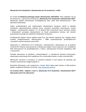 Miasteczko Firm Studentów i Absolwentów już 24 września br. w SGH W ramach XI Międzynarodowego Zjazdu Absolwentów SGH/SGPiS, który odbędzie się już 24 września br., zapraszamy Państwa do „Miasteczka Firm Studentów i Absolwentów SGH”. Miasteczko będzie prezentować Przedsiębiorczą SGH, obok SGH Merytorycznej i SGH Sportowo-Kulturalnej. Celem przedsięwzięcia jest zaoferowanie absolwentom biorącym udział w Zjeździe możliwości zaprezentowania własnej firmy, poznanie pomysłów biznesowych swoich kolegów – absolwentów studiów I, II i III stopnia SGH, stworzenie forum wymiany wiedzy i doświadczeń pomiędzy absolwentami na temat prowadzenia biznesu, jak również poszukiwanie synergii we wspólnych działaniach rynkowych. W Miasteczku będzie można spotkać wiele firm, jak również zapoznać się z bogatą ofertą studiów podyplomowych, doktoranckich i MBA proponowanych przedsiębiorcom i wszystkim zainteresowanym przez SGH. Aktywności w „Miasteczku Firm Studentów i Absolwentów” zaplanowane są na godziny 15.00-18.30. Podczas sesji plenarnej w Miasteczku będzie można zapoznać się z projektami SGH skierowanymi do przedsiębiorców, a także z planowanymi formami współpracy SGH z otoczeniem. Ponadto planowane są działania „networkingowe” o charakterze bardziej kuluarowym, obejmujące prezentację ofert współpracy firm uczestników Zjazdu, a także rozmowy B2B. Miasteczko wyrośnie w korytarzu na parterze budynku G (od wejścia do łącznika), jak również na przestrzeni całego budynku A. Pozostałe informacje o tym wydarzeniu i innych, które będą miały miejsce w SGH podczas Zjazdu, znajdziecie Państwo na stronie: http://zjazd.sgh.waw.pl/ 24 września 2016 r. bądźcie z nami w „Miasteczku Firm Studentów i Absolwentów SGH”! Naprawdę warto! Do zobaczenia!