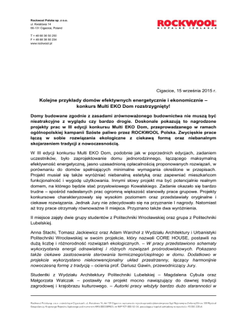 Cigacice, 15 września 2015 r. Kolejne przykłady domów efektywnych energetycznie i ekonomicznie – konkurs Multi EKO Dom rozstrzygnięty! Domy budowane zgodnie z zasadami zrównoważonego budownictwa nie muszą być nieatrakcyjne z wyglądu czy bardzo drogie. Doskonale pokazują to nagrodzone projekty prac w III edycji konkursu Multi EKO Dom, przeprowadzanego w ramach ogólnopolskiej kampanii Szóste paliwo przez ROCKWOOL Polska. Zwycięskie prace łączą w sobie rozwiązania ekologiczne z ciekawą formą oraz niebanalnym skojarzeniem tradycji z nowoczesnością. W III edycji konkursu Multi EKO Dom, podobnie jak w poprzednich edycjach, zadaniem uczestników, było zaprojektowanie domu jednorodzinnego, łączącego maksymalną efektywność energetyczną, jasno uzasadnioną opłacalnością proponowanych rozwiązań, w porównaniu do domów spełniających minimalne wymagania określone w przepisach. Projekt musiał się także wyróżniać niebanalną estetyką oraz zapewniać mieszkańcom funkcjonalność i wygodę użytkowania. Innymi słowy projekt ma być potencjalnie realnym domem, na którego będzie stać przysłowiowego Kowalskiego. Zadanie okazało się bardzo trudne – spośród nadesłanych prac ogromną większość stanowiły prace grupowe. Projekty konkursowe charakteryzowały się wysokim poziomem oraz przedstawiały oryginalne i ciekawe rozwiązania. Jednak Jury nie zdecydowało się na przyznanie I nagrody. Natomiast aż trzy prace otrzymały równoważne II miejsca. Przyznano także dwa wyróżnienia. II miejsce zajęły dwie grupy studentów z Politechniki Wrocławskiej oraz grupa z Politechniki Lubelskiej. Anna Stachi, Tomasz Jackiewicz oraz Adam Warchoł z Wydziału Architektury i Urbanistyki Politechniki Wrocławskiej w swoim projekcie, który nazwali CORE HOUSE, postawili na dużą liczbę i różnorodność rozwiązań ekologicznych. – W pracy przedstawiono schematy wykorzystania energii odnawialnej i różnych rozwiązań prośrodowiskowych. Pokazano także ciekawe zastosowanie sterowania termicznego/cieplnego w domu. Dodatkowo w projekcie wykorzystano niekonwencjonalny układ przestrzenny, łączący harmonijnie nowoczesną formę z tradycją – ocienia prof. Dariusz Gawin, przewodniczący Jury. Studentki z Wydziału Architektury Politechniki Lubelskiej – Magdalena Cybula oraz Małgorzata Walczak – postawiły na projekt mocno nawiązujący do dawnej tradycji zagrodowej i krajobrazu kulturowego. – Autorki pracy włożyły bardzo dużo staranności w przygotowanie projektu, o czym świadczą m.in. jakość wykonania projektu technicznego, wnikliwość rozwiązań technicznych i konstrukcyjnych oraz rozwiązań materiałowych. Nowoczesny projekt został świetnie wpasowany w tradycyjne otoczenie – podkreśla Piotr Pawlak, przedstawiciel organizatora, jednocześnie członek Jury. Natomiast grupa studentów z Wydziału Architektury Politechniki Wrocławskiej – Piotr Kaczyński, Ewa Banach i Maja Cichocka – swój projekt oparli o prostą, nowoczesną i minimalistyczną bryłę. – W swoim projekcie studenci pokazali funkcjonalne rozwiązania, w harmonijny sposób łączące technologie tradycyjne (naturalne) z nowoczesnymi rozwiązaniami mechanicznymi. Dużą zaletą tej pracy było także wykorzystanie gospodarki wodnej w obszarze efektywności energetycznej – chwali prof. Gawin. W konkursie wyróżnienie otrzymała także Katarzyna Kołodziejska z Wydziały Architektury i Urbanistyki Politechniki Wrocławskiej oraz Michał Sapko i Patrycja Stołtny z Wydziału Architektury i Urbanistyki Politechniki Śląskiej. W skład Jury, podobnie jak w poprzednich edycjach, weszli przedstawiciele świata nauki, mediów i rynku budowlanego. Obok przewodniczącego Jury prof. dr hab. inż. Dariusza Gawina, Dziekana Wydziału Budownictwa, Architektury i Inżynierii Środowiska Politechniki Łódzkiej, w skład Jury weszli: dr inż. arch. Anna Bać z Politechniki Wrocławskiej, Katarzyna Wangin – redaktor naczelna miesięcznika „Ładny Dom”, arch. Artur Wójciak z Grupy Archipelag oraz Piotr Pawlak – kierownik Działu Doradztwa Technicznego i ekspert z zakresu efektywności energetycznej z ROCKWOOL Polska. Patronat nad konkursem sprawowały Ładny Dom, Architektura i Biznes oraz bryla.pl Była to już trzecia edycja konkursu Multi EKO Dom, który jest elementem szerokiej kampanii ogólnopolskiej „Szóste paliwo”, realizowanej przez ROCKWOOL Polska od wielu lat. Kampania ma na celu edukację społeczeństwa i promocję efektywności energetycznej budynków, w szczególności zwrócenie uwagi inwestorów indywidualnych na korzyści płynące z oszczędzania energii w budownictwie jednorodzinnym. Konkurs skierowany jest do studentów architektury i budownictwa, inżynierii środowiskowej i pokrewnych (I, II-ego stopnia) wyższych uczelni w Polsce. Celem konkursu jest pomoc przyszłym architektom w wejściu na rynek oraz promocja nowoczesnego podejścia do projektowania budynków – energooszczędne, opłacalne ekonomicznie rozwiązania przy jednoczesnej dbałości o estetykę i zachowaniu walorów architektonicznych projektu. Budynki jednorodzinne to najczęściej budowane obecnie obiekty, dlatego wybrano je na temat konkursu. Są stosunkowo łatwe do zaprojektowania przez młodych adeptów architektury. Dodatkowo pełnią podwójną funkcję edukacyjną – zaprojektowane domy pokazują architektom, w którą stronę powinno iść projektowanie budynków jednorodzinnych, natomiast inwestorom indywidualnym, że mogą oczekiwać projektów efektywnych, ekonomicznych i estetycznych. Jest to szczególnie istotne w kontekście obowiązywania nowych Warunków Technicznych oraz w związku z rosnącym zrozumieniem społeczeństwa naszego kraju dla kwestii związanych z efektywnością energetyczną. O ROCKWOOL Polska Sp. z o.o.: ROCKWOOL Polska Sp. z o.o., należąca do Grupy ROCKWOOL, jest światowym liderem w produkcji skalnej wełny mineralnej, powszechn