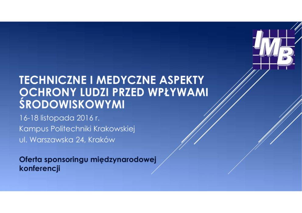 TECHNICZNE I MEDYCZNE ASPEKTY OCHRONY LUDZI PRZED WPŁYWAMI ŚRODOWISKOWYMI 16-18 listopada 2016 r. Kampus Politechniki Krakowskiej ul. Warszawska 24, Kraków Oferta sponsoringu międzynarodowej konferencji OFERTA Proponujemy Państwu udział w sponsoringu międzynarodowej konferencji „TECHNICZNE I MEDYCZNE ASPEKTY OCHRONY LUDZI PRZED WPŁYWAMI ŚRODOWISKOWYMI”, która odbędzie się w dniach 16-18 listopada 2016 roku w salach konferencyjnych Politechniki Krakowskiej im. Tadeusza Kościuszki przy ul. Warszawskiej 24 w Krakowie. Konferencja „TECHNICZNE I MEDYCZNE ASPEKTY OCHRONY LUDZI PRZED WPŁYWAMI ŚRODOWISKOWYMI” jest pierwszą międzynarodową inicjatywą o takim charakterze. Skierowana do szerokiego grona odbiorców zarówno z branży medycznej jak i nauk technicznych, pobudzać ma ich do innowacyjnego połączenia obu dyscyplin nauki. Brak zawężenia grupy odbiorców konferencji sprawia, że jest ona doskonałą okazją do wymiany doświadczeń i wiedzy, a także inspiruje do kreatywnych działań. Problematyka wykładów skupiona jest na pobudzeniu innowacyjności inżynierskiej oraz jej praktycznych zastosowaniach w nowoczesnej medycynie. Obecność w gronie Sponsorów konferencji poświęconej tej właśnie tematyce, sprawi, że Państwa firma postrzegana będzie jako lider innowacyjności na rynku. ZAKRES medycyna środowiska medycyna pracy nauki o zdrowiu a ochrona środowiska i rozwój techniki wpływ hałasu i wibracji na organizm ludzki techniczne możliwości zabezpieczeń przed wpływami środowiskowymi innowacyjna medycyna i szeroko pojęta medycyna spersonalizowana wpływ zanieczyszczenia wody i powietrza na organizm ludzki i możliwości jego eliminacji wpływ oddziaływań antropogenicznych na jakość produktów żywnościowych, mających odbicie na stan zdrowia człowieka medycyna wiejska wpływ oddziaływań długotrwałych na organizm ludzki PATRONAT HONOROWY KONFERENCJI Rektor Śląskiego Uniwersytetu Medycznego Rektor Politechniki Krakowskiej KOMITET NAUKOWY KONFERENCJI prof. dr hab. inż. Krzysztof Stypuła - przewodniczący prof. dr hab. n. med. Andrzej Małecki dr n. med. Zbigniew Eysymontt Akademia Wychowania Fizycznego im. Jerzego Kukuczki w Katowicach prof. dr hab. n. med. Czesław Marcisz Przewodniczący Sekcji Rehabilitacji Kardiologicznej i Fizjologii Wysiłku prof. Dora Foti Wydział Nauk o Zdrowiu, Śląski Uniwersytet Medyczny w Katowicach prof. Masaru Matsumoto Dipartimento Ingegneria Civile a Ambientale, Technical University of Bari Department of Civil and Earth Resources Engineering, Kyoto University prof. dr hab. n. med. Krystyna Pawlas Wydział Inżynierii Lądowej, Politechnika Krakowska dr inż. Matija Gams Slovenian National Building and Civil Engineering Institute dr n. med. Justyna Glik Wydział Nauk o Zdrowiu, Śląski Uniwersytet Medyczny w Katowicach prof. dr hab. n. med. Wojciech Hanke Krajowy Konsultant w dziedzinie zdrowia środowiskowego prof. dr hab. n. med. Katarzyna Kordas Epidemiology and Environmental Health, State University of New York at Buffalo Wydział Lekarski, Uniwersytet Medyczny im. Piastów Śląskich we Wrocławiu dr hab. n. med. Natalia Pawlas Instytut Medycyny Pracy i Zdrowia Środowiskowego w Sosnowcu dr inż. Anna Romańska-Zapała Małopolskie Laboratorium Budownictwa Energooszczędnego, Politechnika Krakowska dr inż. Stefano de Santis Roma Tre University dr hab. n. med. Małgorzata Kowalska prof. Yukio Tamura Wydział Lekarski, Śląski Uniwersytet Medyczny w Katowicach School of Civil Engineering, Beijing Jiaotong University dr inż. Alicja Kowalska-Koczwara prof. dr hab. inż. Tadeusz Tatara Instytut Mechaniki Budowli, Politechnika Krakowska Instytut Mechaniki Budowli, Politechnika Krakowska prof. dr hab. Inż. Marek Książek Instytut Mechaniki Stosowanej, Wydział Mechaniczny, Politechnika Krakowska prof. dr hab. inż. Krystyna Kuźniar Instytut Techniki, Uniwersytet Pedagogiczny im. Komisji Edukacji w Krakowie dr hab. n. med. Renata Złotkowska Wydział Zdrowia Publicznego, Śląski Uniwersytet Medyczny w Katowicach OFERTA DLA SPONSORA ‐ PAKIET ZŁOTY • 10 000 zł + VAT • Miejsce na postawienie planszy lub banneru reklamowego na sali konferencyjnej • Umożliwienie prezentacji multimedialnej firmy Sponsora (filmy, prezentacje, pokaz slajdów itp.) w ramach prezentacji referatów • Stoisko ekspozycyjne z możliwością przedstawienia pełnej oferty sponsora • Logo sponsora: na stronie internetowej konferencji, ulotkach, plakatach • Zaproszenie dla dwóch przedstawicieli firmy sponsora na konferencję • Dystrybucja materiałów promocyjnych Sponsora dla uczestników konferencji OFERTA DLA SPONSORA ‐ PAKIET SREBRNY • 6 000 zł + VAT • Miejsce na postawienie planszy lub banneru reklamowego na sali konferencyjnej • Stoisko ekspozycyjne z możliwością przedstawienia pełnej oferty sponsora • Logo sponsora: na stronie internetowej konferencji, ulotkach • Zaproszenie dla dwóch przedstawicieli firmy sponsora na konferencję • Dystrybucja materiałów promocyjnych Sponsora dla uczestników konferencji OFERTA DLA SPONSORA – PAKIETY REKLAMOWE • 1 600 zł – miejsce na stoisko reklamowe w hallu wystawowym • 1 000 zł – ustawienie plansz reklamowych • 2 000 zł – kolportaż gadżetów reklamowych wśród uczestników Konferencji KONTAKT: INSTYTUT MECHANIKI BUDOWLI POLITECHNIKA KRAKOWSKA ul. Warszawska 24 31-155 Kraków tel. +48 12 628 23 40 fax. +48 12 628 20 51 mail: [email protected] [email protected] http://techmed.pk.edu.pl/