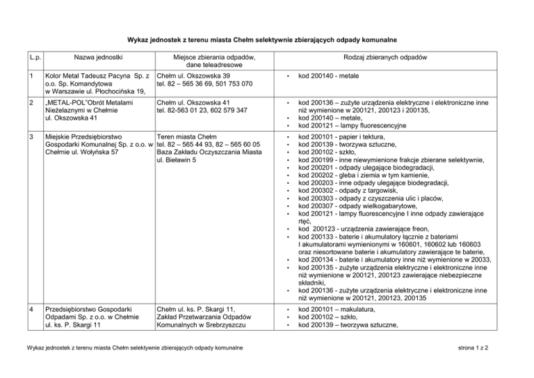 Wykaz jednostek z terenu miasta Chełm selektywnie zbierających odpady komunalne L.p. Nazwa jednostki Miejsce zbierania odpadów, dane teleadresowe Rodzaj zbieranych odpadów 1 Kolor Metal Tadeusz Pacyna Sp. z o.o. Sp. Komandytowa w Warszawie ul. Płochocińska 19, Chełm ul. Okszowska 39 tel. 82 – 565 36 69, 501 753 070 • kod 200140 - metale 2 „METAL-POL”Obrót Metalami Nieżelaznymi w Chełmie ul. Okszowska 41 Chełm ul. Okszowska 41 tel. 82-563 01 23, 602 579 347 • kod 200136 – zużyte urządzenia elektryczne i elektroniczne inne niż wymienione w 200121, 200123 i 200135, kod 200140 – metale, kod 200121 – lampy fluorescencyjne 3 • • Miejskie Przedsiębiorstwo Teren miasta Chełm Gospodarki Komunalnej Sp. z o.o. w tel. 82 – 565 44 93, 82 – 565 60 05 Chełmie ul. Wołyńska 57 Baza Zakładu Oczyszczania Miasta ul. Bieławin 5 • • • • • • • • • • • • • • • • 4 Przedsiębiorstwo Gospodarki Odpadami Sp. z o.o. w Chełmie ul. ks. P. Skargi 11 Chełm ul. ks. P. Skargi 11, Zakład Przetwarzania Odpadów Komunalnych w Srebrzyszczu Wykaz jednostek z terenu miasta Chełm selektywnie zbierających odpady komunalne • • • kod 200101 - papier i tektura, kod 200139 - tworzywa sztuczne, kod 200102 - szkło, kod 200199 - inne niewymienione frakcje zbierane selektywnie, kod 200201 - odpady ulegające biodegradacji, kod 200202 - gleba i ziemia w tym kamienie, kod 200203 - inne odpady ulegające biodegradacji, kod 200302 - odpady z targowisk, kod 200303 - odpady z czyszczenia ulic i placów, kod 200307 - odpady wielkogabarytowe, kod 200121 - lampy fluorescencyjne I inne odpady zawierające rtęć, kod 200123 - urządzenia zawierające freon, kod 200133 - baterie i akumulatory łącznie z bateriami I akumulatorami wymienionymi w 160601, 160602 lub 160603 oraz niesortowane baterie i akumulatory zawierające te baterie, kod 200134 - baterie i akumulatory inne niż wymienione w 20033, kod 200135 - zużyte urządzenia elektryczne i elektroniczne inne niż wymienione w 200121, 200123 zawierające niebezpieczne składniki, kod 200136 - zużyte urządzenia elektryczne i elektroniczne inne niż wymienione w 200121, 200123, 200135 kod 200101 – makulatura, kod 200102 – szkło, kod 200139 – tworzywa sztuczne, strona 1 z 2 tel. 82 – 560 50 20 • • • • • • 5 Przedsiębiorstwo Usług Mieszkaniowych Sp. z o.o. ul. Bieławin 9 w Chełmie Teren Miasta Chełm tel. 82 – 565 42 59, 82 – 565 00 71 • • • • 6 Recykl Organizacja Odzysku S.A. Przysieka Polska ul. Przemysłowa 16, 64-030 Śmigiel 7 Recykl Zakład w Chełmie ul. Fabryczna 6 tel. 667955230 kod 200140 – złom metalowy, kod 200121 – lampy fluorescencyjne i inne odpady zawierające rtęć kod 200123 – urządzenia zawierające freony, kod 200133 – baterie i akumulatory łącznie z bateriami i akumulatorami wymienionymi w 160601, 160602 lub 160603 oraz nie sortowane baterie i akumulatory zawierające te baterie, kod 200134 – baterie I akumulatory inne niż wymienione w 200133, kod 200135 – zużyte urządzenia elektryczne i elektroniczne inne niż wymienione w 200121, 200123. kod 200135 - zużyte urządzenia elektryczne i elektroniczne inne niż wymienione w 200121, 200123,zawierające niebezpieczne składniki, kod 200303 - odpady z czyszczenia ulic i placów, kod 200307 - odpady wielkogabarytowe, kod 200399 - odpady komunalne nie wymienione w innych podgrupach, • kod 160103 – zużyte opony Stora Enso Poland S.A. w Ostrołęce Zakład w Chełmie ul. Rampa Brzeska 9 tel. 82 – 565 42 05, 510 223 023 • kod 200101 – papier i tektura 8 “TRANS-AGRO” Lucjan Mielniczenko w Chełmie ul. Żeromskiego 40 Chełm, Kolejowa 45 A tel. 82 - 565 59 43 • kod 200140 – metale 9 Elektromechanika Pojazdowa Stacja Chełm, Jaworskiego 6 Obsługi Akumulatorów Michał tel. 82 – 565 55 00 Matwiejczuk – Chełm ul. Jaworskiego 6 • kod 160601- baterie i akumulatory ołowiowe Wykaz jednostek z terenu miasta Chełm selektywnie zbierających odpady komunalne strona 2 z 2