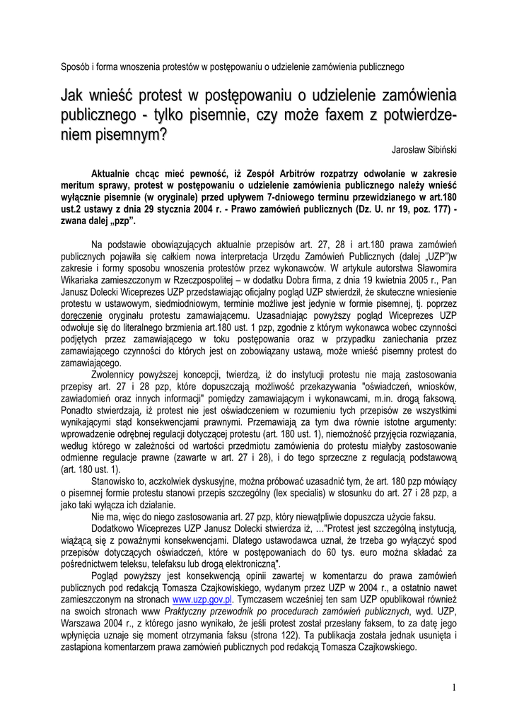 Sposób i forma wnoszenia protestów w postępowaniu o udzielenie zamówienia publicznego Jak wnieść protest w postępowaniu o udzielenie zamówienia publicznego - tylko pisemnie, czy może faxem z potwierdzeniem pisemnym? Jarosław Sibiński Aktualnie chcąc mieć pewność, iż Zespół Arbitrów rozpatrzy odwołanie w zakresie meritum sprawy, protest w postępowaniu o udzielenie zamówienia publicznego należy wnieść wyłącznie pisemnie (w oryginale) przed upływem 7-dniowego terminu przewidzianego w art.180 ust.2 ustawy z dnia 29 stycznia 2004 r. - Prawo zamówień publicznych (Dz. U. nr 19, poz. 177) zwana dalej „pzp”. Na podstawie obowiązujących aktualnie przepisów art. 27, 28 i art.180 prawa zamówień publicznych pojawiła się całkiem nowa interpretacja Urzędu Zamówień Publicznych (dalej „UZP”)w zakresie i formy sposobu wnoszenia protestów przez wykonawców. W artykule autorstwa Sławomira Wikariaka zamieszczonym w Rzeczpospolitej – w dodatku Dobra firma, z dnia 19 kwietnia 2005 r., Pan Janusz Dolecki Wiceprezes UZP przedstawiając oficjalny pogląd UZP stwierdził, że skuteczne wniesienie protestu w ustawowym, siedmiodniowym, terminie możliwe jest jedynie w formie pisemnej, tj. poprzez doręczenie oryginału protestu zamawiającemu. Uzasadniając powyższy pogląd Wiceprezes UZP odwołuje się do literalnego brzmienia art.180 ust. 1 pzp, zgodnie z którym wykonawca wobec czynności podjętych przez zamawiającego w toku postępowania oraz w przypadku zaniechania przez zamawiającego czynności do których jest on zobowiązany ustawą, może wnieść pisemny protest do zamawiającego. Zwolennicy powyższej koncepcji, twierdzą, iż do instytucji protestu nie mają zastosowania przepisy art. 27 i 28 pzp, które dopuszczają możliwość przekazywania "oświadczeń, wniosków, zawiadomień oraz innych informacji" pomiędzy zamawiającym i wykonawcami, m.in. drogą faksową. Ponadto stwierdzają, iż protest nie jest oświadczeniem w rozumieniu tych przepisów ze wszystkimi wynikającymi stąd konsekwencjami prawnymi. Przemawiają za tym dwa równie istotne argumenty: wprowadzenie odrębnej regulacji dotyczącej protestu (art. 180 ust. 1), niemożność przyjęcia rozwiązania, według którego w zależności od wartości przedmiotu zamówienia do protestu miałyby zastosowanie odmienne regulacje prawne (zawarte w art. 27 i 28), i do tego sprzeczne z regulacją podstawową (art. 180 ust. 1). Stanowisko to, aczkolwiek dyskusyjne, można próbować uzasadnić tym, że art. 180 pzp mówiący o pisemnej formie protestu stanowi przepis szczególny (lex specialis) w stosunku do art. 27 i 28 pzp, a jako taki wyłącza ich działanie. Nie ma, więc do niego zastosowania art. 27 pzp, który niewątpliwie dopuszcza użycie faksu. Dodatkowo Wiceprezes UZP Janusz Dolecki stwierdza iż, …"Protest jest szczególną instytucją, wiążącą się z poważnymi konsekwencjami. Dlatego ustawodawca uznał, że trzeba go wyłączyć spod przepisów dotyczących oświadczeń, które w postępowaniach do 60 tys. euro można składać za pośrednictwem teleksu, telefaksu lub drogą elektroniczną". Pogląd powyższy jest konsekwencją opinii zawartej w komentarzu do prawa zamówień publicznych pod redakcją Tomasza Czajkowiskiego, wydanym przez UZP w 2004 r., a ostatnio nawet zamieszczonym na stronach www.uzp.gov.pl. Tymczasem wcześniej ten sam UZP opublikował również na swoich stronach www Praktyczny przewodnik po procedurach zamówień publicznych, wyd. UZP, Warszawa 2004 r., z którego jasno wynikało, że jeśli protest został przesłany faksem, to za datę jego wpłynięcia uznaje się moment otrzymania faksu (strona 122). Ta publikacja została jednak usunięta i zastąpiona komentarzem prawa zamówień publicznych pod redakcją Tomasza Czajkowskiego. 1 Nasuwa się pytanie – dlaczego UZP usunął właśnie ten Praktyczny przewodnik po procedurach zamówień publicznych? Jest to zmiana poglądów i dotychczasowego orzecznictwa i to na niekorzyść wykonawców. Zamawiający bardzo często powołują się na ten urzędowy komentarz i odrzucają protesty, które nadeszły w formie pisemnej po czasie, mimo że faks odebrali przed upłynięciem dopuszczalnego terminu. W odniesieniu do powyżej opisanego poglądu i interpretacji UZP zauważyć należy, że przepis art. 180 ust. 1 pzp określa jedynie formę, w jakiej powinien zostać wniesiony protest. Przepisy dotyczące formy czynności prawnej, w tym również sankcje za jej niezachowanie, określają przepisy kodeksu cywilnego (dalej: k.c.). Odesłanie wprost do przepisów k.c. sformułowane zostało przez ustawodawcę w art. 14 pzp. Niewątpliwie protest jest oświadczeniem woli w rozumieniu przepisów kodeksu cywilnego oświadczeniem wykonawcy skierowanym do zamawiającego. Zgodnie z art. 61 § 1 zd. pierwsze k.c. "oświadczenie woli, które ma być złożone innej osobie, jest złożone z chwilą, gdy doszło do niej w taki sposób, że mogła zapoznać się z jego treścią". Analogiczne sformułowanie powtórzone jest w art. 180 ust. 2 zd. drugie: "protest uważa się za wniesiony z chwilą, gdy doszedł on do zamawiającego w taki sposób, że mógł się zapoznać z jego treścią". Wynika z tego, że protest będzie wniesiony z chwilą skutecznego przesłania go zamawiającemu, a data wniesienia protestu faksem powinna mieć decydujące znaczenie dla liczenia siedmiodniowego terminu do jego wniesienia. Pzp wymaga, aby protest wniesiony był wniesiony w formie pisemnej. Wniesienie protestu w innej formie stanowi uchybienie przepisowi art. 180 pzp, a dokładnie niezachowanie wymaganej przepisem formy. Sankcje w tym zakresie określają przepisy k.c. Artykuł 73 § 1 k.c. stanowi: "jeżeli ustawa zastrzega dla czynności prawnej formę pisemną, czynność dokonana bez zachowania zastrzeżonej formy jest nieważna tylko wtedy, gdy ustawa przewiduje rygor nieważności". Nie ulega wątpliwości, że przepisy pzp t