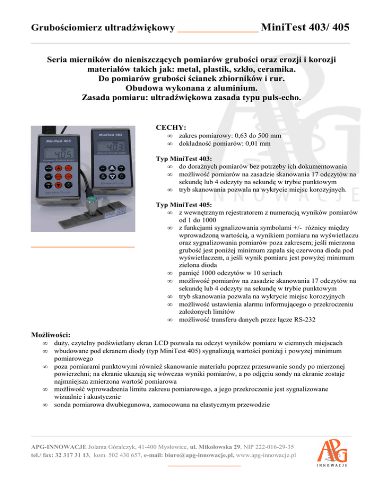 Grubościomierz ultradźwiękowy __________________ MiniTest 403/ 405 ______________________________________________________________ Seria mierników do nieniszczących pomiarów grubości oraz erozji i korozji materiałów takich jak: metal, plastik, szkło, ceramika. Do pomiarów grubości ścianek zbiorników i rur. Obudowa wykonana z aluminium. Zasada pomiaru: ultradźwiękowa zasada typu puls-echo. CECHY: • • zakres pomiarowy: 0,63 do 500 mm dokładność pomiarów: 0,01 mm Typ MiniTest 403: • do doraźnych pomiarów bez potrzeby ich dokumentowania • możliwość pomiarów na zasadzie skanowania 17 odczytów na sekundę lub 4 odczyty na sekundę w trybie punktowym • tryb skanowania pozwala na wykrycie miejsc korozyjnych. _______________________ Typ MiniTest 405: • z wewnętrznym rejestratorem z numeracją wyników pomiarów od 1 do 1000 • z funkcjami sygnalizowania symbolami +/- różnicy między wprowadzoną wartością, a wynikiem pomiaru na wyświetlaczu oraz sygnalizowania pomiarów poza zakresem; jeśli mierzona grubość jest poniżej minimum zapala się czerwona dioda pod wyświetlaczem, a jeśli wynik pomiaru jest powyżej minimum zielona dioda • pamięć 1000 odczytów w 10 seriach • możliwość pomiarów na zasadzie skanowania 17 odczytów na sekundę lub 4 odczyty na sekundę w trybie punktowym • tryb skanowania pozwala na wykrycie miejsc korozyjnych • możliwość ustawienia alarmu informującego o przekroczeniu założonych limitów • możliwość transferu danych przez łącze RS-232 Możliwości: • • • • • duży, czytelny podświetlany ekran LCD pozwala na odczyt wyników pomiaru w ciemnych miejscach wbudowane pod ekranem diody (typ MiniTest 405) sygnalizują wartości poniżej i powyżej minimum pomiarowego poza pomiarami punktowymi również skanowanie materiału poprzez przesuwanie sondy po mierzonej powierzchni; na ekranie ukazują się wówczas wyniki pomiarów, a po odjęciu sondy na ekranie zostaje najmniejsza zmierzona wartość pomiarowa możliwość wprowadzenia limitu zakresu pomiarowego, a jego przekroczenie jest sygnalizowane wizualnie i akustycznie sonda pomiarowa dwubiegunowa, zamocowana na elastycznym przewodzie ___________________________________________________________________________________ APG-INNOWACJE Jolanta Góralczyk, 41-400 Mysłowice, ul. Mikołowska 29, NIP 222-016-29-35 tel./ fax: 32 317 31 13, kom. 502 430 657, e-mail: [email protected], www.apg-innowacje.pl ___________________ Grubościomierz ultradźwiękowy __________________ MiniTest 403/ 405 ______________________________________________________________ Dane techniczne: Zakres pomiarowy Rozdzielczość Zakres ustawianej prędkości dźwięku Szybkość pomiarów Przetwornik – sonda pomiarowa Kalibracja Zasilanie Wyświetlacz Obudowa miernika Przyciski Gniazdo podłączeniowe (model 405) Temperatura otoczenia Wymiary Masa Wyposażenie standardowe Opcje dodatkowe 0,63 mm do 500 mm w zależności od mierzonego materiału 0,01 mm 1 250 do 10 000 m/sek 4 na sekundę przy pojedynczym pomiarze lub 17 przy funkcji skanowania z uchwyceniem minimalnej grubości dwuelementowa – nadajnik-odbiornik o zakresie częstotliwości 1 do 10MHz na metrowym przewodzie jedno- i dwupunktowa 2 x 1,5V alkaliczne o żywotności ok. 200 godz. Lub 1,2 NiCad AA baterie o żywotności ok. 130 godzin. Zużycie baterii jest sygnalizowane, gdy jest zbyt słabe miernik się wyłącza ciekłokrystaliczny, wskazania 4,5 wielkości z możliwością włączenia podświetlania podczas pomiaru odporne aluminium niklowane ze szczelnym pokryciem odpornym na wodę i produkty ropopochodne RS 232 do drukarki lub komputera -30ºC d0 50ºC (w skrajnych wartościach krótkotrwale) 64 x 121 x 32mm 284 g z bateriami miernik z sondą pomiarową, żel kontaktowy, baterie typu AA, futerał, instrukcja obsługi, karta gwarancyjna blok kalibracyjny oraz program do obróbki statystycznej działający pod Windows ___________________________________________________________________________________ APG-INNOWACJE Jolanta Góralczyk, 41-400 Mysłowice, ul. Mikołowska 29, NIP 222-016-29-35 tel./ fax: 32 317 31 13, kom. 502 430 657, e-mail: [email protected], www.apg-innowacje.pl ___________________