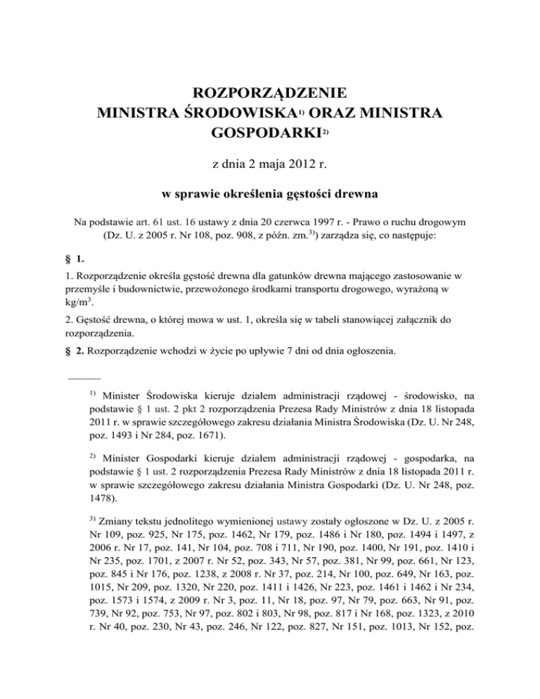 ROZPORZĄDZENIE MINISTRA ŚRODOWISKA1) ORAZ MINISTRA GOSPODARKI2) z dnia 2 maja 2012 r. w sprawie określenia gęstości drewna Na podstawie art. 61 ust. 16 ustawy z dnia 20 czerwca 1997 r. - Prawo o ruchu drogowym (Dz. U. z 2005 r. Nr 108, poz. 908, z późn. zm.3)) zarządza się, co następuje: § 1. 1. Rozporządzenie określa gęstość drewna dla gatunków drewna mającego zastosowanie w przemyśle i budownictwie, przewożonego środkami transportu drogowego, wyrażoną w kg/m3. 2. Gęstość drewna, o której mowa w ust. 1, określa się w tabeli stanowiącej załącznik do rozporządzenia. § 2. Rozporządzenie wchodzi w życie po upływie 7 dni od dnia ogłoszenia. ______ Minister Środowiska kieruje działem administracji rządowej - środowisko, na podstawie § 1 ust. 2 pkt 2 rozporządzenia Prezesa Rady Ministrów z dnia 18 listopada 2011 r. w sprawie szczegółowego zakresu działania Ministra Środowiska (Dz. U. Nr 248, poz. 1493 i Nr 284, poz. 1671). 1) 2) Minister Gospodarki kieruje działem administracji rządowej - gospodarka, na podstawie § 1 ust. 2 rozporządzenia Prezesa Rady Ministrów z dnia 18 listopada 2011 r. w sprawie szczegółowego zakresu działania Ministra Gospodarki (Dz. U. Nr 248, poz. 1478). 3) Zmiany tekstu jednolitego wymienionej ustawy zostały ogłoszone w Dz. U. z 2005 r. Nr 109, poz. 925, Nr 175, poz. 1462, Nr 179, poz. 1486 i Nr 180, poz. 1494 i 1497, z 2006 r. Nr 17, poz. 141, Nr 104, poz. 708 i 711, Nr 190, poz. 1400, Nr 191, poz. 1410 i Nr 235, poz. 1701, z 2007 r. Nr 52, poz. 343, Nr 57, poz. 381, Nr 99, poz. 661, Nr 123, poz. 845 i Nr 176, poz. 1238, z 2008 r. Nr 37, poz. 214, Nr 100, poz. 649, Nr 163, poz. 1015, Nr 209, poz. 1320, Nr 220, poz. 1411 i 1426, Nr 223, poz. 1461 i 1462 i Nr 234, poz. 1573 i 1574, z 2009 r. Nr 3, poz. 11, Nr 18, poz. 97, Nr 79, poz. 663, Nr 91, poz. 739, Nr 92, poz. 753, Nr 97, poz. 802 i 803, Nr 98, poz. 817 i Nr 168, poz. 1323, z 2010 r. Nr 40, poz. 230, Nr 43, poz. 246, Nr 122, poz. 827, Nr 151, poz. 1013, Nr 152, poz. 1018, Nr 182, poz. 1228, Nr 219, poz. 1443, Nr 225, poz. 1466 i Nr 257, poz. 1726, z 2011 r. Nr 30, poz. 151, Nr 92, poz. 530, Nr 102, poz. 585, Nr 106, poz. 622, Nr 171, poz. 1016, Nr 204, poz. 1195, Nr 205, poz. 1210, Nr 208, poz. 1240 i 1241, Nr 222, poz. 1321, Nr 227, poz. 1367, Nr 244, poz. 1454 i Nr 291, poz. 1707 oraz z 2012 r. poz. 113 i 472. ZAŁĄCZNIK TABELA GĘSTOŚCI DREWNA DLA GATUNKÓW DREWNA MAJĄCEGO ZASTOSOWANIE W PRZEMYŚLE I BUDOWNICTWIE, PRZEWOŻONEGO ŚRODKAMI TRANSPORTU DROGOWEGO Lp. Gatunek drewna Gęstość drewna [kg/m3]1) 1 brzoza 810 2 buk 980 3 daglezja 660 4 dąb 950 5 grab 960 6 grochodrzew (robinia) 870 7 jesion 800 8 jodła 750 9 klon jawor 900 10 klon zwyczajny 900 11 lipa 670 12 modrzew 830 13 olcha 750 14 osika 710 15 sosna 740 16 świerk 720 17 topola 670 18 wiąz 820 1) W przypadku drewna mierzonego w stosach, jego objętość wyrażoną w metrach przestrzennych przelicza się na objętość w metrach sześciennych przy zastosowaniu współczynników zamiennych określonych w Polskiej Normie PN-D-95000.