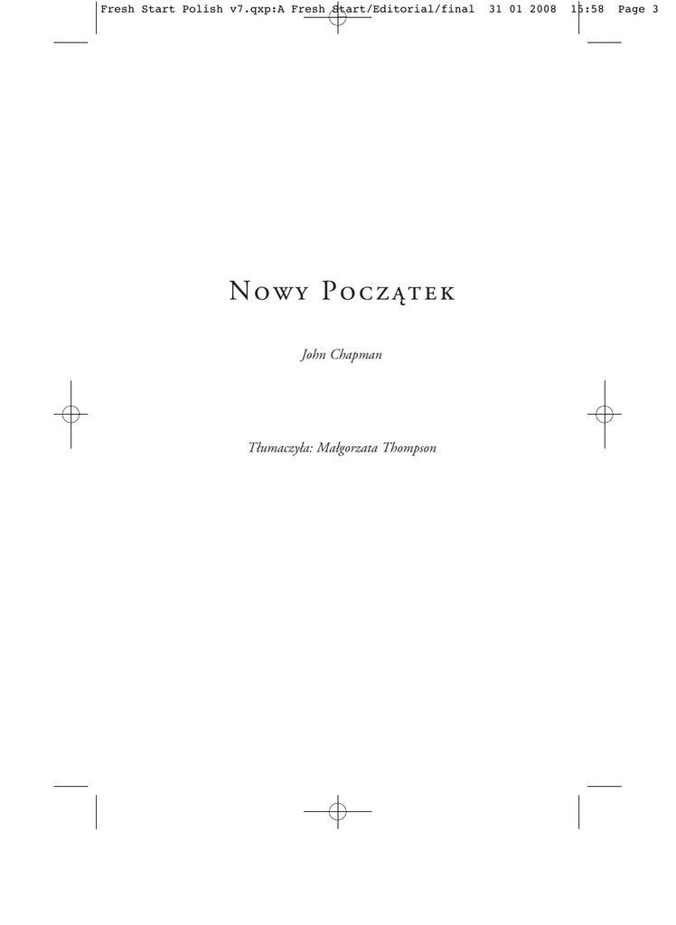 Fresh Start Polish v7.qxp:A Fresh Start/Editorial/final N P John Chapman Tłumaczyła: Małgorzata Thompson 31 01 2008 15:58 Page 3 Fresh Start Polish v7.qxp:A Fresh Start/Editorial/final 31 01 2008 Spis treści Jak to jest z Tobą? Część Pierwsza — Nasz problem, Boże rozwiązanie Czasem jestem traktowany jak kawałek drewna. Coś jest naprawdę nie w porządku Co Bóg z tym zrobił? Jak to jest być chrześcijaninem? Część Druga — Czy naprawdę możemy być pewni? Proszę, niech prawdziwy Bóg wstanie Niezwykłe, wstrząsające, lecz wiarygodne Pan w swoim świecie Czy mogę ufać Ewangeliom? Część Trzecia — Jaka jest alternatywa? Po co taki pośpiech? Dlaczego bycie dobrym nie wystarcza? Część Czwarta — Co trzeba zrobić? Co ja mam zrobić? Czy mogę być pewien? Którędy naprzód? P. S. … 15:58 Page 5 Fresh Start Polish v7.qxp:A Fresh Start/Editorial/final 31 01 2008 Słowo wstępne M książkę od przyjaciela, albo właśnie zdecydowałeś się ją przeczytać. Wskaże Ci ona drogę, jak możesz stać się przyjacielem żyjącego Boga. Jest napisana dla ludzi, którzy są przygotowani, aby inaczej spojrzeć na chrześcijaństwo. Stawia fundamenty. Mam nadzieję, że pomoże Ci ona w Twojej pielgrzymce do Boga. Jestem chrześcijaninem od przeszło pięćdziesięciu lat. Każdy rok jest dla mnie bardziej ekscytujący od poprzedniego. Jeszcze do tej pory nie mieści mi się w głowie fakt, że Bóg tak bardzo troszczy się o mnie, iż zesłał Swojego Syna na świat, abym mógł stać się Jego przyjacielem. Przyjaźń ta była tak satysfakcjonująca dla mnie, że pragnę podzielić się nią ze wszystkimi. Mam nadzieję, że książka ta stanie się dla Ciebie pomocna. Swobodnie posługiwałem się cytatami z Biblii. Może będzie to dla Ciebie wskazówką, jak zaznaczę, że zapisek (Ewangelia wg. Św. Łukasza :) oznacza, że cytat pochodzi z Biblii, z księgi zwanej „Ewangelią według Św. Łukasza”. Łukasz jest w Nowym 15:58 Page 9 Fresh Start Polish v7.qxp:A Fresh Start/Editorial/final 31 01 2008 Testamencie, jest numerem rozdziału, a jest numerem wersetu w rozdziale drugim Ewangelii według Św. Łukasza. Od czasu pierwszego wydania tej książki, spotkałem setki ludzi, którzy przeczytali ją i opowiedzieli mi, jak wielkie znaczenie odegrała ona w ich drodze do prawdziwego chrześcijaństwa. To jest właśnie powodem, dla którego ją napisałem. Mam nadzieję, że i dla Ciebie stanie się ona pomocą w Twojej drodze do Boga. John Chapman Wrzesień 15:58 Page 10 Fresh Start Polish v7.qxp:A Fresh Start/Editorial/final 31 01 2008 ROZDZIAŁ PIERWSZY Jak to jest z Tobą? P małym dziecku, które zapytało: —Tato! Skąd się wziąłem? Trochę speszony ojciec posadził malucha i długo mu opowiadał o bocianach, pszczółkach i kwiatkach. Dziecko było bardzo zdziwione i zainteresowane. Kiedy ojciec skończył, zapytał: —Czy wszystko jest jasne? Jego syn na to: —Tak, dosyć jasne i bardzo interesujące, ale ja chciałem wiedzieć skąd jestem. Tommy Jones powiedział, że jest z Anglii. Ja też chcę wiedzieć skąd jestem. Przez ostatnich dwadzieścia pięć lat rozmawiałem z setkami ludzi o tym, jak stać się chrześcijaninem. Niektórzy z nich wierzyli w Boga, niektórzy nie byli nawet pewni, czy On istnieje. Ci, którzy wierzyli w Boga, nie byli nawet pewni, tego, czy Jezus Chrystus był Synem Bożym, podczas gdy inni w to wierzyli. Niektórzy byli przekonani, że Jezus jest Synem Bożym, ale jakoś nie chcieli zmienić swojego życia, podczas gdy inni chcieli stać się chrześcijanami, ale nie wiedzieli jak. Nikt z nas nie jest dokładnie 15:58 Page 11 Fresh Start Polish v7.qxp:A Fresh Start/Editorial/final 31 01 2008 JAK TO JEST Z TOBĄ? w takiej samej sytuacji w naszym życiu duchowym i to stawia mnie przed problemem. Nie chcę nikogo zanudzać moimi odpowiedziami na pytania, które mogą nie być dla Was interesujące. Chciałbym przygotować grunt do dokładnego rozpatrzenia tematu chrześcijaństwa. Dlatego też napisałem tę książkę w czterech częściach. W pierwszym rozdziale zajmiemy się Bożym rozwiązaniem naszego problemu.W tej części przedstawiam, że Bóg istnieje, że Jezus Chrystus jest jego niezrównanym Synem, a także że Pismo Święte podaje nam dokładne informacje o Bogu. Druga część jest napisana dla tych, którzy są niepewni istnienia Boga i tego, czy Jezus Chrystus jest Jego Synem. Pokazuje, że historie o Jezusie zawarte w Nowym Testamencie są wiarygodne i że Biblia podaje nam dokładne informacje o Bogu. Jeżeli do tego tematu nie masz już żadnych pytań, to przejdź od razu do trzeciej lub czwartej części. W trzeciej części rozpatrujemy poważną odpowiedzialność odpowiedzenia Bogu i podążaniu Jego drogą, a nie naszą. Czwarta część przedstawia szczegółowo, co musimy zrobić, aby stać się chrześcijanami i jak mieć pewność, że nimi jesteśmy. 15:58 Page 12 Fresh Start Polish v7.qxp:A Fresh Start/Editorial/final 31 01 2008 Część Pierwsza N , B 15:58 Page 13 Fresh Start Polish v7.qxp:A Fresh Start/Editorial/final 31 01 2008 ROZDZIAŁ DRUGI Czasem jestem traktowany jak kawałek drewna K godzinie szóstej wyrywa mnie ze snu dźwięk budzika, wtedy włączam radio i słucham wiadomości o tym, co się wydarzyło na świecie, podczas, gdy ja spałem. Potem zastanawiam się czy warto wychodzić z łóżka. Jak do tej pory było to całkiem przyjemne. Pewnego poranka usłyszałem o zamachu na egipskiego prezydenta — Sadata. Z tego, co wiem nikt nigdy nie próbował mnie zamordować, ale jak słuchałem porannych wiadomości, zastanawiając się nad nimi, doszedłem do przekonania po raz wtóry, że zamach demonstruje ostateczność w rozbitym związku pomiędzy ludźmi. Zamachowiec nie tylko nie chce być przyjacielem swojej ofiary, ale jego czyn jest umyślnie zaplanowany, aby zapewnić niemożność rozwoju przyjaźni w przyszłości. Zamachowiec usuwa drugą osobę ze sceny