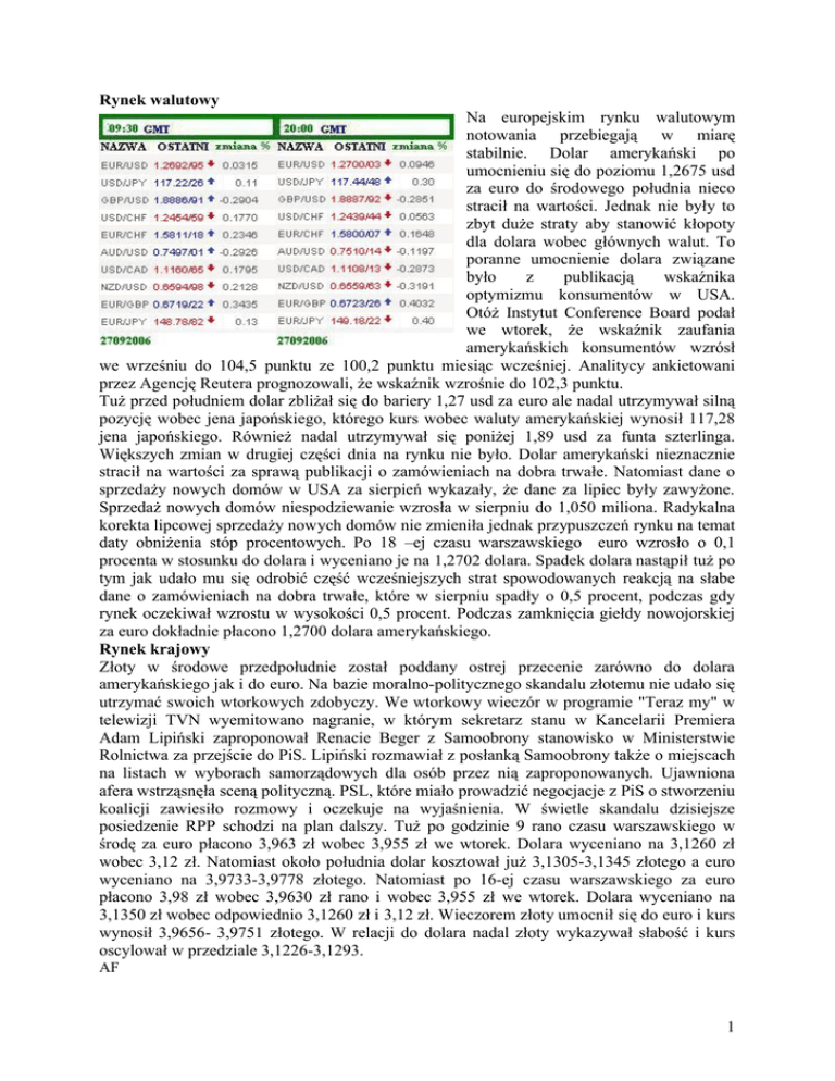 Rynek walutowy Na europejskim rynku walutowym notowania przebiegają w miarę stabilnie. Dolar amerykański po umocnieniu się do poziomu 1,2675 usd za euro do środowego południa nieco stracił na wartości. Jednak nie były to zbyt duże straty aby stanowić kłopoty dla dolara wobec głównych walut. To poranne umocnienie dolara związane było z publikacją wskaźnika optymizmu konsumentów w USA. Otóż Instytut Conference Board podał we wtorek, że wskaźnik zaufania amerykańskich konsumentów wzrósł we wrześniu do 104,5 punktu ze 100,2 punktu miesiąc wcześniej. Analitycy ankietowani przez Agencję Reutera prognozowali, że wskaźnik wzrośnie do 102,3 punktu. Tuż przed południem dolar zbliżał się do bariery 1,27 usd za euro ale nadal utrzymywał silną pozycję wobec jena japońskiego, którego kurs wobec waluty amerykańskiej wynosił 117,28 jena japońskiego. Również nadal utrzymywał się poniżej 1,89 usd za funta szterlinga. Większych zmian w drugiej części dnia na rynku nie było. Dolar amerykański nieznacznie stracił na wartości za sprawą publikacji o zamówieniach na dobra trwałe. Natomiast dane o sprzedaży nowych domów w USA za sierpień wykazały, że dane za lipiec były zawyżone. Sprzedaż nowych domów niespodziewanie wzrosła w sierpniu do 1,050 miliona. Radykalna korekta lipcowej sprzedaży nowych domów nie zmieniła jednak przypuszczeń rynku na temat daty obniżenia stóp procentowych. Po 18 –ej czasu warszawskiego euro wzrosło o 0,1 procenta w stosunku do dolara i wyceniano je na 1,2702 dolara. Spadek dolara nastąpił tuż po tym jak udało mu się odrobić część wcześniejszych strat spowodowanych reakcją na słabe dane o zamówieniach na dobra trwałe, które w sierpniu spadły o 0,5 procent, podczas gdy rynek oczekiwał wzrostu w wysokości 0,5 procent. Podczas zamknięcia giełdy nowojorskiej za euro dokładnie płacono 1,2700 dolara amerykańskiego. Rynek krajowy Złoty w środowe przedpołudnie został poddany ostrej przecenie zarówno do dolara amerykańskiego jak i do euro. Na bazie moralno-politycznego skandalu złotemu nie udało się utrzymać swoich wtorkowych zdobyczy. We wtorkowy wieczór w programie "Teraz my" w telewizji TVN wyemitowano nagranie, w którym sekretarz stanu w Kancelarii Premiera Adam Lipiński zaproponował Renacie Beger z Samoobrony stanowisko w Ministerstwie Rolnictwa za przejście do PiS. Lipiński rozmawiał z posłanką Samoobrony także o miejscach na listach w wyborach samorządowych dla osób przez nią zaproponowanych. Ujawniona afera wstrząsnęła sceną polityczną. PSL, które miało prowadzić negocjacje z PiS o stworzeniu koalicji zawiesiło rozmowy i oczekuje na wyjaśnienia. W świetle skandalu dzisiejsze posiedzenie RPP schodzi na plan dalszy. Tuż po godzinie 9 rano czasu warszawskiego w środę za euro płacono 3,963 zł wobec 3,955 zł we wtorek. Dolara wyceniano na 3,1260 zł wobec 3,12 zł. Natomiast około południa dolar kosztował już 3,1305-3,1345 złotego a euro wyceniano na 3,9733-3,9778 złotego. Natomiast po 16-ej czasu warszawskiego za euro płacono 3,98 zł wobec 3,9630 zł rano i wobec 3,955 zł we wtorek. Dolara wyceniano na 3,1350 zł wobec odpowiednio 3,1260 zł i 3,12 zł. Wieczorem złoty umocnił się do euro i kurs wynosił 3,9656- 3,9751 złotego. W relacji do dolara nadal złoty wykazywał słabość i kurs oscylował w przedziale 3,1226-3,1293. AF 1 [email protected] AF® Treść powyższej analizy jest tylko i wyłącznie wyrazem osobistych poglądów jej autora i nie stanowi "rekomendacji" w rozumieniu przepisów Rozporządzenia Ministra Finansów z dnia 19 października 2005 r. w sprawie informacji stanowiących rekomendacje dotyczące instrumentów finansowych, lub ich emitentów (Dz. U. z 2005 r. Nr 206, poz. 1715). Zgodnie z powyższym www.aii.pl oraz autor nie ponoszą jakiejkolwiek odpowiedzialności za decyzje inwestycyjne podejmowane na podstawie niniejszych komentarzy i analiz. 2