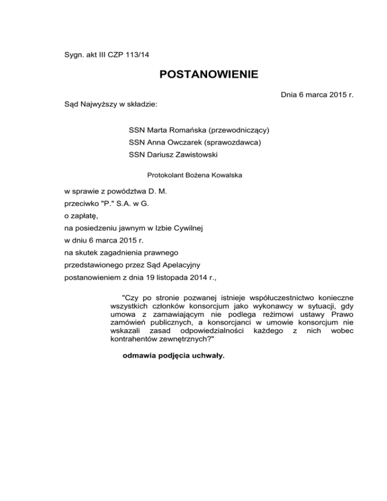 Sygn. akt III CZP 113/14 POSTANOWIENIE Dnia 6 marca 2015 r. Sąd Najwyższy w składzie: SSN Marta Romańska (przewodniczący) SSN Anna Owczarek (sprawozdawca) SSN Dariusz Zawistowski Protokolant Bożena Kowalska w sprawie z powództwa D. M. przeciwko "P." S.A. w G. o zapłatę, na posiedzeniu jawnym w Izbie Cywilnej w dniu 6 marca 2015 r. na skutek zagadnienia prawnego przedstawionego przez Sąd Apelacyjny postanowieniem z dnia 19 listopada 2014 r., "Czy po stronie pozwanej istnieje współuczestnictwo konieczne wszystkich członków konsorcjum jako wykonawcy w sytuacji, gdy umowa z zamawiającym nie podlega reżimowi ustawy Prawo zamówień publicznych, a konsorcjanci w umowie konsorcjum nie wskazali zasad odpowiedzialności każdego z nich wobec kontrahentów zewnętrznych?" odmawia podjęcia uchwały. 2 UZASADNIENIE Sąd Okręgowy w S. wyrokiem z dnia 3 kwietnia 2014 r. zasądził od pozwanego P. SA w G. na rzecz powoda D. M. kwotę 218.258 zł z ustawowymi odsetkami od dnia 25 października 2009 r. Sąd ustalił, że D. M., prowadzący działalność gospodarczą pod nazwą C. P.U. M. w W., oznaczony jako "kupujący" i konsorcjum w składzie lider: P. SA w G., partner: S. M. - działający pod nazwą Firma Usługowo-Handlowa K. S.C. A. K., partner: R. B. - działający pod nazwą Firma R. USŁUGI Elektroniczne i elektromechaniczne, oznaczone jako „sprzedawca", zawarli w dniu 5 listopada 2008 r. umowę zatytułowaną „Umowa sprzedaży nr …/2008". Konsorcjum reprezentowali członkowie Zarządu P. SA. W umowie nie odwołano się do postanowień umowy konsorcjalnej, a „kupujący" nie znał jej treści. „Sprzedawca" zobowiązał się do wytworzenia, zamontowania i uruchomienia oraz przeniesienia na „kupującego" prawa własności zestawu stanowiącego część linii do produkcji brykietu z słomy, o zakładanej wydajności, składającego się z oznaczonych elementów, za cenę 178.900 zł, powiększoną o 22 % podatek VAT. „Sprzedawca" udzielił gwarancji na okres jednego roku od dnia podpisania protokołu zdawczoodbiorczego. W umowie wskazano, że wszelkie jej zmiany i uzupełnienia wymagają formy pisemnej pod rygorem nieważności oraz, że w sprawach nieuregulowanych stosuje się przepisy kodeksu cywilnego. Linia produkcyjna nie osiągnęła zakładanych parametrów, część urządzeń była niekompatybilna lub działała nieprawidłowo, a kolejne naprawy były bezskuteczne. Powód oświadczeniem z dnia 5 listopada 2008 r., skierowanym do wszystkich członków konsorcjum, odstąpił od umowy i wezwał ich do zwrotu kwoty uiszczonej tytułem ceny. Urządzenia nadal znajdują się u powoda, który skorzystał z prawa zatrzymania. Umowa konsorcjalna stanowiła, że strony zobowiązują się dążyć do osiągnięcia wspólnego celu gospodarczego polegającego na pozyskiwaniu i realizacji kontraktów, obejmujących wykonywanie maszyn wchodzących w skład 3 części linii przygotowania surowca do produkcji brykietów, określała szczegółowy podział robót. Pojęcie „konsorcjum" oznaczało wszystkie strony umowy działające łącznie, przy czym reprezentantem wobec zamawiającego miał być lider konsorcjum. Przyjęto, że w zakresie odpowiedzialności gwarancyjnej każdy jest zobowiązany do dokonania naprawy w części, w jakiej wykonywał zamówienie, w zakresie kar umownych za niewykonanie lub nienależyte wykonanie zobowiązania odpowiada indywidualnie, a wzajemna odpowiedzialność stron za zobowiązania konsorcjum będzie proporcjonalna do zakresu i wartości robót wykonywanych przez każdego z konsorcjantów. Roszczenie o zwrot kwoty uiszczonej tytułem ceny zostało skierowane wyłącznie przeciwko liderowi konsorcjum, który kwestionując zasadę roszczenia, podniósł również zarzut częściowego braku legitymacji biernej twierdząc, że powód powinien dochodzić roszczenia przeciwko wszystkim konsorcjantom w równych częściach. Sąd pierwszej instancji przyjął, że nie może być mowy o niepodzielności świadczeń. Odwołując się do doktryny prawniczej przyjął, że stosunek konsorcyjny jest wzbogaconą spółką cywilną lub spółką jawną, a w stosunkach zewnętrznych do odpowiedzialności wobec osób trzecich należy stosować art. 864 k.c. co oznacza, że każdy z konsorcjantów odpowiada solidarnie i bezpośrednio z innymi, natomiast w stosunkach wewnętrznych decydują postanowienia umowy konsorcjum i możliwa jest odpowiedzialność regresowa. Uznał, że pozwany odpowiada jako dłużnik solidarny, gdyż umowa odwołuje się do jednolitego sformułowania „sprzedawca” bez rozróżnienia, który z członków konsorcjum ponosi odpowiedzialność i nie zawiera regulacji odmiennej od zasady odpowiedzialności solidarnej. Sąd Apelacyjny, rozpoznając apelację pozwanego, powziął wątpliwość, sformułowaną w zapytaniu prawnym przedstawionym Sądowi Najwyższemu. Wskazał, że umowa konsorcjum łącząca pozwanego z partnerami nie zawiera żadnego postanowienia wprost określającego zasadę odpowiedzialności oraz że nie jest jednoznaczne czy ma ona cechy konstytutywne umowy spółki. Stwierdził, że - jego zdaniem - w zakresie ustalenia reguł odpowiedzialności członków 4 konsorcjum za zaciągnięte zobowiązanie, odpowiednie stosowanie przepisów o umowie spółki nie może wyłączać zasady niedopuszczalności domniemania solidarności dłużników (art. 369 k.c.), gdyż o jej istnieniu lub braku przesądza ustawa lub wola stron wyrażona w umowie, a nie cechy zobowiązania. Samodzielna regulacja w tym zakresie jest zawarta w prawie zamówień publicznych, ale nie ma ono zastosowania do umowy stron. Z pozwu wynika, że powód powołał się na twierdzenie o dopuszczalności pozwania wyłącznie lidera konsorcjum, reprezentującego partnerów wobec kontrahenta. Reprezentacja konsorcjum dotyczy skuteczności składania oświadczeń woli na zewnątrz i nie przesądza o sposobie odpowiedzialności za zobowiązania. Za nietraf