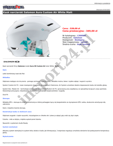 Informacje o produkcie Utworzono 03-03-2017 Kask narciarski Salomon Aura Custom Air White Matt Cena : 539,00 zł Cena promocyjna : 349,00 zł sp or t2 4. p l Nr katalogowy : L366985 Producent : Salomon Dostępność : Dostępny Stan magazynowy : wysoki Średnia ocena : brak recenzji Kask narciarski firmy Salomon model Aura 08 Custom Air kolor White Matt. Opis: Lekki komfortowy kask dla Pań. Wkładka: Odpinana nadająca sie do prania - pomaga zachować higienę kasku. Wkladke można, łatwo i szybko odpiąc i wyprać w pralce. System Custom Air Fit - nowe rozwiązanie stosowane we wkładkach Salomona. Air System umozliwia idealne dopasowanie kasku do kształtu głowy. Oval Fit in System Doc. Master Air - technologia wzorowana na systemie Custom Air Fit, opracowany przy współpracy ze specjalistą leczącym urazy sportowe. Gwarantuje precyzyjne, indywidualne dopasowanie, zwiększa bezpieczeństwo i wygodę. Skorupa: Wkładka EPS + skorupa In-mold to konstrukcja w której poliwęglan łączy się bezpośrednio ze styropianem EPS. Lekka, skutecznie amortyzuje siłę uderzenia. Kask z niepełna twarda skorupą. Konstrukcja kasku w okolicach uszu: Odpinane wygode i ciepłe nauszniki, niezastąpione w chłodne dni. Łatwo je odpiąć gdy zrobi się zbyt ciepło. Futerko - miłe w dotyku, miękkie wykończenie futerka. Nauszniki z systemem Audio Ready System wentylacji: Aktywny system wentylacji to system który działa w kasku jak klimatyzacja, 3 stopniowa regulacja umozliwia obnizenie lub podwyzszenie temperatury głowy. Wykończenie: Wygenerowano w programie www.oscGold.com Matowe wykończenie skorupy to pomalowana metaliczna farba, a następnie zmatowiona powierzchnia kasku. Pasek zapinany pod brodą: Futerkowe wykończenie paska - specjalna, miękka wyściółka w pasku pod brodą. Zapobiega ocieraniu skóry i umozliwiawygodne, precyzyjne dopasowanie kasku. Normy: CE-EN1077 / ASTM F-2040 certyfikowane organizacje uprawnione do testowania i przyznawania certyfikatów produktom spełniającym europejskie (CE) i amerykańskie (ASTM) normy bezpieczeństwa. Kolekcja: 2015 Dostępne opcje Kask narciarski Salomon Aura Custom Air White Matt in sp or t2 4. p l rozmiar: M (56-59).