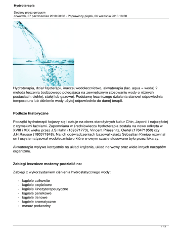 Hydroterapia Dodany przez gorgusm czwartek, 07 października 2010 20:08 - Poprawiony piątek, 06 września 2013 18:38 Hydroterapia, dział fizjoterapii, inaczej wodolecznictwo, akwaterapia (łac. aqua = woda) ? metoda leczenia bodźcowego polegająca na zewnętrznym stosowaniu wody o różnych postaciach: ciekłej, stałej lub gazowej. Podstawę leczniczego działania stanowi odpowiednia temperatura lub ciśnienie wody użytej odpowiednio do danej terapii. Podłoże historyczne Początki hydroterapii kojarzy się i datuje na okres starożytnych kultur Chin, Japonii i najczęściej z rzymskimi łaźniami. Zapomniana w średniowieczu hydroterapia została na nowo odkryta w XVIII i XIX wieku przez J.S.Hahn (1696?1773), Vincent Priessnitz, Oertel (1764?1850) czy J.H.Rausse (1805?1848). Na ich doświadczeniach bazował ksiądz Sebastian Kneipp rozwinął on i usystematyzował wodolecznictwo które w owym czasie stosowane było przez lekarzy. Akwaterapia wpływa korzystnie na układ krążenia, układ nerwowy oraz wiele innych narządów organizmu. Zabiegi lecznicze możemy podzielić na: Zabiegi z wykorzystaniem ciśnienia hydrostatycznego wody: - kąpiele całkowite kąpiele częściowe kąpiele kinezyterapeutyczne kąpiele perełkowe kąpiele tlenowe kąpiele aromatyczne masaż podwodny 1/3 Hydroterapia Dodany przez gorgusm czwartek, 07 października 2010 20:08 - Poprawiony piątek, 06 września 2013 18:38 Zabiegi z wykorzystaniem ciśnienia strumienia wody: - polewanie - natryski stałe - natryski ruchome Zabiegi za pośrednictwem tkanin: - zmywanie nacieranie zawijanie okłady kompresy Hydroterapia, dział fizjoterapii, inaczej wodolecznictwo, akwaterapia (łac. aqua = woda) ? metoda leczenia bodźcowego polegająca na zewnętrznym stosowaniu wody o różnych postaciach: ciekłej, stałej lub gazowej. Podstawę leczniczego działania stanowi odpowiednia temperatura lub ciśnienie wody użytej odpowiednio do danej terapii. Podłoże historyczne Początki hydroterapii kojarzy się i datuje na okres starożytnych kultur Chin, Japonii i najczęściej z rzymskimi łaźniami. Zapomniana w średniowieczu hydroterapia została na nowo odkryta w XVIII i XIX wieku przez J.S.Hahn (1696?1773), Vincent Priessnitz, Oertel (1764?1850) czy J.H.Rausse (1805?1848). Na ich doświadczeniach bazował ksiądz Sebastian Kneipp rozwinął on i usystematyzował wodolecznictwo które w owym czasie stosowane było przez lekarzy. Akwaterapia wpływa korzystnie na układ krążenia, układ nerwowy oraz wiele innych narządów organizmu. Zabiegi lecznicze możemy podzielić na: 1. Zabiegi z wykorzystaniem ciśnienia hydrostatycznego wody: kąpiele całkowite kąpiele częściowe kąpiele kinezyterapeutyczne kąpiele perełkowe kąpiele tlenowe kąpiele aromatyczne masaż podwodny 2. Zabiegi z wykorzystaniem ciśnienia strumienia wody: 2/3 Hydroterapia Dodany przez gorgusm czwartek, 07 października 2010 20:08 - Poprawiony piątek, 06 września 2013 18:38 polewanie natryski stałe natryski ruchome 3. Zabiegi za pośrednictwem tkanin: zmywanie nacieranie zawijanie okłady kompresy 3/3