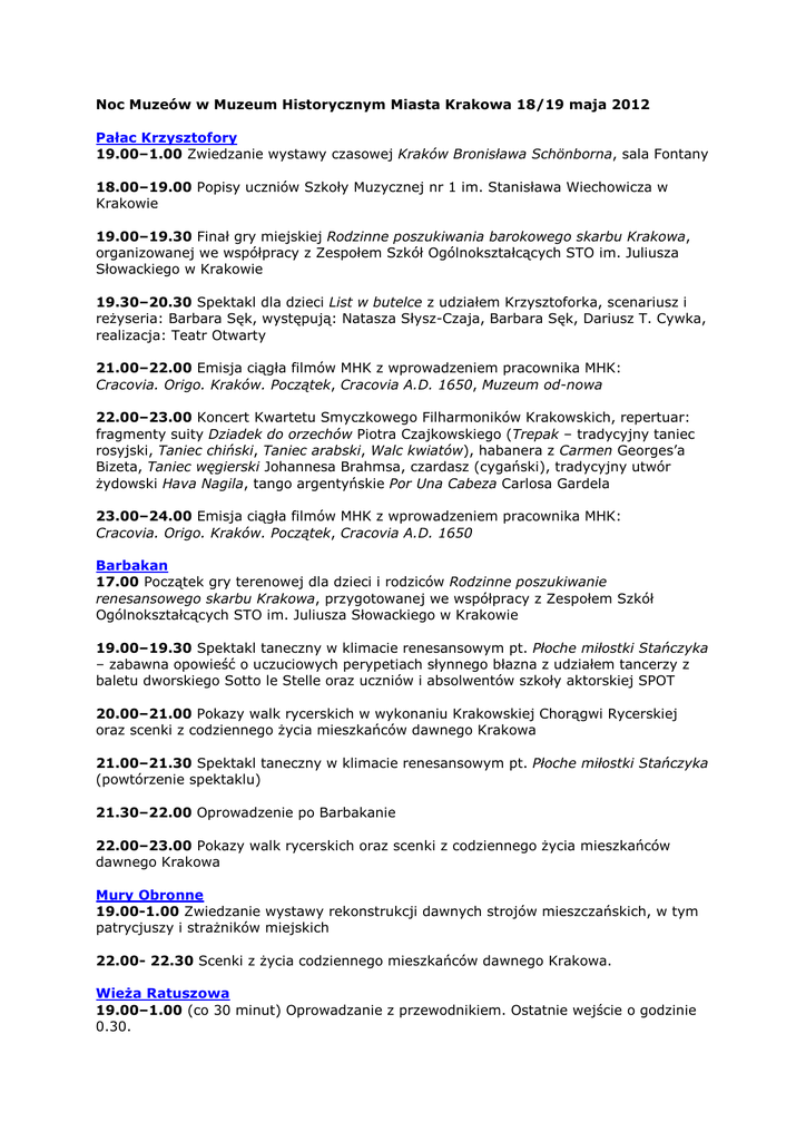 Noc Muzeów w Muzeum Historycznym Miasta Krakowa 18/19 maja 2012 Pałac Krzysztofory 19.00–1.00 Zwiedzanie wystawy czasowej Kraków Bronisława Schönborna, sala Fontany 18.00–19.00 Popisy uczniów Szkoły Muzycznej nr 1 im. Stanisława Wiechowicza w Krakowie 19.00–19.30 Finał gry miejskiej Rodzinne poszukiwania barokowego skarbu Krakowa, organizowanej we współpracy z Zespołem Szkół Ogólnokształcących STO im. Juliusza Słowackiego w Krakowie 19.30–20.30 Spektakl dla dzieci List w butelce z udziałem Krzysztoforka, scenariusz i reżyseria: Barbara Sęk, występują: Natasza Słysz-Czaja, Barbara Sęk, Dariusz T. Cywka, realizacja: Teatr Otwarty 21.00–22.00 Emisja ciągła filmów MHK z wprowadzeniem pracownika MHK: Cracovia. Origo. Kraków. Początek, Cracovia A.D. 1650, Muzeum od-nowa 22.00–23.00 Koncert Kwartetu Smyczkowego Filharmoników Krakowskich, repertuar: fragmenty suity Dziadek do orzechów Piotra Czajkowskiego (Trepak – tradycyjny taniec rosyjski, Taniec chiński, Taniec arabski, Walc kwiatów), habanera z Carmen Georges’a Bizeta, Taniec węgierski Johannesa Brahmsa, czardasz (cygański), tradycyjny utwór żydowski Hava Nagila, tango argentyńskie Por Una Cabeza Carlosa Gardela 23.00–24.00 Emisja ciągła filmów MHK z wprowadzeniem pracownika MHK: Cracovia. Origo. Kraków. Początek, Cracovia A.D. 1650 Barbakan 17.00 Początek gry terenowej dla dzieci i rodziców Rodzinne poszukiwanie renesansowego skarbu Krakowa, przygotowanej we współpracy z Zespołem Szkół Ogólnokształcących STO im. Juliusza Słowackiego w Krakowie 19.00–19.30 Spektakl taneczny w klimacie renesansowym pt. Płoche miłostki Stańczyka – zabawna opowieść o uczuciowych perypetiach słynnego błazna z udziałem tancerzy z baletu dworskiego Sotto le Stelle oraz uczniów i absolwentów szkoły aktorskiej SPOT 20.00–21.00 Pokazy walk rycerskich w wykonaniu Krakowskiej Chorągwi Rycerskiej oraz scenki z codziennego życia mieszkańców dawnego Krakowa 21.00–21.30 Spektakl taneczny w klimacie renesansowym pt. Płoche miłostki Stańczyka (powtórzenie spektaklu) 21.30–22.00 Oprowadzenie po Barbakanie 22.00–23.00 Pokazy walk rycerskich oraz scenki z codziennego życia mieszkańców dawnego Krakowa Mury Obronne 19.00-1.00 Zwiedzanie wystawy rekonstrukcji dawnych strojów mieszczańskich, w tym patrycjuszy i strażników miejskich 22.00- 22.30 Scenki z życia codziennego mieszkańców dawnego Krakowa. Wieża Ratuszowa 19.00–1.00 (co 30 minut) Oprowadzanie z przewodnikiem. Ostatnie wejście o godzinie 0.30. Pierwszeństwo dla osób z rezerwacją dokonaną na stronie www.bilety.mhk.pl W programie: – Wieża od podszewki – zwiedzanie Wieży Ratuszowej z przewodnikiem – Ratusz sprzed wieków – prezentacja rekonstrukcji ratusza miejskiego (od XIV do XVIII wieku), makieta i plansze ilustrujące przemiany architektoniczne ratusza Kamienica Hipolitów 19.00–1.00 Zwiedzanie wystawy stałej Mieszczański dom oraz czasowej Kraków Bronisława Schönborna 19.00–0.30 Tradycyjne sceny z nocnego życia solidnego stadła – czyli nocne małżonków rozmowy oraz dyskretne działania około rodzinnego szczęścia. Wykonawcy: Łukasz Lech i Ewa van Vees 19.00–23.00 Opowieści i pokazy cyrulika, przygotowującego driakwie i maści oraz inne medykamenty, opowiadającego, jakim sposobem je zażywać. Prezentacja przygotowana we współpracy ze sklepem historycznym Mariusza Wolnego. W rolę cyrulika wcieli się dr Ryszard Gryglewski 20.00–22.00 Popisy lirnika grającego na starej lirze przed Kamienicą Hipolitów – Jan Malisz Dom pod Krzyżem Miejsce: dziedziniec Domu pod Krzyżem, wejście od parkingu, plac św. Ducha 18.00–19.00 Warsztaty plastyczne dla dzieci – przygotowanie: Alicja KarczmarskaStrzebońska z Teatru Lalki, Maski i Aktora Groteska w Krakowie 19.00–19.40 Spektakl teatralny Bajka o Szewczyku – wykonanie: Rafał Szumski, artysta Teatru Lalki, Maski i Aktora Groteska w Krakowie 19.40–20.30 Warsztaty plastyczne dla dzieci - prowadzenie: Karina Janik, Muzeum Historyczne Miasta Krakowa 20.30–21.00 Prezentacja nowej wystawy stałej w Oddziale Teatralnym MHK 21.00–23.00 Warsztaty Techniki cieniowe w teatrze dla dorosłych – prowadzenie: Bartosz Watemborski i Lech Walicki artyści Teatru Lalki, Maski i Aktora Groteska w Krakowie Dom Zwierzyniecki Tu, gdzie Lenin mówił dobranoc… 19.00–1.00 Zwiedzanie wystawy czasowej Krakowskie tradycje. Emaus na Zwierzyńcu oraz miniwystawy stałej Przedmieścia zwierzynieckie 100 lat temu 19.00–21.00 Warsztaty dla dzieci: Tworzymy wielkie drzewko życia. Wokół miniwystawy stałej Przedmieścia zwierzynieckie 100 lat temu: przygotowujemy i smakujemy kuchnię dawnego Zwierzyńca, poznajemy bibeloty przedmiejskiego domu. Początek warsztatów w muzealnym ogrodzie 19.12–21.00 Prezentacja wybranych eksponatów Muzeum Historycznego Miasta Krakowa z kolekcji Leniniana. Debata Dom Lenina – trudne sąsiedztwo, udział wezmą reprezentanci rodziny Malików: Stanisław, Anna, Cecylia oraz redaktor Michał Kozioł, który nakreśli historyczny obraz Krakowa lat 1910–1914 21.00 Projekcja filmu dokumentalnego w reżyserii Jerzego Ridana Lenin z Krakowa. Po projekcji rozmowa z autorem i bohaterami filmu: reżyserem i dokumentalistą Jerzym Ridanem oraz Pawłem Chojnackim, historykiem i publicystą 23.55–1.00 Jazz na Zwierzyńcu o północy: RYSZARD STYŁA & BOHATER live! Do dyspozycji muzealno-emausowy plac zabaw w ogrodzie – wspólnie grillujemy i częstujemy sznyclem w bułce. Stara Synagoga 19.00–1.00 Zwiedzanie wystawy stałej Dzieje i kultura Żydów i czasowej To była hebrajska szkoła w Krakowie. Gimnazjum hebrajskie 1918–1939. 19.00–1.00 Razem piszemy Torę. Przepisywanie tekstu Tory na zwój w jednym spośród 11 języków 19.00–22.00 Prośby do Pana Boga – zapisywanie imion w świętym języku i telefon do Nieba 19.30–20.00 Jak powstaje zwój Tory? – prezentacja: Anna Jodłowiec-Dziedzi