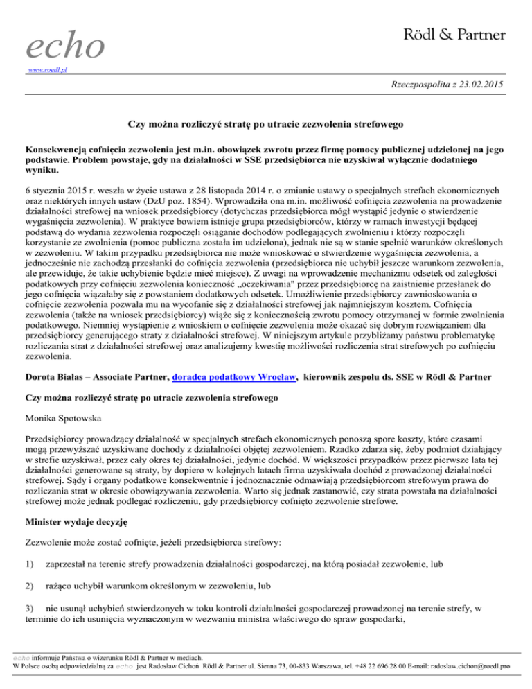 echo www.roedl.pl Rzeczpospolita z 23.02.2015 Czy można rozliczyć stratę po utracie zezwolenia strefowego Konsekwencją cofnięcia zezwolenia jest m.in. obowiązek zwrotu przez firmę pomocy publicznej udzielonej na jego podstawie. Problem powstaje, gdy na działalności w SSE przedsiębiorca nie uzyskiwał wyłącznie dodatniego wyniku. 6 stycznia 2015 r. weszła w życie ustawa z 28 listopada 2014 r. o zmianie ustawy o specjalnych strefach ekonomicznych oraz niektórych innych ustaw (DzU poz. 1854). Wprowadziła ona m.in. możliwość cofnięcia zezwolenia na prowadzenie działalności strefowej na wniosek przedsiębiorcy (dotychczas przedsiębiorca mógł wystąpić jedynie o stwierdzenie wygaśnięcia zezwolenia). W praktyce bowiem istnieje grupa przedsiębiorców, którzy w ramach inwestycji będącej podstawą do wydania zezwolenia rozpoczęli osiąganie dochodów podlegających zwolnieniu i którzy rozpoczęli korzystanie ze zwolnienia (pomoc publiczna została im udzielona), jednak nie są w stanie spełnić warunków określonych w zezwoleniu. W takim przypadku przedsiębiorca nie może wnioskować o stwierdzenie wygaśnięcia zezwolenia, a jednocześnie nie zachodzą przesłanki do cofnięcia zezwolenia (przedsiębiorca nie uchybił jeszcze warunkom zezwolenia, ale przewiduje, że takie uchybienie będzie mieć miejsce). Z uwagi na wprowadzenie mechanizmu odsetek od zaległości podatkowych przy cofnięciu zezwolenia konieczność „oczekiwania" przez przedsiębiorcę na zaistnienie przesłanek do jego cofnięcia wiązałaby się z powstaniem dodatkowych odsetek. Umożliwienie przedsiębiorcy zawnioskowania o cofnięcie zezwolenia pozwala mu na wycofanie się z działalności strefowej jak najmniejszym kosztem. Cofnięcia zezwolenia (także na wniosek przedsiębiorcy) wiąże się z koniecznością zwrotu pomocy otrzymanej w formie zwolnienia podatkowego. Niemniej wystąpienie z wnioskiem o cofnięcie zezwolenia może okazać się dobrym rozwiązaniem dla przedsiębiorcy generującego straty z działalności strefowej. W niniejszym artykule przybliżamy państwu problematykę rozliczania strat z działalności strefowej oraz analizujemy kwestię możliwości rozliczenia strat strefowych po cofnięciu zezwolenia. Dorota Białas – Associate Partner, doradca podatkowy Wrocław, kierownik zespołu ds. SSE w Rödl & Partner Czy można rozliczyć stratę po utracie zezwolenia strefowego Monika Spotowska Przedsiębiorcy prowadzący działalność w specjalnych strefach ekonomicznych ponoszą spore koszty, które czasami mogą przewyższać uzyskiwane dochody z działalności objętej zezwoleniem. Rzadko zdarza się, żeby podmiot działający w strefie uzyskiwał, przez cały okres tej działalności, jedynie dochód. W większości przypadków przez pierwsze lata tej działalności generowane są straty, by dopiero w kolejnych latach firma uzyskiwała dochód z prowadzonej działalności strefowej. Sądy i organy podatkowe konsekwentnie i jednoznacznie odmawiają przedsiębiorcom strefowym prawa do rozliczania strat w okresie obowiązywania zezwolenia. Warto się jednak zastanowić, czy strata powstała na działalności strefowej może jednak podlegać rozliczeniu, gdy przedsiębiorcy cofnięto zezwolenie strefowe. Minister wydaje decyzję Zezwolenie może zostać cofnięte, jeżeli przedsiębiorca strefowy: 1) zaprzestał na terenie strefy prowadzenia działalności gospodarczej, na którą posiadał zezwolenie, lub 2) rażąco uchybił warunkom określonym w zezwoleniu, lub 3) nie usunął uchybień stwierdzonych w toku kontroli działalności gospodarczej prowadzonej na terenie strefy, w terminie do ich usunięcia wyznaczonym w wezwaniu ministra właściwego do spraw gospodarki, echo informuje Państwa o wizerunku Rödl & Partner w mediach. W Polsce osobą odpowiedzialną za echo jest Radosław Cichoń Rödl & Partner ul. Sienna 73, 00-833 Warszawa, tel. +48 22 696 28 00 E-mail: [email protected] 4) jeżeli wystąpił z takim wnioskiem przedsiębiorca strefowy (art. 19 ust. 3 ustawy z 20 października 1994 r. o specjalnych strefach ekonomicznych). Ta zasada ma zastosowanie od 6 stycznia 2015 r. Dla przedsiębiorcy uzyskującego ujemne wyniki podatkowe pozostawanie w strefie może nie być opłacalne z uwagi na brak możliwości uwzględnienia generowanej straty w rozliczeniach podatkowych. Dlatego czasami lepiej wystąpić o cofnięcie zezwolenia, niż nadal generować straty, które nie będą stratami podatkowymi. Wprowadzona możliwość wystąpienia przez przedsiębiorcę strefowego z wnioskiem o cofnięcie zezwolenia podyktowana jest zmianą regulacji dotyczących wygaśnięcia zezwolenia strefowego od 6 stycznia tego roku. Do czasu wejścia w życie nowelizacji przedsiębiorca mógł wystąpić jedynie o stwierdzenie wygaśnięcia zezwolenia. Gdy trzeba oddać korzyści Cofnięcie zezwolenia ma co do zasady charakter sankcyjny. Jest ono konsekwencją niewywiązywania się przez przedsiębiorcę z warunków określonych w zezwoleniu, w szczególności w odniesieniu do wysokości wydatków inwestycyjnych, liczby utworzonych miejsc pracy czy ich utrzymania przez wskazany w zezwoleniu okres. Skutkiem cofnięcia zezwolenia jest konieczność zwrotu wykorzystanej przez przedsiębiorcę pomocy publicznej w formie zwolnienia od podatku. Dotychczas odbywało się to zgodnie z art. 17 ust. 5 ustawy o CIT lub art. 21 ust. 5b ustawy o PIT. Zwrot dotyczył podatku za lata, za które zobowiązanie podatkowe nie uległo jeszcze przedawnieniu, czyli nie więcej niż pięć lat, od końca roku kalendarzowego, w którym upłynął termin płatności podatku (art. 70 § 1 ordynacji podatkowej). Nie było również konieczności naliczania odsetek od zaległości podatkowych. Nowe zasady od 6 stycznia Od 6 stycznia 2015 r. skutki cofnięcia zezwolenia wynikają również z ustawy o specjalnych strefach ekonomicznych (art. 12b). Konsekwencją cofnięcia zezwolenia jest m.in. obowiązek zw