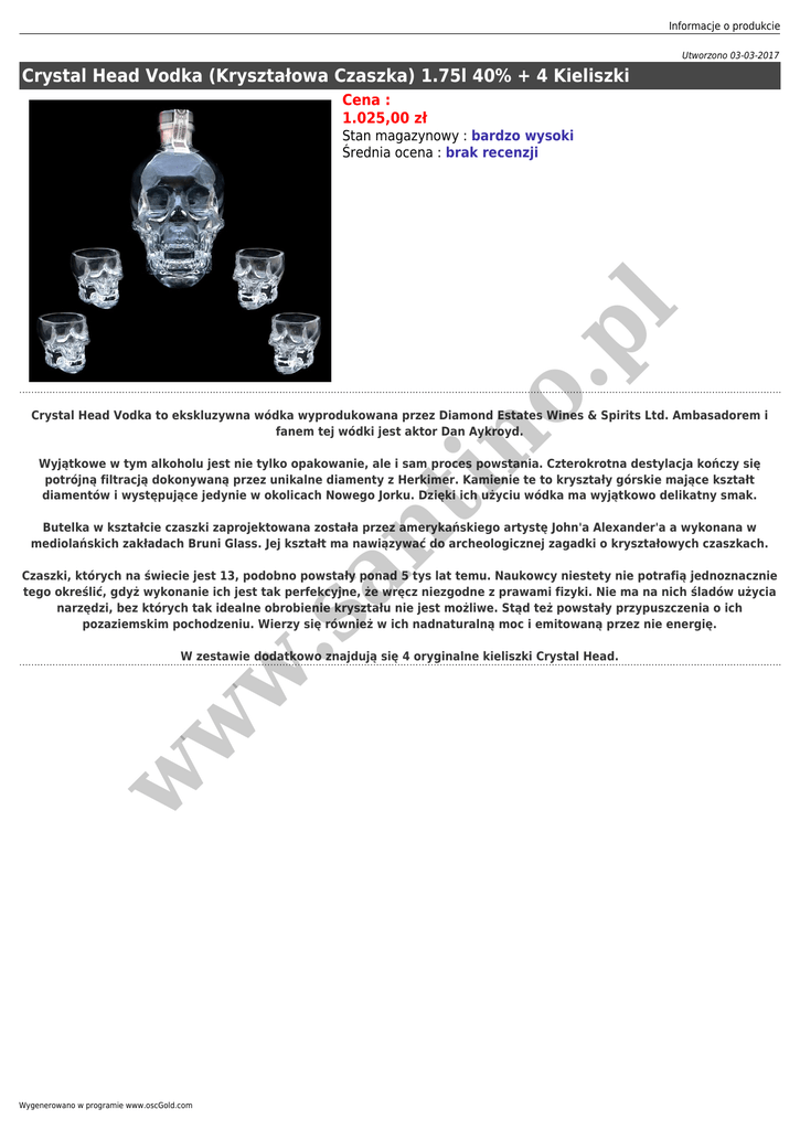 Informacje o produkcie Utworzono 03-03-2017 Crystal Head Vodka (Kryształowa Czaszka) 1.75l 40% + 4 Kieliszki Cena : 1.025,00 zł in o. pl Stan magazynowy : bardzo wysoki Średnia ocena : brak recenzji Crystal Head Vodka to ekskluzywna wódka wyprodukowana przez Diamond Estates Wines & Spirits Ltd. Ambasadorem i fanem tej wódki jest aktor Dan Aykroyd. an t Wyjątkowe w tym alkoholu jest nie tylko opakowanie, ale i sam proces powstania. Czterokrotna destylacja kończy się potrójną filtracją dokonywaną przez unikalne diamenty z Herkimer. Kamienie te to kryształy górskie mające kształt diamentów i występujące jedynie w okolicach Nowego Jorku. Dzięki ich użyciu wódka ma wyjątkowo delikatny smak. Butelka w kształcie czaszki zaprojektowana została przez amerykańskiego artystę John'a Alexander'a a wykonana w mediolańskich zakładach Bruni Glass. Jej kształt ma nawiązywać do archeologicznej zagadki o kryształowych czaszkach. .s Czaszki, których na świecie jest 13, podobno powstały ponad 5 tys lat temu. Naukowcy niestety nie potrafią jednoznacznie tego określić, gdyż wykonanie ich jest tak perfekcyjne, że wręcz niezgodne z prawami fizyki. Nie ma na nich śladów użycia narzędzi, bez których tak idealne obrobienie kryształu nie jest możliwe. Stąd też powstały przypuszczenia o ich pozaziemskim pochodzeniu. Wierzy się również w ich nadnaturalną moc i emitowaną przez nie energię. w w w W zestawie dodatkowo znajdują się 4 oryginalne kieliszki Crystal Head. Wygenerowano w programie www.oscGold.com