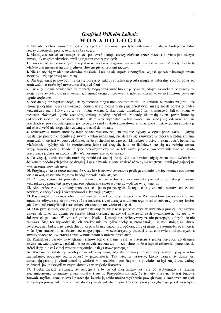 1 Gottfried Wilhelm Leibniz MONADOLOGIA 1. Monada, o której mówić tu będziemy - jest niczym innym jak tylko substancja prostą, wchodząca w skład rzeczy złożonych; prostą, to znaczy bez części. 2. Muszą zaś istnieć substancje proste, ponieważ istnieją rzeczy złożone; rzecz złożona bowiem jest niczym innym, jak nagromadzeniem czyli agregatem rzeczy prostych. 3. Tam zaś, gdzie nie ma części, nie jest możliwa ani rozciągłość, ani kształt, ani podzielność. Monady te są tedy właściwymi atomami natury i jednym słowem pierwiastkami rzeczy. 4. Nie należy się w nich też obawiać rozkładu, i nie da się zupełnie pomyśleć, w jaki sposób substancja prosta mogłaby, zginąć drogą naturalną. 5. Dla tego samego powodu nie da się pomyśleć jakoby substancja prosta mogła w naturalny sposób powstać, ponieważ nie może być utworzona drogą złożenia. 6. Tak więc można powiedzieć, że monady mogą powstawać lub ginąć tylko za jednym zamachem, to znaczy, że mogą powstać tylko drogą stworzenia, a zginąć drogą unicestwienia, gdy tymczasem to co jest złożone powstaje i ginie częściami. 7. Nie da się też wytłumaczyć, jak by monada mogła ulec przeistoczeniu lub zmianie w swoim wnętrzu " ze strony jakiej innej rzeczy stworzonej, ponieważ me można w niej nic przestawić, ani się nie da pomyśleć żaden wewnętrzny ruch, który ; by w niej można wzniecić, skierować, zwiększyć lub .zmniejszyć, Jałt to można w rzeczach złożonych, gdzie zachodzą zmiany między częściami. Monady nie mają okien, przez które by cokolwiek mogło się do nich dostać lub z nich wydostać. Właściwości nie mogą się oderwać ani się przechadzać poza substancjami, jak to ongiś czyniły jakości zmysłowe scholastyków. Tak więc ani substancja ani właściwość nie mogą się z zewnątrz dostać do monady. 8. Jednakowoż muszą monady mieć pewne właściwości, inaczej nie byłyby w ogóle jestestwami. I gdyby substancje proste nie różniły się swymi - właściwościami, nie dałaby się zauważyć w rzeczach żadna zmiana, ponieważ to, co jest w rzeczy złożonej, może pochodzić jedynie od składników prostych; monady zaś, będąc bez właściwości, byłyby nie do rozróżnienia jedne od drugich, jako że ilościowo też się nie różnią: zatem, przypuściwszy pełnię, każde miejsce otrzymywałoby na skutek ruchu jedynie równoważnik tego co miało przedtem, i jeden stan rzeczy byłby nierozeznawalny od drugiego. 9. Co więcej, każda monada musi się różnić od każdej innej. Nie ma bowiem nigdy w naturze dwóch istot doskonale podobnych jedna do drugiej, i gdzie by nie można znaleźć różnicy wewnętrznej czyli polegającej na wyznaczeniu wewnętrznym. 10. Przyjmuję też za rzecz uznaną, że wszelkie jestestwo stworzone podlega zmianie, a więc monada stworzona też, a nawet, że zmiana ta jest w każdej monadzie nieustająca, 11. Z tego, cośmy tu powiedzieli, wynika, że .naturalne zmiany monady pochodzą od jakiejś zasady wewnętrznej, ponieważ przyczyna zewnętrzna nie może wywierać wpływu w jej wnętrzu. 12. Ale oprócz zasady zmiany musi istnieć i jakaś poszczególność tego, co się zmienia, stanowiąca, że tak powiem, o specyfikacji i różnorodności substancji prostych. 13. Poszczególność ta musi obejmować wielość w jedności czyli w prostocie. Ponieważ bowiem wszelka zmiana naturalna odbywa się stopniowo, coś się zmienia, a coś zostaje; skutkiem tego musi w substancji prostej istnieć jakaś wielość modyfikacji i stosunków, chociaż nie ma wielości części. 14. Stan przejściowy, obejmujący i przedstawiający wielość w jedności czyli w substancji prostej, jest niczym innym jak tylko tak zwaną percepcją, którą odróżnić należy od apercepcji czyli świadomości, jak się to w dalszym ciągu okaże. W tym też grubo pobłądzili Kartezjanie, policzywszy za nic percepcje, których się nie zauważa. Stąd też wywodzi się ich przekonanie, że tylko duchy są monadami6, i że nie istnieją ani dusze zwierzęce ani żadne inne entelechie, oraz powikłanie, zgodnie z ogółem, długiej utraty przytomności ze śmiercią w ścisłym znaczeniu, na skutek też czego popadli w scholastyczny przesąd dusz całkowicie odłączonych, a umysły spaczone utwierdzili nawet w mniemaniu o śmiertelności dusz. 15. Działalność zasady wewnętrznej, stanowiąca o zmianie, czyli o przejściu z jednej percepcji do drugiej, można nazwać apetycją : pożądanie co prawda nie zawsze i niezupełnie może osiągnąć całkowitą percepcję, do której dąży, ale coś z niej zawsze otrzymuje i osiąga nowe percepcje. 16. Wielości w substancji prostej doświadczamy sami, gdy stwierdzamy. że najmniejsza myśl, jaką w sobie zauważamy, obejmuje różnorodność w przedmiocie. Tak więc ci wszyscy, którzy uznają, że dusza jest substancją prostą, powinni uznać tę wielość w monadzie, i pan Bayle nie powinien tu był znajdować żadnej trudności, jak to uczynił w swym słowniku w artykule Rorarius. 17. Trzeba zresztą przyznać, że percepcja i to co od niej zależy jest nie do wytłumaczenia racjami mechanicznymi, to znaczy przez kształty i ruchy. Przypuściwszy zaś, że istnieje maszyna, której budowa pozwala myśleć, czuć, miewać percepcje, będzie ją sobie można wyobrazić powiększoną z zachowaniem tych samych proporcji, tak żeby można do niej wejść jak do młyna. Co założywszy, i oglądając ją od wewnątrz, 2 znajdzie się tylko części popychające jedna drugą, a nigdy nic, co by wytłumaczyło jakąkolwiek percepcję. Trzeba jej tedy szukać w substancji prostej, a nie w rzeczy złożonej, •ani w maszynie. Nic też innego w substancji prostej znaleźć nie można jak właśnie to: percepcje i ich zmiany. Na tym też jedynie maga polegać wszystkie czynności wewnętrzne substancji prostych. 18. Wszystkie substancje, proste czy monady stworzone można by nazw