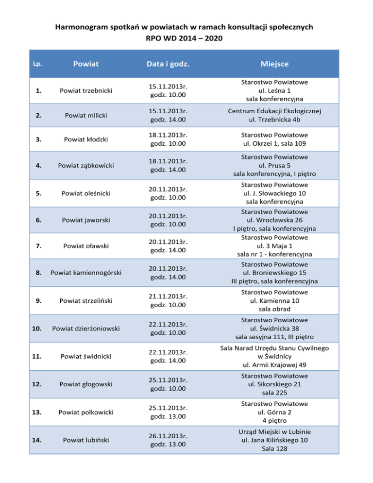Harmonogram spotkań w powiatach w ramach konsultacji społecznych RPO WD 2014 – 2020 Powiat Lp. Data i godz. Miejsce Starostwo Powiatowe ul. Leśna 1 sala konferencyjna 1. 5 Powiat trzebnicki 15.11.2013r. godz. 10.00 2. 6 Powiat milicki 15.11.2013r. godz. 14.00 Centrum Edukacji Ekologicznej ul. Trzebnicka 4b Powiat kłodzki 18.11.2013r. godz. 10.00 Starostwo Powiatowe ul. Okrzei 1, sala 109 Powiat ząbkowicki 18.11.2013r. godz. 14.00 Starostwo Powiatowe ul. Prusa 5 sala konferencyjna, I piętro 3. 4. 5. 7 Powiat oleśnicki 20.11.2013r. godz. 10.00 6. Powiat jaworski 20.11.2013r. godz. 10.00 7. 8 Powiat oławski 20.11.2013r. godz. 14.00 Starostwo Powiatowe ul. J. Słowackiego 10 sala konferencyjna Starostwo Powiatowe ul. Wrocławska 26 I piętro, sala konferencyjna Starostwo Powiatowe ul. 3 Maja 1 sala nr 1 - konferencyjna Starostwo Powiatowe ul. Broniewskiego 15 III piętro, sala konferencyjna Powiat kamiennogórski 20.11.2013r. godz. 14.00 Powiat strzeliński 21.11.2013r. godz. 10.00 Starostwo Powiatowe ul. Kamienna 10 sala obrad Powiat dzierżoniowski 22.11.2013r. godz. 10.00 Starostwo Powiatowe ul. Świdnicka 38 sala sesyjna 111, III piętro Powiat świdnicki 22.11.2013r. godz. 14.00 Sala Narad Urzędu Stanu Cywilnego w Świdnicy ul. Armii Krajowej 49 Powiat głogowski 25.11.2013r. godz. 10.00 Starostwo Powiatowe ul. Sikorskiego 21 sala 225 13. Powiat polkowicki 25.11.2013r. godz. 13.00 Starostwo Powiatowe ul. Górna 2 4 piętro 14. Powiat lubiński 26.11.2013r. godz. 13.00 Urząd Miejski w Lubinie ul. Jana Kilińskiego 10 Sala 128 8. 9. 10. 11. 12. 15. Powiat bolesławiecki 26.11.2013r. godz. 14.00 Teatr Stary, ul. Teatralna 1 16. 1 Powiat wołowski 0 26.11.2013r. godz. 14.00 17. Powiat lubański 27.11.2013r. godz. 10.00 18. Powiat średzki 27.11.2013r. godz. 14.00 19. Powiat zgorzelecki 27.11.2013r. godz. 14.00 Starostwo Powiatowe ul. Boh. II Armii WP 8A 20. Powiat złotoryjski 28.11.2013r. godz. 10.00 Starostwo Powiatowe pl. Niepodległości 8 21. 1 Powiat górowski 1 29.11.2013r. godz. 10.00 Starostwo Powiatowe ul. Mickiewicza 1 sala nr 1 22. 1 Powiat lwówecki 2 29.11.2013r. godz. 9.00 Starostwo Powiatowe Aleja Wojska Polskiego 25 Starostwo Powiatowe pl. Piastowski 2 sala sesyjna (nr 18) Zespół Szkół Ponadgimnazjalnych im. Adama Mickiewicza, ul. Władysława Łokietka 2 Aula Starostwo Powiatowe ul. Wrocławska 2 sala konferencyjna