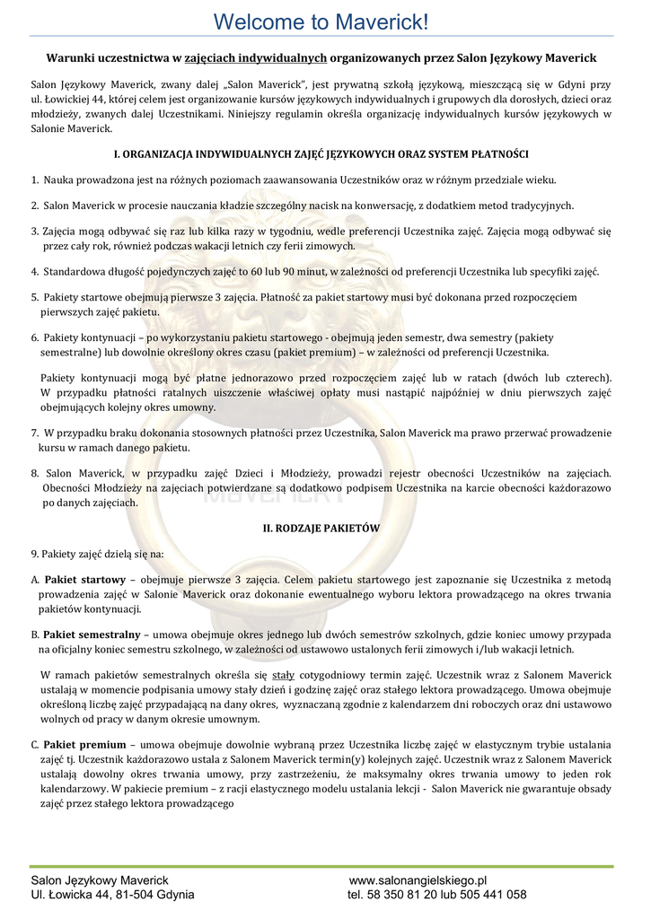 Welcome to Maverick! Warunki uczestnictwa w zajęciach indywidualnych organizowanych przez Salon Językowy Maverick Salon Językowy Maverick, zwany dalej „Salon Maverick”, jest prywatną szkołą językową, mieszczącą się w Gdyni przy ul. Łowickiej 44, której celem jest organizowanie kursów językowych indywidualnych i grupowych dla dorosłych, dzieci oraz młodzieży, zwanych dalej Uczestnikami. Niniejszy regulamin określa organizację indywidualnych kursów językowych w Salonie Maverick. I. ORGANIZACJA INDYWIDUALNYCH ZAJĘĆ JĘZYKOWYCH ORAZ SYSTEM PŁATNOŚCI 1. Nauka prowadzona jest na różnych poziomach zaawansowania Uczestników oraz w różnym przedziale wieku. 2. Salon Maverick w procesie nauczania kładzie szczególny nacisk na konwersację, z dodatkiem metod tradycyjnych. 3. Zajęcia mogą odbywać się raz lub kilka razy w tygodniu, wedle preferencji Uczestnika zajęć. Zajęcia mogą odbywać się przez cały rok, również podczas wakacji letnich czy ferii zimowych. 4. Standardowa długość pojedynczych zajęć to 60 lub 90 minut, w zależności od preferencji Uczestnika lub specyfiki zajęć. 5. Pakiety startowe obejmują pierwsze 3 zajęcia. Płatność za pakiet startowy musi być dokonana przed rozpoczęciem pierwszych zajęć pakietu. 6. Pakiety kontynuacji – po wykorzystaniu pakietu startowego - obejmują jeden semestr, dwa semestry (pakiety semestralne) lub dowolnie określony okres czasu (pakiet premium) – w zależności od preferencji Uczestnika. Pakiety kontynuacji mogą być płatne jednorazowo przed rozpoczęciem zajęć lub w ratach (dwóch lub czterech). W przypadku płatności ratalnych uiszczenie właściwej opłaty musi nastąpić najpóźniej w dniu pierwszych zajęć obejmujących kolejny okres umowny. 7. W przypadku braku dokonania stosownych płatności przez Uczestnika, Salon Maverick ma prawo przerwać prowadzenie kursu w ramach danego pakietu. 8. Salon Maverick, w przypadku zajęć Dzieci i Młodzieży, prowadzi rejestr obecności Uczestników na zajęciach. Obecności Młodzieży na zajęciach potwierdzane są dodatkowo podpisem Uczestnika na karcie obecności każdorazowo po danych zajęciach. II. RODZAJE PAKIETÓW 9. Pakiety zajęć dzielą się na: A. Pakiet startowy – obejmuje pierwsze 3 zajęcia. Celem pakietu startowego jest zapoznanie się Uczestnika z metodą prowadzenia zajęć w Salonie Maverick oraz dokonanie ewentualnego wyboru lektora prowadzącego na okres trwania pakietów kontynuacji. B. Pakiet semestralny – umowa obejmuje okres jednego lub dwóch semestrów szkolnych, gdzie koniec umowy przypada na oficjalny koniec semestru szkolnego, w zależności od ustawowo ustalonych ferii zimowych i/lub wakacji letnich. W ramach pakietów semestralnych określa się stały cotygodniowy termin zajęć. Uczestnik wraz z Salonem Maverick ustalają w momencie podpisania umowy stały dzień i godzinę zajęć oraz stałego lektora prowadzącego. Umowa obejmuje określoną liczbę zajęć przypadającą na dany okres, wyznaczaną zgodnie z kalendarzem dni roboczych oraz dni ustawowo wolnych od pracy w danym okresie umownym. C. Pakiet premium – umowa obejmuje dowolnie wybraną przez Uczestnika liczbę zajęć w elastycznym trybie ustalania zajęć tj. Uczestnik każdorazowo ustala z Salonem Maverick termin(y) kolejnych zajęć. Uczestnik wraz z Salonem Maverick ustalają dowolny okres trwania umowy, przy zastrzeżeniu, że maksymalny okres trwania umowy to jeden rok kalendarzowy. W pakiecie premium – z racji elastycznego modelu ustalania lekcji - Salon Maverick nie gwarantuje obsady zajęć przez stałego lektora prowadzącego Salon Językowy Maverick Ul. Łowicka 44, 81-504 Gdynia www.salonangielskiego.pl tel. 58 350 81 20 lub 505 441 058 Welcome to Maverick! 10. W przypadku wyboru zajęć tylko z native speakerem Salon Maverick ma prawo przeprowadzić część zajęć w ramach danego pakietu z polskim lektorem (w wypadku chorób, urlopów, czynników niezależnych). 11. W przypadku wyboru zajęć tylko z polskim lektorem część zajęć może, ale nie musi, odbyć się z native speakerem. 12. Lektorzy prowadzący są dobierani do zajęć pod kątem preferencji Uczestnika oraz ogólnej dostępności czasowej oraz logistycznej lektorów. 13. W przypadku stałej zmiany lektora prowadzącego (przyczyny losowe, niezależne od Salonu Maverick, zmiana miejsca zamieszkania lektora itd.), Uczestnik ma możliwość rezygnacji z umowy i zwrotu pieniędzy za niewykorzystane zajęcia lub odbycia kolejnych zajęć z innym lektorem. III. USTALANIE TERMINÓW ZAJĘĆ INDYWIDUALNYCH, ZASADY ICH ODWOŁANIA ORAZ ODROBIENIA 14. Wszystkie ustalenia muszą odbywać się z pracownikami Biura lub przez wybrany wspólnie przez Uczestnika oraz Salon Maverick kanał komunikacji (sms, email, telefon). Ustalenia z lektorami nie będą uznawane jako wiążące. 15. Oficjalne godziny pracy Biura to 9.00-19.00 od poniedziałku do czwartku oraz 9.00-15.00 w piątki. Adres email Salonu Maverick: [email protected]; numer kontaktowy komórkowy: 505 441 058. 16. W przypadku zajęć odbywających się poza oficjalnymi godzinami pracy Biura, wszystkie odwołania lub ustalenia dotyczące terminów kolejnych zajęć muszą być potwierdzone przez Uczestnika mailowo lub poprzez sms na właściwe adresy lub telefony biurowe. W innym przypadku wcześniej ustalone zajęcia będą uznawane za potwierdzone i traktowane jako pełnopłatne. 17. Każda zmiana lub odwołanie ustalonego terminu kolejnych zajęć zostaną potwierdzone smsowo lub mailowo przez Pracowników Biura Salonu Maverick. 18. Odwołania przez Uczestnika zaplanowanych zajęć na kolejny dzień muszą być dokonane do godziny 18.00 poprzedzającego dnia roboczego. W takim przypadku zajęcia nie są traktowane jako pełnopłatne. Odwołania zajęć poniedziałkowych muszą być dokonane do godziny 12.00 w poprzedzającą dane zajęcia sobotę (sms, email). Zajęcia odwoływane przez Uczestnika po godz. 18