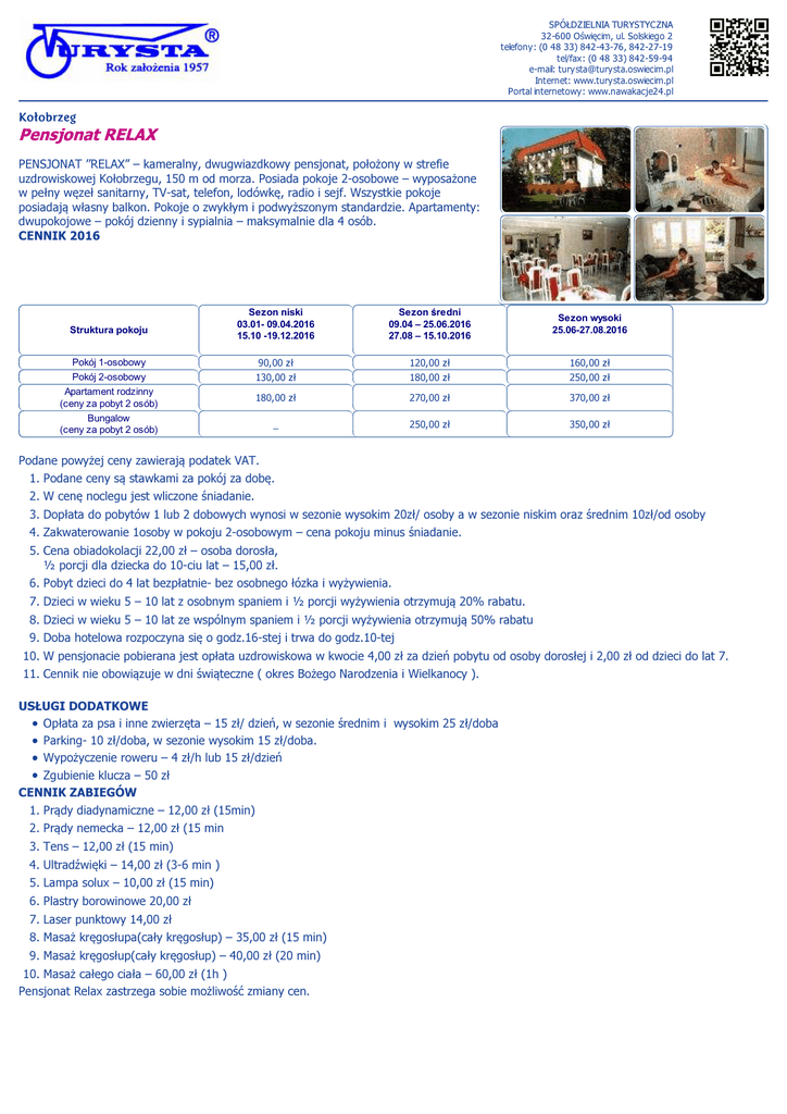 SPÓŁDZIELNIA TURYSTYCZNA 32-600 Oświęcim, ul. Solskiego 2 telefony: (0 48 33) 842-43-76, 842-27-19 tel/fax: (0 48 33) 842-59-94 e-mail: [email protected] Internet: www.turysta.oswiecim.pl Portal internetowy: www.nawakacje24.pl Pensjonat RELAX PENSJONAT ’’RELAX” – kameralny, dwugwiazdkowy pensjonat, położony w strefie uzdrowiskowej Kołobrzegu, 150 m od morza. Posiada pokoje 2-osobowe – wyposażone w pełny węzeł sanitarny, TV-sat, telefon, lodówkę, radio i sejf. Wszystkie pokoje posiadają własny balkon. Pokoje o zwykłym i podwyższonym standardzie. Apartamenty: dwupokojowe – pokój dzienny i sypialnia – maksymalnie dla 4 osób. CENNIK 2016 Struktura pokoju Sezon niski 03.01- 09.04.2016 15.10 -19.12.2016 Sezon średni 09.04 – 25.06.2016 27.08 – 15.10.2016 Sezon wysoki 25.06-27.08.2016 90,00 zł 130,00 zł 120,00 zł 180,00 zł 160,00 zł 250,00 zł 180,00 zł 270,00 zł 370,00 zł _ 250,00 zł 350,00 zł Pokój 1-osobowy Pokój 2-osobowy Apartament rodzinny (ceny za pobyt 2 osób) Bungalow (ceny za pobyt 2 osób) Podane powyżej ceny zawierają podatek VAT. 1. Podane ceny są stawkami za pokój za dobę. 2. W cenę noclegu jest wliczone śniadanie. 3. Dopłata do pobytów 1 lub 2 dobowych wynosi w sezonie wysokim 20zł/ osoby a w sezonie niskim oraz średnim 10zł/od osoby 4. Zakwaterowanie 1osoby w pokoju 2-osobowym – cena pokoju minus śniadanie. 5. Cena obiadokolacji 22,00 zł – osoba dorosła, ½ porcji dla dziecka do 10-ciu lat – 15,00 zł. 6. Pobyt dzieci do 4 lat bezpłatnie- bez osobnego łózka i wyżywienia. 7. Dzieci w wieku 5 – 10 lat z osobnym spaniem i ½ porcji wyżywienia otrzymują 20% rabatu. 8. Dzieci w wieku 5 – 10 lat ze wspólnym spaniem i ½ porcji wyżywienia otrzymują 50% rabatu 9. Doba hotelowa rozpoczyna się o godz.16-stej i trwa do godz.10-tej 10. W pensjonacie pobierana jest opłata uzdrowiskowa w kwocie 4,00 zł za dzień pobytu od osoby dorosłej i 2,00 zł od dzieci do lat 7. 11. Cennik nie obowiązuje w dni świąteczne ( okres Bożego Narodzenia i Wielkanocy ). USŁUGI DODATKOWE Opłata za psa i inne zwierzęta – 15 zł/ dzień, w sezonie średnim i wysokim 25 zł/doba Parking- 10 zł/doba, w sezonie wysokim 15 zł/doba. Wypożyczenie roweru – 4 zł/h lub 15 zł/dzień Zgubienie klucza – 50 zł CENNIK ZABIEGÓW 1. Prądy diadynamiczne – 12,00 zł (15min) 2. Prądy nemecka – 12,00 zł (15 min 3. Tens – 12,00 zł (15 min) 4. Ultradźwięki – 14,00 zł (3-6 min ) 5. Lampa solux – 10,00 zł (15 min) 6. Plastry borowinowe 20,00 zł 7. Laser punktowy 14,00 zł 8. Masaż kręgosłupa(cały kręgosłup) – 35,00 zł (15 min) 9. Masaż kręgosłup(cały kręgosłup) – 40,00 zł (20 min) 10. Masaż całego ciała – 60,00 zł (1h ) Pensjonat Relax zastrzega sobie możliwość zmiany cen.
