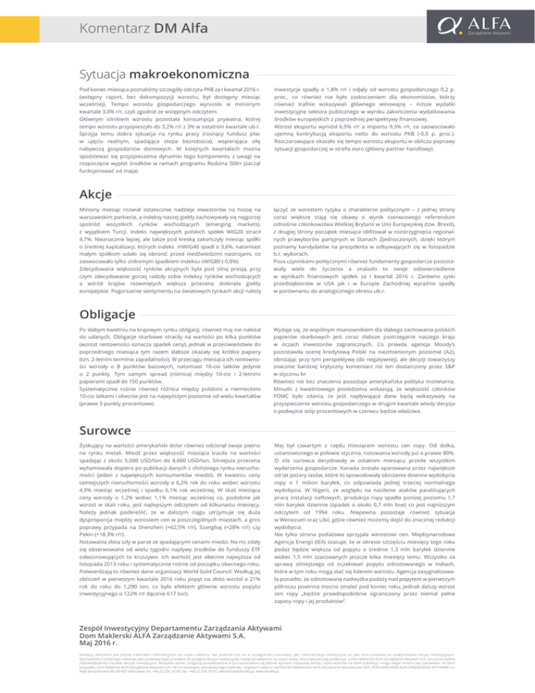 Komentarz DM Alfa Zarządzanie Aktywami Sytuacja makroekonomiczna Pod koniec miesiąca poznaliśmy szczegóły odczytu PKB za I kwartał 2016 r. (wstępny raport, bez dekompozycji wzrostu, był dostępny miesiąc wcześniej). Tempo wzrostu gospodarczego wyniosło w minionym kwartale 3,0% r/r, czyli zgodnie ze wstępnym odczytem. Głównym silnikiem wzrostu pozostała konsumpcja prywatna, której tempo wzrostu przyspieszyło do 3,2% r/r z 3% w ostatnim kwartale ub.r. Sprzyja temu dobra sytuacja na rynku pracy (rosnący fundusz płac w ujęciu realnym, spadająca stopa bezrobocia), wspierająca siłę nabywczą gospodarstw domowych. W kolejnych kwartałach można spodziewać się przyspieszenia dynamiki tego komponentu z uwagi na rozpoczęcie wypłat środków w ramach programu Rodzina 500+ (zaczął funkcjonować od maja). Inwestycje spadły o 1,8% r/r i odjęły od wzrostu gospodarczego 0,2 p. proc., co również nie było zaskoczeniem dla ekonomistów, którzy również trafnie wskazywali głównego winowajcę – niższe wydatki inwestycyjne sektora publicznego w wyniku zakończenia wydatkowania środków europejskich z poprzedniej perspektywy finansowej. Wzrost eksportu wyniósł 6,9% r/r a importu 9,3% r/r, co zaowocowało ujemną kontrybucją eksportu netto do wzrostu PKB (-0,9 p. proc.). Rozczarowujące okazało się tempo wzrostu eksportu w obliczu poprawy sytuacji gospodarczej w strefie euro (główny partner handlowy). Akcje Miniony miesiąc rozwiał ostatecznie nadzieje inwestorów na hossę na warszawskim parkiecie, a indeksy naszej giełdy zachowywały się najgorzej spośród wszystkich rynków wschodzących (emerging markets), z wyjątkiem Turcji. Indeks największych polskich spółek WIG20 stracił 4,7%. Nieznacznie lepiej, ale także pod kreską zakończyły miesiąc spółki o średniej kapitalizacji, których indeks mWIG40 spadł o 3,6%, natomiast małym spółkom udało się obronić przed niedźwiedzimi nastrojami, co zaowocowało tylko znikomym spadkiem indeksu sWIG80 (-0,8%). Zdecydowana większość rynków akcyjnych była pod silną presją, przy czym zdecydowanie gorzej radziły sobie indeksy rynków wschodzących a wśród krajów rozwiniętych większa przecena dotknęła giełdy europejskie. Pogorszenie sentymentu na światowych rynkach akcji należy łączyć ze wzrostem ryzyka o charakterze politycznym – z jednej strony coraz większe stają się obawy o wynik czerwcowego referendum odnośnie członkowstwa Wielkiej Brytanii w Unii Europejskiej (tzw. Brexit), z drugiej strony początek miesiąca obfitował w rozstrzygnięcia regionalnych prawyborów partyjnych w Stanach Zjednoczonych, dzięki którym poznamy kandydatów na prezydenta w odbywających się w listopadzie b.r. wyborach. Poza czynnikami politycznymi również fundamenty gospodarcze pozostawiały wiele do życzenia a znalazło to swoje odzwierciedlenie w wynikach finansowych spółek za I kwartał 2016 r. Zarówno zyski przedsiębiorstw w USA jak i w Europie Zachodniej wyraźnie spadły w porównaniu do analogicznego okresu ub.r. Obligacje Po słabym kwietniu na krajowym rynku obligacji, również maj nie należał do udanych. Obligacje skarbowe straciły na wartości po kilka punktów (wzrost rentowności oznacza spadek ceny), jednak w przeciwieństwie do poprzedniego miesiąca tym razem słabsze okazały się krótkie papiery (tzn. 2-letnim terminie zapadalności). W przeciągu miesiąca ich rentowności wzrosły o 8 punktów bazowych, natomiast 10-cio latków jedynie o 2 punkty. Tym samym spread (różnica) między 10-cio i 2-letnimi papierami spadł do 150 punktów. Systematycznie rośnie również róźnica między polskimi a niemieckimi 10-cio latkami i obecnie jest na najwyższym poziomie od wielu kwartałów (prawie 3 punkty procentowe). Wydaje się, że wspólnym mianownikiem dla słabego zachowania polskich papierów skarbowych jest coraz słabsze postrzeganie naszego kraju w oczach inwestorów zagranicznych. Co prawda agencja Moody’s pozostawiła ocenę kredytową Polski na niezmienionym poziomie (A2), obniżając przy tym perspektywę (do negatywnej), ale decyzji towarzyszy znacznie bardziej krytyczny komentarz niż ten dostarczony przez S&P w styczniu br. Również nie bez znaczenia pozostaje amerykańska polityka monetarna. Minutki z kwietniowego posiedzenia wskazują, że większość członków FOMC było zdania, że jeśli napływające dane będą wskazywały na przyspieszenie wzrostu gospodarczego w drugim kwartale wtedy decyzja o podwyżce stóp procentowych w czerwcu będzie właściwa. Surowce Zyskujący na wartości amerykański dolar również odcisnął swoje piętno na rynku metali. Miedź przez większość miesiąca traciła na wartości spadając z okolic 5,000 USD/ton do 4,600 USD/ton. Silniejsza przecena wyhamowała dopiero po publikacji danych z chińskiego rynku nieruchomości (jeden z największych konsumentów miedzi). W kwietniu ceny tamtejszych nieruchomości wzrosły o 6,2% rok do roku wobec wzrostu 4,9% miesiąc wcześniej i spadku 6,1% rok wcześniej. W skali miesiąca ceny wzrosły o 1,2% wobec 1,1% miesiąc wcześniej co, podobnie jak wzrost w skali roku, jest najlepszym odczytem od kilkunastu miesięcy. Należy jednak podkreślić, że w dalszym ciągu utrzymuje się duża dysproporcja między wzrostem cen w poszczególnych miastach, a gros poprawy przypada na Shenzhen (+62,5% r/r), Szanghaj (+28% r/r) czy Pekin (+18,3% r/r). Notowania złota szły w parze ze spadającymi cenami miedzi. Na nic zdały się obserwowane od wielu tygodni napływy środków do funduszy ETF odwzorowujących to kruszywo. Ich wartość jest obecnie najwyższa od listopada 2013 roku i systematycznie rośnie od początku obecnego roku. Potwierdzają to również dane organizacji World Gold Council. Według jej obliczeń w pierwszym kwartale 2016 roku popyt na złoto wzrósł o 21% rok do roku do 1,290 ton, co było efektem głównie wzrostu popytu inwestycyjnego o 122% r/r (ł