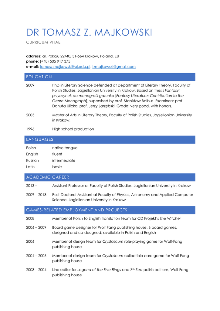 DR TOMASZ Z. MAJKOWSKI CURRICUM VITAE address: al. Pokoju 22/40, 31-564 Kraków, Poland, EU phone: (+48) 505 917 375 e-mail: [email protected], [email protected] EDUCATION 2009 PhD in Literary Science defended at Department of Literary Theory, Faculty of Polish Studies, Jagiellonian University in Krakow. Based on thesis Fantasy: przyczynek do monografii gatunku [Fantasy Literature: Contribution to the Genre Monograph], supervised by prof. Stanisław Balbus. Examiners: prof. Danuta Ulicka, prof. Jerzy Jarzębski. Grade: very good, with honors. 2003 Master of Arts in Literary Theory, Faculty of Polish Studies, Jagiellonian University in Krakow. 1996 High school graduation LANGUAGES Polish native tongue English fluent Russian intermediate Latin basic ACADEMIC CAREER 2013 – Assistant Professor at Faculty of Polish Studies, Jagiellonian University in Krakow 2009 – 2013 Post-Doctoral Assistant at Faculty of Physics, Astronomy and Applied Computer Science, Jagiellonian University in Krakow GAMES-RELATED EMPLOYMENT AND PROJECTS 2008 Member of Polish to English translation team for CD Projekt’s The Witcher 2006 – 2009 Board game designer for Wolf Fang publishing house. 6 board games, designed and co-designed, available in Polish and English 2006 Member of design team for Crystalicum role-playing game for Wolf-Fang publishing house 2004 – 2006 Member of design team for Crystalicum collectible card game for Wolf Fang publishing house 2003 – 2004 Line editor for Legend of the Five Rings and 7th Sea polish editions, Wolf Fang publishing house 2003 English to Polish translation of 4 digital games for Lemon Interactive publisher 2002 Member of editorial board of Gwiezdny pirat game magazine, involved in magazine design 2002 Section Editor in Magia i miecz role-playing games magazine 2001 – 2002 Line co-editor for Deadland role playing game, Mag publishing house 2001 – 2012 Freelance RPG editor. 20 role-playing rulebooks and game-related books edited for MAG, Wolf Fang, CD Projekt, Imaginator, Gramel and Kuźnia Gier publishing houses 1998 – 2012 Freelance RPG translator. 15 role-playing rulebooks translated from English to Polish, independently and in translation teams. Books were published by MAG, Portal, ISA, Wolf Fang and Gramel publishing houses 1994 – 2002 Freelance game journalist, specializing in tabletop role-playing games and digital games. Publications in Polish game magazines: Portal, Magia i miecz, Gwiezdny pirat, Fantasy, Gambler MEMBERSHIPS AND AWARDS MEMBERSHIPS 2016 – Steering Committee member of Games and Literary Theory association 2016 – Steering Committee member of GAMEINN grant program for video game research and development, held by Polish National Centre for Research and Developement 2015 – Member of Digital Games Research Association 2014 – Steering Committee member of Central and Eastern European Game Studies association 2011 – Member of Polish Culture Studies Association 2004 – Founding Member of Polish Game Research Association 1999 – 2012 2012 – 2013 Board Member 2012 – 2013 Chair of Krakow Branch of Polish Game Research Association Board Member of Quentin Award, national best roleplaying scenario award AWARDS 2015 Jagiellonian University Rector Award for Outstanding Organizational Activity 2014 Jagiellonian University Rector Award for Accomplishment in Science 2011, 2012, 2013 Jagiellonian University Rector Award for Outstanding Teaching TEACHING SUPERVISION PhD: 3 ongoing, auxiliary supervisor Master: 7 Bachelor: 49, 15 ongoing COURSES All listed courses were designed and conducted by myself. Dyskurs gier [Game Discourse] - seminar, 90 h. Historia i teoria gier [History and Theory of Games] - lecture, 30 h. Komunikacja dla naukowców [Communication for Scientists] - lecture, 20 h., co-teacher Kultura 2.0: Groznawstwo [Culture 2.0: Game Studies] - seminar, 30 h. Kultura popularna: Fantastyka [Popular Culture: Sci-fi and Fantasy] - seminar, 30 h. Kultura popularna: Gry wideo [Popular Culture: Video Games] - seminar, 30 h. Kultura popularna: Komiks [Popular Culture: Comics] - seminar, 30 h. Kultura popularna: Kultura popularna XIX i XX wieku [Popular Culture: Popculture of 19th and 20th Century] - seminar, 30 h. Kultura popularna: Seriale [Popular Culture: TV Series] - seminar, 30 h. Kulturowa historia gier [Culture History of Games] - lecture, 30 h. Popkultura i tożsamość: Narodowość, etniczność i popkosmopolityzm [Popculture and Identity: Nationality, Ethnicity and Pop-Cosmopolitism] - seminar, 30 h. Popkultura i tożsamość: Tożsamości fanowskie [Popculture and Identity: Fandom Identites] - seminar, 30h. Popkultura: narracje i ideologia [Popculture: Narratives and Ideologies] - lecture, 60 h. Społeczeństwo spektaklu i kultura uczestnictwa [The Society of Spectacle and the Culture of Participation] - lecture, 30 h. Technologia informacyjna [Technology of Information] - seminar, 30 h. Tworzenie scenariuszy [Screenwriting for Video Games] - seminar, 30 h. Wprowadzenie do popkultury [Introduction to Popular Culture] - lecture, 30 h. Wprowadzenie do tworzenia gier wideo [Introduction to Video Game Design] - seminar, 36 h. Wprowadzenie do wiedzy o grach wideo [Introduction to Game Studies] - seminar, 30 h. Zasady tworzenia scenorysów [Storyboarding for Video Games] seminar, 12 h. CURRENT RESEARCH Current research topics include: Bakhtinian approach to digital games Intersection between literary theory and game studies, especially game hermeneutics History of popular culture, especially history of games Postcolonial and postdependency studies of video games Popular culture and national culture, especially relation between popculture and nationalism Fandom, especially, postcolonial and national issues in fan communities Fairy tales PUBLICATIONS BOOKS W cieniu białego drzewa. Powieść fantasy w XX wieku, Wydawnictwo UJ, Kraków 2013, pp. 436 PEER-REVIEVED JOURNALS, PROCEEDINGS AND BOOK CHAPTERS (Forthcoming) The Renaissance Ass. 