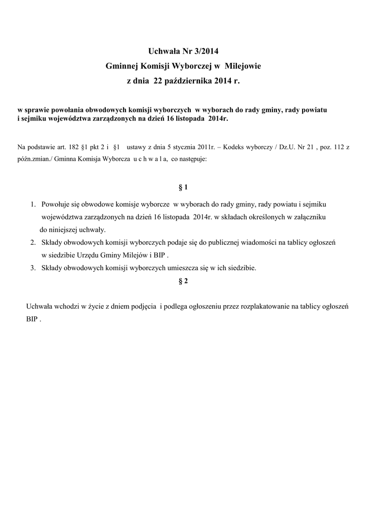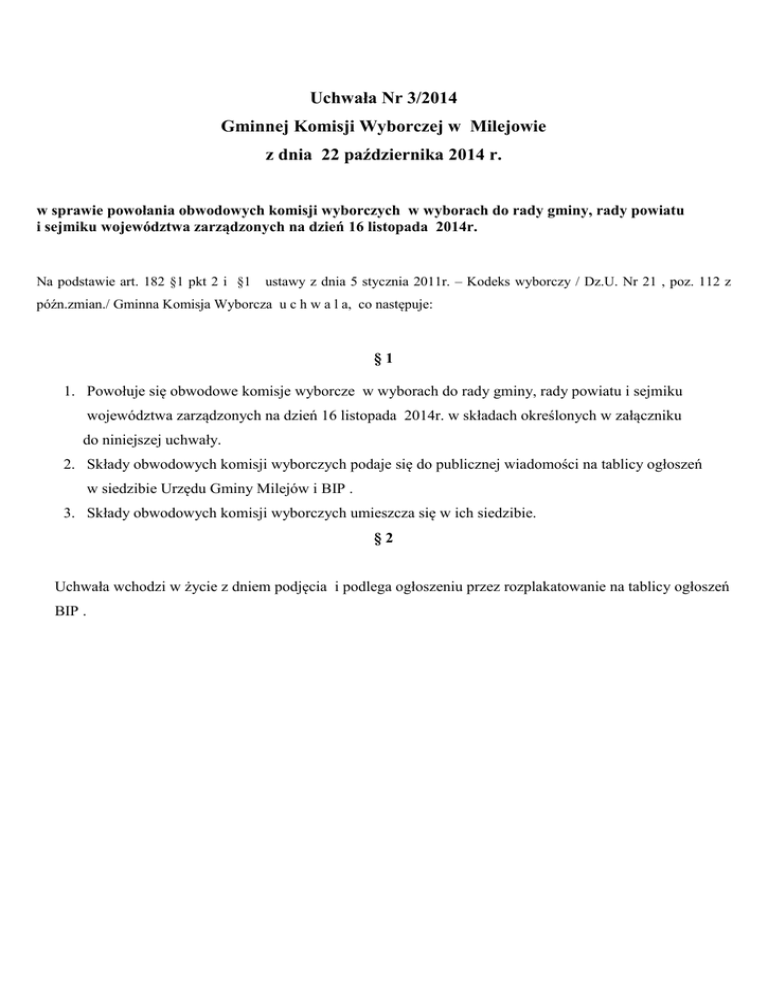 Uchwała Nr 3/2014 Gminnej Komisji Wyborczej w Milejowie z dnia 22 października 2014 r. w sprawie powołania obwodowych komisji wyborczych w wyborach do rady gminy, rady powiatu i sejmiku województwa zarządzonych na dzień 16 listopada 2014r. Na podstawie art. 182 §1 pkt 2 i §1 ustawy z dnia 5 stycznia 2011r. – Kodeks wyborczy / Dz.U. Nr 21 , poz. 112 z późn.zmian./ Gminna Komisja Wyborcza u c h w a l a, co następuje: §1 1. Powołuje się obwodowe komisje wyborcze w wyborach do rady gminy, rady powiatu i sejmiku województwa zarządzonych na dzień 16 listopada 2014r. w składach określonych w załączniku do niniejszej uchwały. 2. Składy obwodowych komisji wyborczych podaje się do publicznej wiadomości na tablicy ogłoszeń w siedzibie Urzędu Gminy Milejów i BIP . 3. Składy obwodowych komisji wyborczych umieszcza się w ich siedzibie. §2 Uchwała wchodzi w życie z dniem podjęcia i podlega ogłoszeniu przez rozplakatowanie na tablicy ogłoszeń BIP . Załącznik do Uchwały Nr 3/2014 Gminnej Komisji Wyborczej w Milejowie z dnia 22 października 2014r. Składy Obwodowych Komisji Wyborczych Obwodowa Komisja Wyborcza Nr 1 Szkoła Podstawowa w Łańcuchowie , Łańcuchów 20: 1. Tomasz Robert Kanaszewski zam. Łańcuchów , zgłoszony przez KW PSL 2. Renata Maria Maśluch zam. Starościce, zgłoszony przez KW Narodowego Odrodzenia Polski 3. Małgorzata Marta Budyńczuk zam. Łańcuchów , zgłoszony przez KW Platforma Obywatelska RP 4. Mieczysław Mileszczyk zam. Ostrówek -Kolonia , zgłoszony przez KWW SLD Lewica Razem 5. Katarzyna Marta Cybula zam. Łańcuchów,zgłoszony przez KWW Porozumienie Samorządowe Wspólna Sprawa 6. Małgorzata Maria Onuszkiewicz zam. Milejów-Osada , zgłoszony przez KW Nowa Prawica-Janusz KorwinMikke 7. Bartłomiej Sacawa 8. Maria Kulczycka zam. Łańcuchów , zgłoszony przez KWW Prawicowe Porozumienie Ziemi Łęczyńskiej zam. Łańcuchów , zgłoszony przez KW Prawo i Sprawiedliwość 9. Anna Kłoda Obwodowa Komisja Wyborcza Nr 2 , Środowiskowy Dom Samopomocy w Antoniowie, Antoniów 48 : 1. Halina Maria Wilczyńska zam. Milejów -Osada zgłoszony przez KW Stowarzyszenia Turystyki Aktywnej „Nad Wieprzem 2. Agnieszka Szponar zam. Maryniów , zgłoszony przez KW PSL 3. Halina Łysiak zam. Antoniów -Kolonia , zgłoszony przez KWW Niezależny Milejów 4. Joanna Sochacka zam. Milejów –Osada ,zgłoszony przez KWW Prawicowe Porozumienie Ziemi Łęczyńskiej 5. Joanna Katarzyna Jasielska zam. Milejów -Osada , zgłoszony przez KW Platforma Obywatelska RP 6. Marek Kaczkowski zam. Klarów , zgłoszony przez KWW SLD Lewica Razem 7. Aleksandra Natasza Ciołek zam. Milejów –Osada ,zgłoszony przez KWW Porozumienie Samorządowe Wspólna Sprawa 8. Piotr Grudzień zam. Milejów -Osada , zgłoszony przez KW Prawo i Sprawiedliwość 9. Mirosława Barbara Pawlak Obwodowa Komisja Wyborcza Nr 3 Zespół Szkół Nr 2 Liceum Ogólnokształcące w Milejowie, Milejów – Osada ul. Partyzancka 62 1. Barbara Maria Gała zam. Klarów , zgłoszony przez KWW Niezależny Milejów 2. Agnieszka Edyta Ciołek zam. Milejów –Osada, zgłoszony przez KWW Porozumienie Samorządowe Wspólna Sprawa 3. Katarzyna Meresta zam. Milejów -Osada , zgłoszony przez KW Platforma Obywatelska RP 4. Natalia Greta Roczon zam. Milejów -Osada , zgłoszony przez KW Narodowego Odrodzenia Polski 5. Anna Karolina Barczak zam. Milejów -Osada , zgłoszony przez KWW SLD Lewica Razem 6. Katarzyna Kwiatkowska zam. Milejów , zgłoszony przez KWW Prawicowe Porozumienie Ziemi Łęczyńskiej 7. Tadeusz Paweł Zabłocki zam. Milejów –Osada, zgłoszony przez KW Prawo i Sprawiedliwość 8. Anna Rulka zam. Milejów -Osada , zgłoszony przez KWW Razem Gminie 9. Małgorzata Ewa Konowałek Obwodowa Komisja Wyborcza Nr 4 Urząd Gminy w Milejowie, Milejów-Osada ul. Partyzancka 13a: 1. Lilianna Filipek – Pasieczna zam.Milejów -Osada , zgłoszony przez KW Narodowego Odrodzenia Polski 2. Anna Trembecka zam. Milejów -Osada , zgłoszony przez KWW Nowa Perspektywa 3. Lidia Ewa Podściańska zam. Milejów -Osada , zgłoszony przez KW Nowa Prawica-Janusz Korwin -Mikke 4. Kamil Krzysztof Oleszek zam. Milejów -Osada , zgłoszony przez KWW Beaty Katarzyny Oleszek 5. Monika Szabała zam. Milejów -Osada zgłoszony przez KW Platforma Obywatelska RP 6. Marian Turek zam. Milejów -Osada , zgłoszony przez KWW Razem Gminie 7. Marek Zygmunt Majewski zam Milejów -Osada , zgłoszony przez KWW SLD Lewica Razem 8. Grzegorz Wójcik zam. Łysołaje –Kolonia , zgłoszony przez KW PSL 9. Jolanta Franczak Obwodowa Komisja Wyborcza Nr 5 Zespół Szkól Nr 2 Szkoła Podstawowa w Jaszczowie, Jaszczów 24: 1. Robert Konowałek zam. Milejów –Osada, zgłoszony przez KW Stowarzyszenia Turystyki Aktywnej „Nad Wieprzem” 2. Grzegorz Paweł Pasieczny zam. Milejów -Osada , zgłoszony przez KW Narodowego Odrodzenia Polski 3. Paulina Małgorzata Bil zam. Milejów –Osada, zgłoszony przez KWW Razem Gminie 4. Wiktor Kazimierz Patyk zam. Jaszczów , zgłoszony przez KWW Nowa Perspektywa 5. Julia Elżbieta Wróbel zam. Milejów -Osada , zgłoszony przez KW Platforma Obywatelska RP 6. Barbara Szulc zam. Jaszczów , zgłoszony przez KW Prawo i Sprawiedliwość 7. Edyta Mlącka zam. Jaszczów , zgłoszony przez KWW Przyszłość Naszej Wsi 8. Diana Krystyna Maciąg zam. Klarów , zgłoszony przez KWW SLD Lewica Razem 9. Jerzy Kędrak Obwodowa Komisja Wyborcza Nr 6 Szkoła Podstawowa w Białce, Białka 122: 1. Dorota Stanisława Wyka zam. Jaszczów, zgłoszony przez KW Nowa Prawica-Janusz Korwin -Mikke 2. Dorota Edyta Kociuba zam. Dąbrowa , zgłoszony przez KWW Razem Gminie 3. Janusz Tadeusz Przygocki zam. Starościce , zgłoszony przez KW Prawo i Sprawiedliwość 4. Michał Jakub Gajowiak zam. Milejów -Osada ,zgłoszony przez KWW Prawicowe Porozumienie Ziemi Łęczyńskiej 5. Eugeniusz Mieczysław Ścierka zam. Białka, zgłoszony przez KWW Porozumienie Samorządowe Wspólna Sprawa 6. Joanna Lidia Zielińska zam. Mile