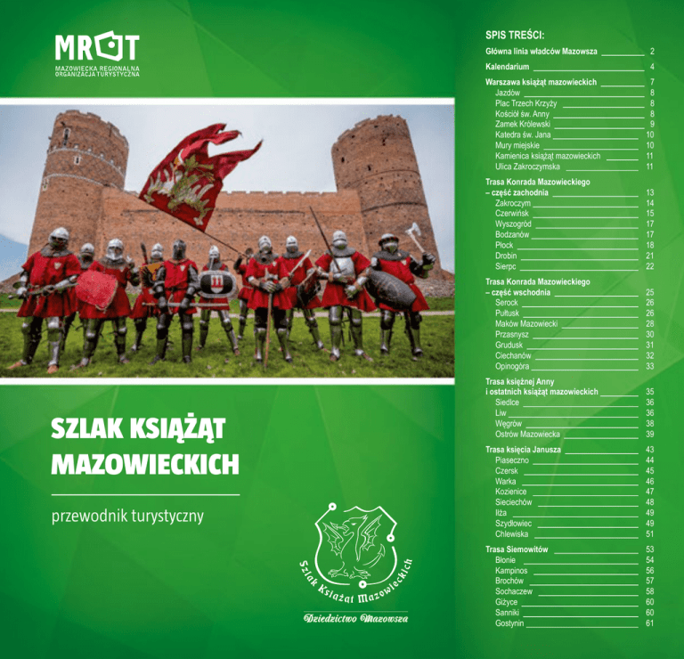 SPIS TREŚCI: SZLAK KSIĄŻĄT MAZOWIECKICH przewodnik turystyczny Główna linia władców Mazowsza 2 Kalendarium 4 Warszawa książąt mazowieckich Jazdów PlacTrzechKrzyży Kościółśw.Anny ZamekKrólewski Katedraśw.Jana Murymiejskie Kamienicaksiążątmazowieckich UlicaZakroczymska 7 8 8 8 9 10 10 11 11 Trasa Konrada Mazowieckiego – część zachodnia Zakroczym Czerwińsk Wyszogród Bodzanów Płock Drobin Sierpc 13 14 15 17 17 18 21 22 Trasa Konrada Mazowieckiego – część wschodnia Serock Pułtusk MakówMazowiecki Przasnysz Grudusk Ciechanów Opinogóra 25 26 26 28 30 31 32 33 Trasa księżnej Anny i ostatnich książąt mazowieckich Siedlce Liw Węgrów OstrówMazowiecka 35 36 36 38 39 Trasa księcia Janusza Piaseczno Czersk Warka Kozienice Sieciechów Iłża Szydłowiec Chlewiska 43 44 45 46 47 48 49 49 51 Trasa Siemowitów Błonie Kampinos Brochów Sochaczew Giżyce Sanniki Gostynin 53 54 56 57 58 60 60 61 OSTRÓDA SZCZYTNO W s. 24 BRODNICA PRZASNYSZ RYPIN s. 12 SIERPC isł a LIPNO PŁOŃSK ŁĘCZYCA ŻYRARDÓW RAWA MAZ. PABIANICE Warszawa książąt mazowieckich | s. 7 ŁASK TOMASZÓW Wa rta | s. 35 Trasa księcia Janusza | s. 43 RADOMSKO RADZYŃ PODLASKI 5 a Pilic BIAŁOBRZEGI BIAŁA PODLASKA ŁUKÓW RYKI KOZIENICE PARCZEW z Wiepr LUBARTÓW OPOCZNO PRZYSUCHA WŁOSZCZOWA ZWOLEŃ LIPSKO SZYDŁOWIEC SKARŻYSKO-KAMIENNA KIELCE STARACHOWICE ŁĘCZNA PUŁAWY Chlewiska KOŃSKIE | s. 53 RADOM OPOLE LUBELSKIE Wisła KŁOBUCK Trasa księżnej Anny i ostatnich książąt mazowieckich Trasa Siemowitów MIŃSK MAZ. ŁOSICE Oto SZLAK KSIĄŻĄT MAZOWIECKICH – podróż do czasów średniowiecza, kiedy Mazowsze zyskało świetność dzięki władcom mądrym i ambitnym. Protoplastą linii mazowieckich Piastów był Konrad Mazowiecki. Historia zapoczątkowanej przez niego dynastii to opowieść o trzech wiekach budowania cywilizacji na niemal dziewiczych terenach. Książęta założyli ponad sto miast, budowali zamki i fundowali kościoły, których styl – zwany gotykiem mazowieckim – na stałe wszedł do historii sztuki. Dzieje władców Mazowsza to także wstrząsające historie rodzinne (jedna z nich zainspirowała Szekspira!) oraz legendy o skarbach templariuszy i... niezwykłym wynalazku, który przyczynił się do zwycięstwa armii polsko-litewskiej wspieranej przez oddziały mazowieckie pod Grunwaldem. WYWERNA – SYMBOL KSIĄŻĄT MAZOWIECKICH Szlak Książąt Mazowieckich jest jedną z trzech Dwunogi smok zwany wywerną od 1329 r. do nowych dróg, dzięki którym można odkryć upadku Księstwa Mazowieckiego w 1526 r. widDziedzictwo Mazowsza. Warto też poznać niał na książęcych pieczęciach i sztandarach. pozostałe. Szlak Chopinowski wiedzie śladami Mazowsze, poza przepojoną mitami arturiańjednego z najwybitniejszych kompozytorów skimi Anglią, było wyjątkowym miejscem w Euświata, który na Mazowszu spędził połowę ropie, gdzie smok stał się symbolem władzy, swojego życia. Szlak Bitwy Warszawskiej 1920 podczas gdy w całym świecie chrześcijańskim to podróż w czasie i przestrzeni pozwalająca był symbolem zła. Czy wywerna mogła przybyć zrozumieć, dlaczego batalia sprzed blisko stuna Mazowsze właśnie z Wysp Brytyjskich? lecia uważana jest za jedną z najważniejszych Jest prawdopodobne, że taki herb przywiózł w historii Europy. Magnus – syn poległego podczas bitwy pod Hastings w 1066 r. króla Anglii Harolda. PrzyWięcej informacji o szlakach można znaleźć puszczalnie to jego grób został odkryty w CzerDostępna jest także aplikacja mobilne na stronie internetowej skuna kołourządzenia ruin kościoła świętych Piotra i Pawła. www.dziedzictwomazowsza.pl Ś BRZEZINY PAJĘCZNO 6 PRUSZKÓW OTWOCK PIASECZNO s. 42 SIEDLCE GRÓJEC PIOTRKÓW Trasa Konrada Mazowieckiego 3 BEŁCHATÓW – część wschodnia TRYBUNALSKI | s. 25 5 WARSZAWA 1 GARWOLIN MAZOWIECKI SIERADZ ZDUŃSKA 2 Trasa Konrada Mazowieckiego WOLA – część zachodnia | s. 13 4 WĘGRÓW SIEMIATYCZE WOŁOMIN SKIERNIEWICE ZGIERZ ŁÓDŹ 1 LEGIONOWO OŻARÓW MAZ. Błonie GRODZISK MAZOWIECKI SOKOŁÓW PODLASKI 4 U SOCHACZEW ŁOWICZ KUTNO Serock Zakroczym 6 g MAZOWSZE. Dziś – serce Polski, w okresie kształtowania się Rzeczpospolitej przez ponad trzy stulecia – odrębne państwo. W centrum regionu tętni wielkomiejskim rytmem Warszawa, wokół której rozciąga się kraina wciąż nie do końca odkryta. Na turystów czekają tajemnicze zamki i szlacheckie dwory, zabytkowe świątynie i urokliwe miasteczka, pola dawnych bitew i krajobrazy, których różnorodność od lat przyciąga filmowców. Cały ten świat to olbrzymi skarbiec historyczny, kulturowy i przyrodniczy. Wystarczy stanąć u jego granic i wypowiedzieć zaklęcie: Mazowsze, otwórz się. A później wejść i podążyć wybranym szlakiem. R GOSTYNIN BIELSK PODLASKI Bu WYSZKÓW NOWY DWÓR MAZ. 2 BIAŁYSTOK OSTRÓW MAZ. PUŁTUSK PŁOCK PODDĘBICE MAKÓW MAZ. CIECHANÓW WŁOCŁAWEK s. 52 KOŁO 3 Opinogóra ZAMBRÓW WYSOKIE MAZ. O ALEKSANDRÓW KUJAWSKI s. 34 OSTROŁĘKA MŁAWA ŻUROMIN Narew ŁOMŻA Narew TORUŃ DZIAŁDOWO W serii ukazały się również Ł GOLUB-DOBRZYŃ NIDZICA A WĄBRZEŹNO SOKÓŁKA MOŃKI KOLNO NOWE MIASTO LUBAWSKIE rza eb Bi I IŁAWA GRUDZIĄDZ GRAJEWO PISZ OSTROWIEC ŚWIĘTOKRZYSKI LUBLIN KRAŚNIK ŚWIDNIK KRASNYSTAW Szlak Książąt Mazowieckich Główna linia władców Mazowsza 2 Szlak Książąt Mazowieckich 3 Zamek w Czersku Rok 1313 kalendarium Rok 1138 Około 1200 roku Wnuk Bolesława Krzywoustego – Konrad Mazowiecki (1187/1188–1247) – staje się samodzielnym księciem Mazowsza i Kujaw. Dzielnicami, spadkiem po ojcu Kazimierzu Sprawiedliwym, dzieli się z bratem Leszkiem Białym. Rok 1228 Na Mazowsze przybywają pierwsi Krzyżacy – w pierwszym roku tylko... dwaj. Konrad Mazowiecki przymuszony trudną sytuacją na północnej granicy, utraciwszy praktycznie ziemię chełmińską na rzecz Prusów, zawiera umowę z Hermanem von Salza – wielkim mistrzem zakonu Najświętsze