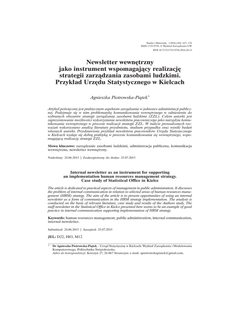 Studia i Materiaïy, 1/2016 (20): 167– 176 ISSN 1733-9758, © Wydziaï ZarzÈdzania UW DOI 10.7172/1733-9758.2016.20.13 Newsletter wewnÚtrzny jako instrument wspomagajÈcy realizacjÚ strategii zarzÈdzania zasobami ludzkimi. Przykïad UrzÚdu Statystycznego wbKielcach Agnieszka Piotrowska-PiÈtek* Artykuï poĂwiÚcony jest praktycznym aspektom zarzÈdzania wbjednostce administracji publicznej. Podejmuje siÚ wb nim problematykÚ komunikowania wewnÚtrznego wb odniesieniu do wybranych obszarów strategii zarzÈdzania zasobami ludzkimi (ZZL). Celem autorki jest zaprezentowanie moĝliwoĂci wykorzystania newslettera pracowniczego jako narzÚdzia komunikowania wewnÚtrznego wbprocesie realizacji strategii ZZL. W trakcie prowadzonych rozwaĝañ wykorzystano analizÚ literatury przedmiotu, studium przypadku oraz wyniki badañ wïasnych autorki. Przedstawiony przykïad newslettera pracowników UrzÚdu Statystycznego wbKielcach wydaje siÚ dobrÈ praktykÈ wbprocesie komunikowania siÚ wewnÚtrznego, wspomagajÈcÈ realizacjÚ strategii ZZL. Sïowa kluczowe: zarzÈdzanie zasobami ludzkimi, administracja publiczna, komunikacja wewnÚtrzna, newsletter wewnÚtrzny. Nadesïany: 24.06.2015 | Zaakceptowany do druku: 25.07.2015 Internal newsletter as an instrument for supporting anbimplementationbhuman resources management strategy. Case study of Statistical Office in Kielce The article is dedicated to practical aspects of management in public administration. It discusses the problem of internal communication in relation to selected areas of human resources management (HRM) strategy. The aim of the article is to present opportunities of using an internal newsletter as abform of communication in the HRM strategy implementation. The analysis is conducted on the basis of relevant literature, case study and results of the Authors study. The staff newsletter in the Statistical Office in Kielce presented here seems to be an example of good practice in internal communication supporting implementation of HRM strategy. Keywords: human resources management, public administration, internal communication, internal newsletter. Submitted: 24.06.2015 | Accepted: 25.07.2015 JEL: D22, H83, M12 * Dr Agnieszka Piotrowska-PiÈtek – UrzÈd Statystyczny wbKielcach, Wydziaï ZarzÈdzania ibModelowania Komputerowego, Politechnika ¥wiÚtokrzyska. Adres do korespondencji: Korczyn 27, 26-067 Strawczyn; e-mail: [email protected]. 1. Wprowadzenie Komunikowane siÚ jest jednym zbwarunków funkcjonowania czïowieka wb okreĂlonych grupach spoïecznych – rodzinie, grupie szkolnej, zakïadzie pracy. MiÚdzy innymi zbtego powodu problematyka ta jest przedmiotem rozwaĝañ na gruncie róĝnych dyscyplin nauk spoïecznych – psychologii, socjologii, etnografii, ekonomii oraz nauk humanistycznych – nauk ob poznaniu ibkomunikacji spoïecznej. W odniesieniu do nauk ekonomicznych komunikowanie siÚ jest przedmiotem dyskusji ib badañ naukowych, przede wszystkim wb ramach marketingu (marketing kadrowy, public relations) oraz zarzÈdzania zasobami ludzkimi (motywacja, przywództwo, komunikowanie wewnÚtrzne, rozwój zasobów ludzkich, zarzÈdzanie konfliktem). W niniejszym artykule autorka podejmuje problematykÚ komunikowania wewnÚtrznego (zwanego równieĝ pracowniczym lub zespoïowym) wb odniesieniu do wybranych obszarów strategii zarzÈdzania zasobami ludzkimi (ZZL). PojÚcia „komunikowanie siÚ” ib„komunikacja” traktowane sÈ wb niniejszej publikacji zamiennie. Autorka przyjmuje powszechnie akceptowanÈ wbliteraturze przedmiotu definicjÚ, ĝe jest to proces przekazywania ibodczytywania informacji oraz sensu, zachodzÈcy co najmniej pomiÚdzy dwoma osobami lub grupami osób (por.: Marfo-Yiadom, 2008, s. 288–289). Podobnie zamiennie traktuje sformuïowania „technika komunikowania” ib„narzÚdzie komunikowania” jako okreĂlenia sposobu ibzespoïu Ărodków (równieĝ ob charakterze technicznym) dla realizacji procesu komunikowania. Artykuï skïada siÚ zb czterech czÚĂci. Poprzedzony jest wprowadzeniem, abzakoñczony podsumowaniem. Celem autorki jest zaprezentowanie moĝliwoĂci wykorzystania newslettera pracowniczego jako narzÚdzia komunikowania wewnÚtrznego wb procesie realizacji strategii ZZL. W czÚĂci teoretycznej, wb której zastosowano metodÚ analizy literatury przedmiotu, przedstawiono znaczenie prawidïowego komunikowania siÚ wewnÈtrz organizacji wbprocesie ZZL. Omówiono moĝliwoĂci ib zasady wykorzystania wbtym procesie newslettera pracowniczego. W czÚĂci empirycznej zaprezentowano przykïad newslettera pracowników UrzÚdu Statystycznego wbKielcach. Z uwagi na opisowo-eksploracyjny charakter problemu badawczego zastosowano metodÚ pojedyn- 168 czego studium przypadku (single case study), opartego na celowym doborze jednostki badanej. Zgodnie zb zasadÈ triangulacji metodologicznej wbtego typu badaniu (Wójcik, 2013) wykorzystano informacje pochodzÈce zb obserwacji uczestniczÈcej autorki oraz analizÚ treĂci dokumentów wewnÚtrznych (w tym aktów prawa wewnÚtrznego) ib artykuïów zamieszczanych wb newsleterze. Zaprezentowano równieĝ wyniki badania ankietowego, którego celem byïa ocena przez pracowników analizowanej jednostki funkcji, jakie newsletter speïnia wbprocesie komunikowania wewnÚtrznego ibwspomagania realizacji strategii ZZL. 2. Komunikowanie wewnÚtrzne jako podstawa zarzÈdzania zasobami ludzkimi – implikacje dla jednostek administracji publicznej W literaturze przedmiotu moĝna odnaleěÊ wiele ujÚÊ definicyjnych pojÚcia „komunikacja organizacyjna” (korporacyjna). Na uwagÚ zasïuguje podejĂcie J.bCornellissena, który definiuje komunikacjÚ korporacyjnÈ jako funkcjÚ zarzÈdzania, okreĂlajÈcÈ ramy efektywnej koordynacji komunikacji wewnÚtrznej ib zewnÚtrznej wb celu stworzenia ibpodtrzymania korzystnej reputacji danej organizacji wĂród grup interesariuszy, od których ta organizacja jest zaleĝna (Cornelissen, 2010, s. 26). NawiÈzujÈc do prz