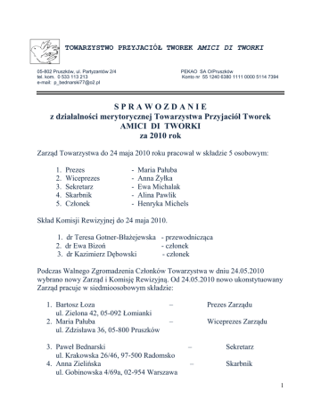 TOWARZYSTWO PRZYJACIÓŁ TWOREK AMICI DI TWORKI 05-802 Pruszków, ul. Partyzantów 2/4 tel. kom. 0 533 113 213 e-mail: [email protected] PEKAO SA O/Pruszków Konto nr 55 1240 6380 1111 0000 5114 7394 SPRAWOZDANIE z działalności merytorycznej Towarzystwa Przyjaciół Tworek AMICI DI TWORKI za 2010 rok Zarząd Towarzystwa do 24 maja 2010 roku pracował w składzie 5 osobowym: 1. 2. 3. 4. 5. Prezes Wiceprezes Sekretarz Skarbnik Członek - Maria Pałuba Anna Żyłka Ewa Michalak Alina Pawlik Henryka Michels Skład Komisji Rewizyjnej do 24 maja 2010. 1. dr Teresa Gotner-Błażejewska - przewodnicząca 2. dr Ewa Bizoń - członek 3. dr Kazimierz Dębowski - członek Podczas Walnego Zgromadzenia Członków Towarzystwa w dniu 24.05.2010 wybrano nowy Zarząd i Komisję Rewizyjną. Od 24.05.2010 nowo ukonstytuowany Zarząd pracuje w siedmioosobowym składzie: 1. Bartosz Łoza ul. Zielona 42, 05-092 Łomianki 2. Maria Pałuba ul. Zdzisława 36, 05-800 Pruszków – Prezes Zarządu – Wiceprezes Zarządu 3. Paweł Bednarski ul. Krakowska 26/46, 97-500 Radomsko 4. Anna Zielińska ul. Gobinowska 4/69a, 02-954 Warszawa – Sekretarz – Skarbnik 1 5. Iwona Patejuk - Mazurek – ul. Partyzantów 2/4 m 54, 05-802 Pruszków 6. Anna Mosiołek – ul. Słoneczna Polana 12, 05-110 Jabłonna 7. Maja Polikowska – ul. Biernata z Lublina 6, 02-495 Warszawa Członek Zarządu Członek Zarządu Członek Zarządu Nowa Komisja Rewizyjna w trzyosobowym składzie: 1. Milena Rządkowska - przewodnicząca 2. Teresa Błażejewska - członek 3. Małgorzata Zawadzka - członek W omawianym okresie sprawozdawczym odbyło się 8 zebrań Zarządu Towarzystwa z udziałem wszystkich – lub znacznej większości – członków. Zebrania prowadzone były przez prezesa Zarządu, a ich tematyka obejmowała głownie: realizację zadań statutowych opracowanie projektów artystycznych gospodarowanie zasobami finansowymi i ich pozyskiwanie współpracę z Mazowieckim Specjalistycznym Centrum Zdrowia im. Prof. Jana Mazurkiewicza w Pruszkowie podejmowanie decyzji w sprawach członkostwa (skreśleń, przyjmowanie nowych członków) Towarzystwo na dzień 31 grudnia 2010 roku liczyło 82 członków. Na przestrzeni roku z listy członków skreślono 24 osób i przyjęto w 7 nowych członków Towarzystwa. Składki członkowskie nadal wynoszą 2 zł miesięcznie. W dniu 24 maja 2010 r. odbyło się Walne Zebranie członków Towarzystwa, które po zapoznaniu się ze sprawozdaniami Zarządu z rocznej działalności i Komisji Rewizyjnej udzieliło Zarządowi absolutorium i zatwierdziło założenia programowe pracy Zarządu na 2011 rok. Dotychczasowy Zarząd ustąpił i wybrano nowy Zarząd jak wyżej. Towarzystwo nie zatrudniało żadnego pracownika etatowego, a członkowie Zarządu pracę swoją wykonywali nieodpłatnie. 2 W 2010 roku łącznie wpływy na rzecz Towarzystwa stanowiły kwotę 28923,86 zł, ( w tym 10574,69 uzyskano z tytułu 1% odpisów z podatku od osób fizycznych, które wykorzystano na realizację celów statutowych Towarzystwa), a wydatki obejmowały sumę 19394,13 zł. Szczegółowe dane dotyczące wpływów i wydatków Towarzystwa w omawianym okresie sprawozdawczym zawarte są w odrębnym sprawozdaniu finansowym przygotowanym przez Biuro Obsługi Księgowej Towarzystwa i skarbnika Zarządu. Statutowa działalność Towarzystwa realizująca zaplanowane na 2010 rok zadania obejmowała głównie: 1. Kontynuację programu „Razem w sztuce i życiu” 2. Dalszą realizację projektu „Być razem i żyć razem” 3. Współpracę z Mazowieckim Specjalistycznym Centrum Zdrowia im. Prof. Jana Mazurkiewicza w Pruszkowie (Szpital Tworkowski). 4. Działalność wydawniczo-edukacyjną W ramach programu „Razem w sztuce i życiu” w 2010 roku zorganizowano: Cztery Spektakle Teatru Pacjentów Szpitala „Oddział Niecodzienny” zrealizowane pod kierownictwem Alicji Górny, w których udział wzięli pacjenci oddziału dziennego MSCZ. W każdym z nich występowało kilkunastu chorych a miejscem realizacji przedsięwzięcia było Centrum Środowiskowe „Pałacyk nad Utratą”. Spektakle realizowane były na scenie głównej Sali Kino-teatru Centrum. Publiczność stanowili pacjenci i personel szpitala. Przy współpracy z firmą „Symphar” zrealizowano pięć koncertów muzykoterapeutycznych południowo-amerykańskiej grupy Pedra Guevary - Lyra. W koncertach aktywny udział brali pacjenci MSCZ wykorzystując profesjonalne instrumenty udostępnione przez artystów. Koncerty w ramach programu „muzykoterapia” odbywały co dwa tygodnie wiosną 2010. Miejscem występów była scena główna Sali Kino-teatru w Centrum Środowiskowym „Pałacyk nad Utratą”. W każdym z koncertów uczestniczyło około 120 pacjentów Szpitala. W listopadzie 2010 roku dzięki wsparciu firmy „Skok Stefczyka” zorganizowano imprezę andrzejkowo – mikołajkową dla pacjentów szpitala. Odbyła się zabawa taneczna, sesje wróżby, kącik makijażu oraz konkursy z nagrodami. Po imprezie przygotowano catering dla około 150 pacjentów. 3 Na XLIII Zjeździe Psychiatrów Polskich w Poznaniu zorganizowano wystawę prac pacjentów MSCZ. Ekspozycja obejmowała ponad 30 prac m.in. Waldemara Jampolskiego i Teresy Urbanowicz. Uczestnicy konferencji mogli oglądać obrazy w holu głównym Targów Poznańskich w ciągu całego czasu trwania zjazdu. Podczas wystawy dystrybuowano również albumy „Kolekcja Tworkowska” wydanych przez Towarzystwo. W ramach Projektu „Być razem i żyć razem”: Towarzystwa uczestniczyło wspólnie ze MSCZ w organizacji i sfinansowaniu XVIII Spartakiady o Puchar Prezydenta miasta Pruszkowa odbywającej się na terenie MSCZ w dniu 16 września 2010 roku, w której uczestniczyło około 200 pacjentów z 4 ośrodków psychiatrycznych – Szpitala Psychiatrycznego w Sochaczewie, Oddziału Psychiatrycznego przy ul. Dolnej w Warszawie i Szpitala Psychiatrycznego w Drewnicy oraz gospodarza MSCZ w Pruszkowie. Uczestnicy Spar