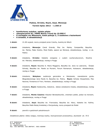 Padwa, Orvieto, Rzym, Asyż, Wenecja Termin lipiec 2012 - 1.350 zł komfortowy autokar, opieka pilota ubezpieczenie KL i NNW Warta Travel do 10.000 € 6 noclegów we Włoszech, hotel pokoje 2, 3 osobowe z łazienkami 6 śniadań, 6 obiadokolacji 1 dzień: 21.00 wyjazd, nocny przejazd przez Czechy, Austrię do Włoch 2 dzień: śniadanie, Wenecja: Canal Grande, Plac św. Marka, Campanilla, Bazylika św. Marka, Pałac Dożów, Most Rialto, spacer po Wenecji, obiadokolacja, nocleg w ok. Padwy 3 dzień: śniadanie, Orvieto: Katedra związana z cudem eucharystycznym, Studnia św. Patryka, obiadokolacja, nocleg w Fiuggi 4 dzień: śniadanie, Rzym: Bazylika S. Maria Maggiore, Bazylika św. Jana na Lateranie, Święte Schody, Bazylika św. Pawła za Murami, Forum Romanum, Koloseum, obiadokolacja, nocleg w Fiuggi 5 dzień: śniadanie, Watykan: audiencja generalna w Błogosławionego Jana Pawła II, Bazylika św. Piotra, Watykanie, nawiedzenie grobu Rzym: Schody Hiszpańskie, Plac Navona, Fontanna di Trevi, Panteon, obiadokolacja, nocleg w Fiuggi 6 dzień: śniadanie, Rzym: Katakumby, Zatybrze, dalsze zwiedzanie miasta, obiadokolacja, nocleg w Fiuggi 7 dzień: śniadanie, Monte Cassino: Klasztor Benedyktynów, cmentarz polski, pobyt na morzem, obiadokolacja, nocleg w Fiuggi 8 dzień: śniadanie, Asyż: Bazylika św. Franciszka, Bazylika św. Klary, Katedra św. Rufina, Bazylika Matki Bożej Anielskiej z Porcjunkulą, nocny przejazd do Polski 9 dzień: powrót w godzinach południowych Dodatkowo płatne: bilety wstępu, tramwaj wodny, licencjonowani przewodnicy, słuchawki ok. 75 € B.T. Andretour 41-902 Bytom ul. Jagiellońska 11 Tel. 032-3897046, 032-3897047, 0601-669999 B.T. Andretour 41-922 Radzionków ul. Lompy 1