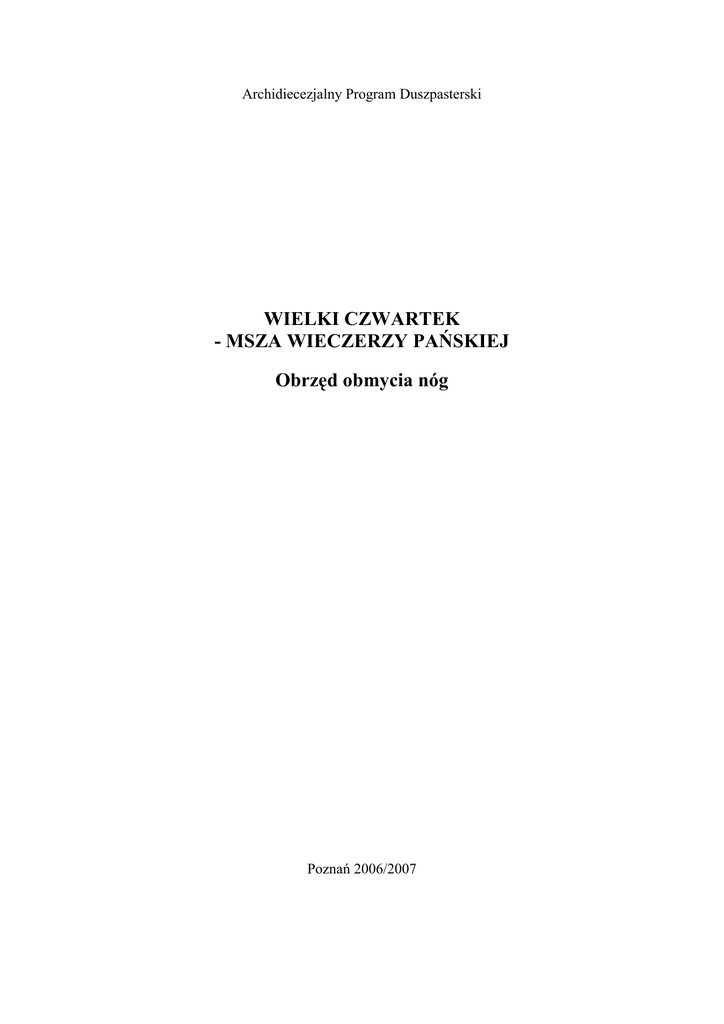 Archidiecezjalny Program Duszpasterski WIELKI CZWARTEK - MSZA WIECZERZY PAŃSKIEJ Obrzęd obmycia nóg Poznań 2006/2007 Tradycja Zgodnie z tradycją Kościoła, podczas Mszy Wieczerzy Pańskiej, odbywa się umycie nóg wybranym męŜczyznom. Obrzęd ten oznacza słuŜbę i miłość Chrystusa, który przyszedł nie po to, aby Mu słuŜono, ale aby słuŜyć. Wypada tę tradycję zachować i wyjaśnić jej właściwy sens (por. Paschalis sollemnitatis 47-57). Jezus daje przykład Hasło roku duszpasterskiego: Przypatrzmy się powołaniu naszemu zaprasza nas, byśmy odkrywali nasze powołanie do słuŜby. Jezus Chrystus uczy nas, jak słuŜyć. Msza Wieczerzy Pańskiej w Wielki Czwartek jest dla nas szczególną okazją, by uczyć się od Chrystusa postawy słuŜebnej. Obrzęd obmycia nóg nie jest publicznym zamanifestowaniem postawy kapłana, jak potrafi i gotów jest słuŜyć. Gest ten oznacza słuŜbę i miłość Chrystusa! Celebrans, pochylając się nad nogami wiernych, naśladuje Chrystusa i od Niego uczy się, jak słuŜyć. Kapłan czyni jak Jezus W wielu parafiach naszej Archidiecezji wprowadzono przed rokiem ten obrzęd. Gorąco zachęcamy, takŜe te wspólnoty, które tego jeszcze nie uczyniły, aby odwaŜyć się w tym roku. Obmycia nóg dokonuje celebrans po homilii. Dobrze zorganizować to w taki sposób, by wierni zgromadzeni na modlitwie mogli widzieć, co czyni kapłan. Wierni czynią jak Jezus Proponujemy takŜe, podobnie jak przed rokiem, aby połączyć gest obmycia nóg ze składaniem przez parafian deklaracji postawy słuŜebnej na rzecz wspólnoty czy własnej rodziny. MoŜna zaprosić do tego obrzędu wszystkich, którzy w jakikolwiek sposób słuŜą juŜ w parafii. Mogą to być ministranci, członkowie Parafialnej Rady Duszpasterskiej oraz Parafialnej Rady Ekonomicznej, członkowie Parafialnego Zespołu Caritas, kościelny, organista, członkowie chóru lub zespołów młodzieŜowych i dziecięcych, Nadzwyczajni Szafarze Komunii św., animatorzy grup katechezy przed bierzmowaniem, dorośli, czytający słowo BoŜe na Mszach św. z udziałem dzieci, osoby utrzymujące porządek w świątyni i wokół niej, a takŜe inni wierni, którzy włączają się czynnie w posługiwanie w naszej parafii. Jest to dobra okazja, by nowe osoby, dotychczas nie angaŜujące się w duszpasterstwo, podjęły decyzję o włączeniu się w sposób czynny i słuŜebny w Ŝycie parafii. Przygotowanie Parafię naleŜy wcześniej do tego obrzędu przygotować. Trzeba o tym mówić juŜ na początku Wielkiego Postu, wykorzystując homilie, kazania pasyjne, rekolekcje, ogłoszenia duszpasterskie, gazetkę czy stronę internetową parafii. Osoby gotowe złoŜyć taką deklarację podczas Mszy Wieczerzy Pańskiej, zaprośmy na oddzielną katechezę wyjaśniając znaczenie obrzędu umycia nóg. Pamiętajmy o uszanowaniu wolności wiernych, którzy słuŜą w parafii, a moŜe nie będą chcieli składać deklaracji. W materiałach Programu Duszpasterskiego zamieszczamy wzór deklaracji, którą moŜna wykorzystać w Wielki Czwartek. Deklarację naleŜy rozdać parafianom wcześniej, moŜe podczas rekolekcji wielkopostnych, by mogli przemyśleć swoją decyzję i przygotować się do obrzędu. Przebieg Deklaracje słuŜby składają wierni przed liturgią do przygotowanego specjalnie koszyczka. MoŜe on stać na stoliku, wraz z darami ołtarza: chlebem, winem i wodą. Dobrze, jeśli jakaś osoba będzie czuwała przy stoliku, mając do dyspozycji deklaracje, gdyby ktoś zdecydował się w ostatniej chwili. Stolik musi stać w widocznym miejscu. Podczas 2 przygotowania darów, wybrane wcześniej osoby (które złoŜyły deklaracje) przynoszą dary ofiarne oraz koszyczek z deklaracjami do ołtarza. Celebrans składa deklaracje w widocznym miejscu na boku ołtarza. Ofiara dla potrzebujących W Wielki Czwartek moŜna teŜ poprosić dzieci, aby włączyły się w procesję z darami niosąc swoje skarbonki Caritas. Nawet, jeśli procesja trwałaby dłuŜej, warto przypomnieć w ten sposób starą tradycję Kościoła o składaniu w tym dniu darów dla potrzebujących. Czytanie Słowa z obrazu Na Mszę Wieczerzy Pańskiej przygotowano obrazek Obmycie nóg z medytacją do tekstu Ewangelii z dnia. Jest to propozycja nowej formy głoszenia słowa BoŜego. Osoby wchodzące do świątyni otrzymują do rąk zakupione przez parafię obrazki z prośbą, by nie czytać tekstu medytacji i poczekać na Liturgię Słowa. Kaznodzieja podczas homilii wykorzystuje obraz ilustrujący ewangeliczną scenę Ostatniej Wieczerzy i obmycia nóg. Po homilii zaprasza wiernych, by zabrali ze sobą obrazek, a z medytacji korzystali przy osobistej modlitwie, zwłaszcza przed Najświętszym Sakramentem. W Wielki Czwartek mamy w świątyniach ludzi kochających Eucharystię. Obrazek moŜe być dla nich piękną pamiątką tegorocznych Świąt Paschalnych. 3