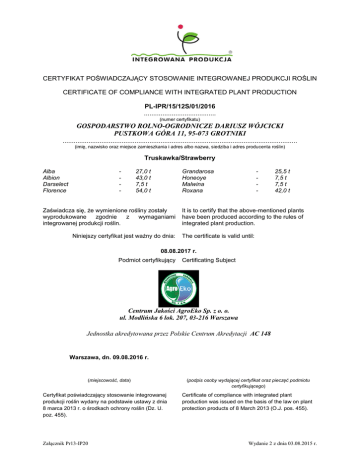 CERTYFIKAT POŚWIADCZAJĄCY STOSOWANIE INTEGROWANEJ PRODUKCJI ROŚLIN CERTIFICATE OF COMPLIANCE WITH INTEGRATED PLANT PRODUCTION PL-IPR/15/12S/01/2016 ....................................... (numer certyfikatu) GOSPODARSTWO ROLNO-OGRODNICZE DARIUSZ WÓJCICKI PUSTKOWA GÓRA 11, 95-073 GROTNIKI ............................................................................................................................... (imię, nazwisko oraz miejsce zamieszkania i adres albo nazwa, siedziba i adres producenta roślin) Truskawka/Strawberry Alba Albion Darselect Florence - 27,0 t 43,0 t 7,5 t 54,0 t Grandarosa Honeoye Malwina Roxana Zaświadcza się, że wymienione rośliny zostały wyprodukowane zgodnie z wymaganiami integrowanej produkcji roślin. Niniejszy certyfikat jest ważny do dnia: - 25,5 t 7,5 t 7,5 t 42,0 t It is to certify that the above-mentioned plants have been produced according to the rules of integrated plant production. The certificate is valid until: 08.08.2017 r. Podmiot certyfikujący Certificating Subject Centrum Jakości AgroEko Sp. z o. o. ul. Modlińska 6 lok. 207, 03-216 Warszawa Jednostka akredytowana przez Polskie Centrum Akredytacji AC 148 Warszawa, dn. 09.08.2016 r. (miejscowość, data) Certyfikat poświadczający stosowanie integrowanej produkcji roślin wydany na podstawie ustawy z dnia 8 marca 2013 r. o środkach ochrony roślin (Dz. U. poz. 455). Załącznik Pr13-IP20 (podpis osoby wydającej certyfikat oraz pieczęć podmiotu certyfikującego) Certificate of compliance with integrated plant production was issued on the basis of the law on plant protection products of 8 March 2013 (O.J. pos. 455). Wydanie 2 z dnia 03.08.2015 r.