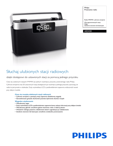 Philips Przenośne radio Radio FM/MW, cyfrowe strojenie 20 programowanych stacji Zegar Zasilanie sieciowe lub bateryjne AE2430 Słuchaj ulubionych stacji radiowych dzięki dostępowi do ustawionych stacji za pomocą jednego przycisku Ciesz się ulubionymi stacjami FM/MW po jednym naciśnięciu przycisku przenośnego radia Philips. Cyfrowe strojenie oraz 20 ustawionych stacji dostępnych po naciśnięciu jednego przycisku sprawiają, że radio to jest proste w obsłudze. Duży wyświetlacz LCD z podświetleniem zapewnia widoczność nawet przy słabym świetle. Ciesz się muzyką ulubionych stacji radiowych • Cyfrowe strojenie z pamięcią stacji zapewnia dodatkową wygodę • Stereofoniczne gniazdo słuchawek pozwala dyskretnie słuchać muzyki Wygodne użytkowanie • Wbudowany zegar • Duży wyświetlacz LCD z podświetleniem zapewnia łatwy odczyt informacji przy słabym świetle • Wbudowany głośnik umożliwia głośne słuchanie radia w dobrej jakości • Wskaźnik niskiego poziomu naładowania baterii sygnalizuje jej rozładowanie • Zasilanie sieciowe lub bateryjne umożliwia swobodne przenoszenie AE2430/12 Przenośne radio Radio FM/MW, cyfrowe strojenie 20 programowanych stacji, Zegar, Zasilanie sieciowe lub bateryjne Zalety Dane techniczne Wbudowany zegar Wbudowany zegar precyzyjnie wyświetla czas. Kiedy radio jest wyłączone, włącza się zegar dla dodatkowej wygody. Duży wyświetlacz LCD z podświetleniem Stereofoniczne gniazdo słuchawek Urządzenie firmy Philips jest wyposażone w dodatkowe złącze umożliwiające podłączenie słuchawek i bardziej osobiste przeżywanie muzyki. Teraz możesz słuchać muzyki, ciesząc się wspaniałym dźwiękiem ze świadomością, że nie przeszkadzasz innym. Wskaźnik niskiego poziomu naładowania akumulatora Tuner/Odbiór/Transmisja • Pamięć stacji: 20 • Pasma tunera: FM, ŚR., UKF stereo • Funkcje i cechy dotyczące tunera: automatyczne dostrajanie cyfrowe Dźwięk • Regulacja głośności: w górę/dół • System dźwięku: stereo • Moc wyjściowa: 1 W RMS Połączenia • Wyjście audio/wideo: Gniazdo słuchawek (3,5 mm) Udogodnienia Podświetlany wyświetlacz LCD zapewnia łatwy odczyt informacji i umożliwia obsługę urządzenia przy słabym świetle. Wbudowany głośnik Wskaźnik niskiego poziomu naładowania baterii włącza się, gdy baterie są niemal rozładowane. Zasilanie sieciowe lub bateryjne • Liczba wyświetlanych cyfr: 5 • Kolor podświetlenia: biały • Typ wyświetlacza: Wyświetlacz LCD Akcesoria • Przewody/podłączenie: Zasilacz sieciowy stabilizowany • Inne: Instrukcja obsługi Wymiary • • • • • Ilość sztuk w opakowaniu zbiorczym: 4 Waga produktu: 1,33 kg Głębokość jednostki centralnej: 76 mm Wysokość jednostki centralnej: 148 mm Szerokość jednostki centralnej: 218 mm Moc Głośnik zapewnia dobrą jakość dźwięku i przyjemność słuchania. Cyfrowe strojenie z pamięcią Zasilaj radio firmy Philips bateriami lub bezpośrednio z sieci elektrycznej i korzystaj z niezwykłej wygody oraz elastyczności. Kiedy gniazdko elektryczne nie jest dostępne lub nie chcesz ciągnąć za sobą przewodu, po prostu zasilaj zestaw bateriami. Jeśli potrzebujesz ciągłego i stabilnego zasilania, podłącz zestaw bezpośrednio do gniazdka elektrycznego. Teraz możesz naprawdę cieszyć się wolnością słuchania w dowolnym miejscu. Cyfrowe strojenie z pamięcią stacji zapewnia dodatkową wygodę Data wydania 2015-06-11 © 2015 Koninklijke Philips N.V. Wszelkie prawa zastrzeżone. Wersja: 2.1.9 Dane techniczne mogą ulec zmianie bez powiadomienia. Znaki towarowe są własnością Koninklijke Philips N.V. lub własnością odpowiednich firm. 12 NC: 8670 000 58903 EAN: 08 71258 15199 33 www.philips.com • • • • • • Rodzaj baterii/akumulatora: Rozmiar C (LR14) Napięcie baterii: 1,5 V Napięcie prądu stałego: 9 V Liczba baterii lub akumulatorów: 4 Źródło zasilania: 220–240 V
