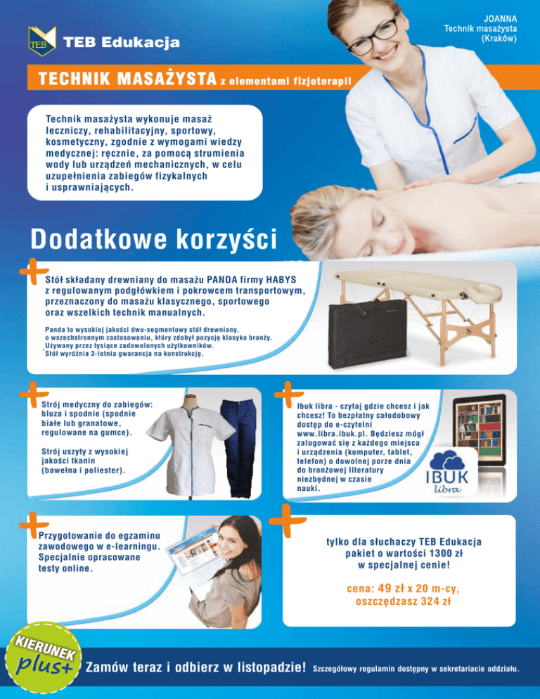 JOANNA Technik masażysta (Kraków) TECHNIK MASAŻYSTA z elementami fizjoterapii Technik masażysta wykonuje masaż leczniczy, rehabilitacyjny, sportowy, kosmetyczny, zgodnie z wymogami wiedzy medycznej: ręcznie, za pomocą strumienia wody lub urządzeń mechanicznych, w celu uzupełnienia zabiegów fizykalnych i usprawniających. Dodatkowe korzyści Stół składany drewniany do masażu PANDA firmy HABYS z regulowanym podgłówkiem i pokrowcem transportowym, przeznaczony do masażu klasycznego, sportowego oraz wszelkich technik manualnych. a Panda to wysokiej jakości dwu-segmentowy stół drewniany, o wszechstronnym zastosowaniu, który zdobył pozycję klasyka branży. Używany przez tysiące zadowolonych użytkowników. Stół wyróżnia 3-letnia gwarancja na konstrukcję. Strój medyczny do zabiegów: bluza i spodnie (spodnie białe lub granatowe, regulowane na gumce). Strój uszyty z wysokiej jakości tkanin (bawełna i poliester). Ibuk libra - czytaj gdzie chcesz i jak chcesz! To bezpłatny całodobowy dostęp do e-czytelni www.libra.ibuk.pl. Będziesz mógł zalogować się z każdego miejsca i urządzenia (komputer, tablet, telefon) o dowolnej porze dnia do branżowej literatury niezbędnej w czasie nauki. Przygotowanie do egzaminu zawodowego w e-learningu. Specjalnie opracowane testy online. tylko dla słuchaczy TEB Edukacja pakiet o wartości 1300 zł w specjalnej cenie! cena: 49 zł x 20 m-cy, oszczędzasz 324 zł KIER UNE plus K Zamów teraz i odbierz w listopadzie! Szczegółowy regulamin dostępny w sekretariacie oddziału.