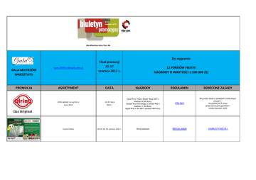 Nr 56 czerwiec 2012 r. Dla Klientów Inter Cars SA Do wygrania: Finał promocji GALA MISTRZÓW www.GMW.intercars.com.pl WARSZTATU PROMOCJA 15-17 12 FORDÓW FIESTA! czerwca 2012 r. ASORTYMENT DATA Zrób zakłady na wyniki w do 01 lipca Euro 2012 Castrol Moto NAGRODY O WARTOŚCI 1 500 000 ZŁ! NAGRODY REGULAMIN SKRÓCONE ZASADY 2012 r. Quad firmy Triton, Model "Baja 250" o wartości 4.500 Euro, Zestaw kina domowego z 3D-Blu-Ray o wartości 1.000 Euro, Apple iPad 3, 64 GB o wartości 800 Euro. ERLING Aby wziąć udział w zakładach przed danym meczem – nie później niż 5 minut przed pierwszym gwizdkiem musisz typować wynik Od 01 do 30 czerwca 2012 r. Bony paliwowe REGULAMIN ZOBACZ WIĘCEJ PROMOCJA ASORTYMENT Olej Castrol Edge i Magnatec Akumulatory Exide Filtry marki Filtron Zestaw wyciągarki DWM 12000 HD Wyposażenie warsztatu za punkty IC PREMIA PLUS DATA NAGRODY REGULAMIN SKRÓCONE ZASADY Kupując olej CASTROL z rodziny EDGE i MAGNATEC możesz zdobyć - Piłka, pięć smyczek, worek treningowy, dwie koszulki, kurtka Softshell REGULAMIN Zestaw Kibica (piłka, 5 smyczy, worek treningowy, 2 koszulki i kurtka Softshell) 2012 r. Rejs po Mazurach EXIDE Kupując amortyzatory EXIDE, zbierasz punkty od 01 marca do 31 lipca 15 wycieczek do USA, 15 dwuosobowych 2012 r. pobytów na Majorce, bony Sodexo. FILTRON więcej na temat promocji na stronie: www.GMW.com.pl pokrowiec na wyciagarkę IC 4x4 więcej na stronie www.ic4x4.pl przykładowe narzędzie ZOBACZ WIĘCEJ więcej na www.ic premiaplus.pl do 16 czerwca 2012 r. od 15 maja do 25 sierpnia promocja bez ograniczenia czasowego promocja bez ograniczenia czasowego PROMOCJA ASORTYMENT DATA Nagroda miesiąca czerwiec Sportowe filtry powietrza Pipercross II kwartał 2012 r. Atrakcyjne ceny i rabaty ZOBACZ WIĘCEJ! Tuning Kity 4GAS II II kwartał 2012 r. Atrakcyjne ceny i rabaty ZOBACZ WIĘCEJ! 4 GAS II Zbiorniki LPG II kwartał 2012 r. Atrakcyjne ceny i rabaty ZOBACZ WIĘCEJ! Zbiornik LPG 4MAX 1201-00-0014N +P = 200L NANO+ letni płyn do spryskiwaczy do wyczerpania zapasów NAGRODY za 30 000 ptk otrzymasz zestaw składający się z piłki i koszulki. Za każdy zakup płynu w beczce 200l. klient otrzymuje ręczną pompkę REGULAMIN ZOBACZ WIĘCEJ SKRÓCONE ZASADY za 30 000 ptk otrzymasz zestaw składający się z piłki i koszulki. Za każdy zakup letniego płynu do spryskiwaczy 4MAX w opakowaniu 200L klient otrzymuje ręczną pompkę. 4MAX 1201-00-0007E = 0,5 L. letni koncentrat do spryskiwaczy 1:10 1201-00-0008E = 5L Letni płyn do spryskiwaczy 1201-00-0011E = 2L. Letni płyn do spryskiwaczy 1201-00-0016E = 20L Letni płyn do spryskiwaczy do wyczerpania zapasów Letnie płyny do spryskiwaczy 4MAX - Taniej ZOBACZ WIĘCEJ 4MAX PROMOCJA ASORTYMENT DATA NAGRODY REGULAMIN SKRÓCONE ZASADY Oferta skierowana jest do wszystkich klientów, ZOBACZ WIĘCEJ TERMINALE PŁATNICZE Kompleksowe usługi na obsługę terminali płatniczych POS bez ograniczenia czasowego którzy chcieliby skorzystać z kompleksowej usługi TERMINAL VERIFONE VX 510 na obsługę terminali płatniczych POS. Dodatkowo dla klientów obecnie akceptujacych karty płatnicze ze średnim obrotem przez kartę powyżej 50 000 zł przewidziana jest specjalna oferta. Szczegóły u Przedstawicieli Handlowych we wszystkich oddziałach Inter Cars SA. Oferta skierowana jest do sieci serwisowych: Q-SERVICE, AUTO CREW, PERFECT SERVICE i Skoda Fabia, Ford Fiesta oraz Lancia Ypsilon jako auto zastępcze w leasingu na 36 lub 48 miesięcy MOTOINTEGRATOR i dotyczy leasingu wybranego Możliwość skorzystania z oferty leasingowej przez cały czas trwania oferty na preferencyjnych warunkach oraz refudacji AUTA ZASTĘPCZE jednym z wielu programów inwestycyinych IC auta poprzez jedną z firm leasingowych (do wyboru Raiffeisen Leasing lub EFL), okres trwania leasingu 36 lub 48 miesięcy. Szczegóły u Przedstawicieli Handlowych we wszystkich oddzialach Inter Cars SA. Nilfisk ADVANCE oraz Nilfisk Alto Myjki, Zamiatarki, Odkurzacze, Maszyny czyszczące Myjnie samochodowe PROMOCJE Z OFERTY WW CDIF Adapter CAN żółty do CDIF/2 KLIKNIJ Elektronarzędzia BOSCH - "80 LAT MŁOTÓW BOSCH" TEXA KONFORT 780R BI-GAS + GRATISY DELPHI ACTIVE + GRATISY Atrakcyjne ceny i rabaty ZOBACZ WIĘCEJ Ceny promocyjne, urządzenia z gwarancją