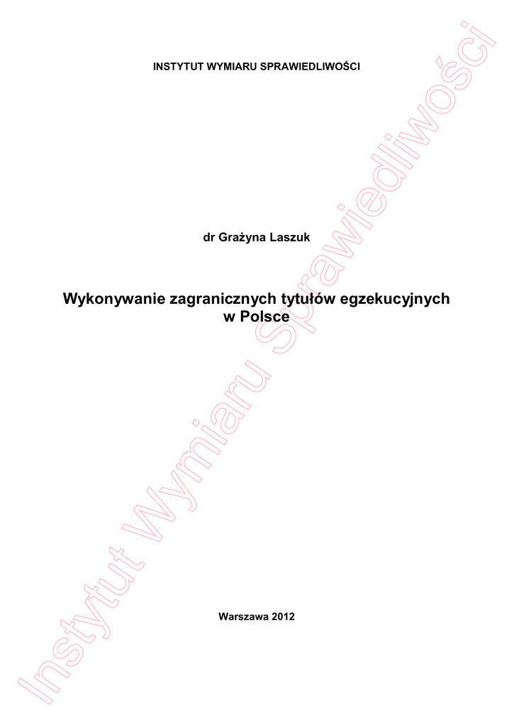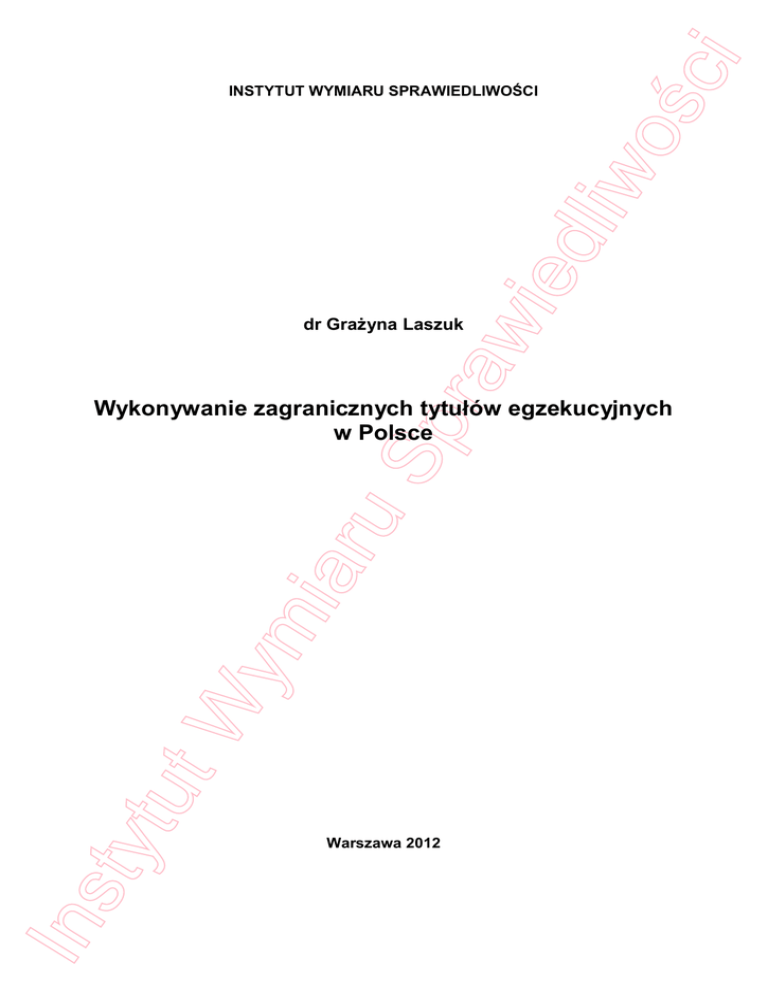 raw ci ied liw o INSTYTUT WYMIARU SPRAWIEDLIWO CI dr Gra yna Laszuk Ins tyt ut W ym i aru Sp Wykonywanie zagranicznych tytu ów egzekucyjnych w Polsce Warszawa 2012 Ins tyt ii ym i ut W aru ied raw Sp liw o ci ci liw o Spis tre ci I. Wst p ...................................................................................................................... 1 II. Metodyka bada ..................................................................................................... 3 ied III. Akty prawne dotycz ce zawodu komornika ........................................................... 4 IV. System EJE – EGZEKUCJA S DOWA w EUROPIE............................................ 7 raw V. Analiza danych statystycznych Ministerstwa Sprawiedliwo ci ............................. 10 VI. Analiza danych uzyskanych z ankiet nades anych przez komorników s dowych 27 VII. Analiza post powa egzekucyjnych prowadzonych na podstawie zagranicznych Sp tytu ów wykonawczych z poszczególnych pa stw........................................... 33 Ins tyt ut W ym i aru VIII. PODSUMOWANIE............................................................................................ 40 iii Ins tyt iv ym i ut W aru ied raw Sp liw o ci ci liw o I. Wst p Temat stanowi cy przedmiot niniejszej analizy zosta zaproponowany przez Departament Wspó pracy Mi dzynarodowej i Prawa Europejskiego Ministerstwa ied Sprawiedliwo ci. Jest to kolejny opracowanie maj ce na celu zapoznanie si z problematyk pracy komorników. Tym razem przedmiotem analizy b dzie wykonywanie na terytorium Polski raw zagranicznych tytu ów egzekucyjnych. Z uwagi na coraz wi kszy udzia polskich przedsi biorców w obrocie gospodarczym z zagranic , nale y domniemywa , zwi ksza si równie e liczba wyroków zas dzaj cych roszczenia od podmiotów maj cych siedzib lub maj tek na terytorium Polski. egzekucji ma równie niema e znaczenie jako czynnik Sp Zwa ywszy, e skuteczno zwi kszaj cy poczucie bezpiecze stwa podejmowanych dzia w tym przez podmioty zagraniczne, skuteczno ta niejednokrotnie mo e wprost na decyzje zagranicznych inwestorów odno nie nawi zania wspó pracy aru wp ywa gospodarczych, i jej form z polskimi podmiotami. Maj c powy sze na uwadze a tak e, e tak wiele problemów napotyka egzekucja prowadzona w oparciu o tytu y egzekucyjne nadane przez polskie organy, wyda o si ym i celowym rozpoznanie z jakimi dodatkowymi trudno ciami spotykaj w przypadku, gdy prowadzone s wykonawcze. a zw aszcza okresem trwania komornicy egzekucje w oparciu o zagraniczne tytu y by o wi c przede wszystkim zapoznanie si ut W Celem bada si post powa z aktualn egzekucyjnych, praktyk , ich kosztami, jednostkowe przypadki a przede wszystkim efektywno ci . Ujawnienie trudno ci zw aszcza, gdy nie b a zjawisko o charakterze masowym – mo e mie Ins tyt stosunków gospodarczych teraz i w przysz to bowiem istotne znaczenie dla ci. Mo e bowiem okaza si , e celowe ci dzie rozwa enie konieczno ci dokonania pewnych zmian proceduralnych, które Ins tyt ut W ym i aru Sp raw ied liw o mia y korzystny wp yw na usprawnienie procedury egzekucyjnej. 2 ci liw o II. Metodyka bada Niniejsze opracowanie wykonano na podstawie analizy: - statystyki prowadzonej w Ministerstwie Sprawiedliwo ci; ied - aktów prawnych; - danych uzyskanych od komorników s dowych zawartych w ankiecie, jaka dzi ki raw uprzejmo ci Prezesa Krajowej Rady Komorniczej i osób z nim wspó pracuj cych zosta a rozes ana do wszystkich aktualnie funkcjonuj cych kancelarii komorniczych. Przy czym jakkolwiek podstawowym za roku 2005 i 2010, to cz eniem by a analiza danych dotycz cych komorników udzieli a odpowiedzi za ca y okres w jakim Sp istnia a ich kancelaria; - akt komorniczych zako czonych post powa Ins tyt ut W ym i aru Instytutu Wymiaru Sprawiedliwo ci. 3 egzekucyjnych, nades anych do ci Powszechnie wiadomo, e dzia alno liw o III. Akty prawne dotycz ce zawodu komornika komorników z racji funkcji jak powierzy im ustawodawca, je li jest skuteczna - stanowi dope nienie ca ego ci gu dzia w celu umo liwienia skutecznego funkcjonowania wymiaru ied podejmowane jakie s sprawiedliwo ci. Bezcelowe bowiem by oby uzyskanie prawomocnych wyroków w sprawach cywilnych je li nie mo na by pó niej skutecznie wyegzekwowa raw zas dzonych roszcze . W Polsce zasady funkcjonowania komorników oraz prowadzonych przez nich egzekucji uregulowane s w : - ustawie z dnia 29 sierpnia 1997 r. o komornikach s dowych i egzekucji Sp (Dz.U. 1997 r. Nr 133, poz. 882 z pó niejszymi zmianami; tekst jednolity Dz.U. 2011r. Nr 231, poz.1376); - ustawie z dnia 17 listopada 1964 r. Kodeks post powania cywilnego ( Dz.U. aru 1964r. Nr 43, poz. 296 z pó niejszymi zmianami ); - ustawie z dnia 14 czerwca 1960 r. Kodeks post powania administracyjnego (tekst jednolity Dz.U. 2000 r. Nr 98 , poz. 1071 z pó niejszymi zmianami); ym i - ustawie z dnia 10 wrze nia 1999 r. Kodeks karny skarbowy (tekst jednolity Dz.U. 2007 r. Nr 111, poz.765 z pó niejszymi zmianami); - konwencji z dnia 10 czerwca 1958 r. o uznawaniu i wykonywaniu ut W zagranicznych orzecze arbitra owych, sporz dzonej w Nowym Jorku ( Dz.U. 1962 r. Nr 9, poz. 41); - rozporz dzeniu Ministra Sprawiedliwo ci z dnia 20 grudnia 2005 r. ( Dz.U. Nr 266, poz.2242) w sprawie okre lenia szczegó owych przepisów o biurowo ci Ins tyt i ewidencji operacji finansowych kancelarii komorniczych. 4 zgodnie z obwi zuj cymi onym lubowaniem oraz zasadami etyki zawodowej. W artykule 1 cytowanej ustawy stwierdza si , liw o przepisami prawa, z ci Wykonuj c swój zawód komornicy winni post powa e komornik s dowy jest funkcjonariuszem publicznym, który dzia a przy s dzie rejonowym. Przy czym wype niaj c swoje obowi zki podlega on tylko ustawom oraz orzeczeniom s du. , e jak to ju wcze niej powiedziano komornik pe ni sw ied Z uwagi na okoliczno funkcj przy s dzie rejonowym, nadzór nad formaln poprawno ci jego dzia alno ci sprawuje prezes s du rejonowego. Nadzór zwierzchni nad dzia alno ci komorników i samorz du komorniczego sprawuje M
