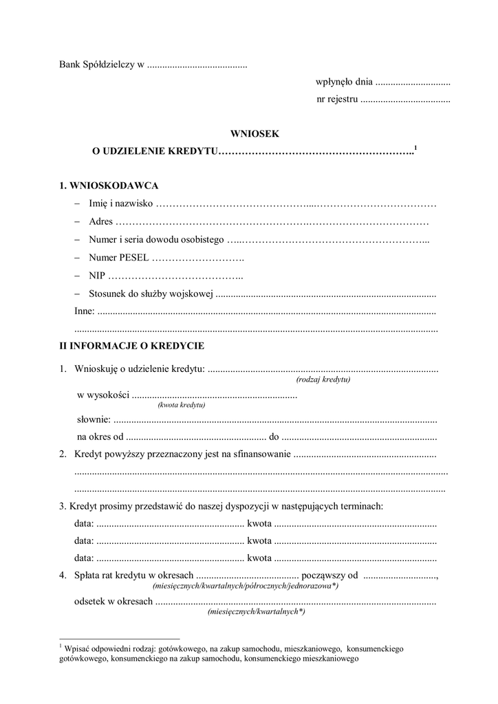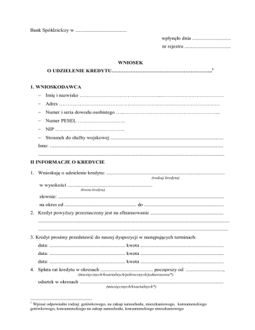 Bank Spółdzielczy w ........................................ wpłynęło dnia .............................. nr rejestru .................................... WNIOSEK O UDZIELENIE KREDYTU…………………………………………………..1 1. WNIOSKODAWCA - Imię i nazwisko ………………………………………....……………………………… - Adres ………………………………………………….……………………………… - Numer i seria dowodu osobistego …..………………………………………………... - Numer PESEL ………………………. - NIP ………………………………….. - Stosunek do służby wojskowej ........................................................................................ Inne: ....................................................................................................................................... ................................................................................................................................................. II INFORMACJE O KREDYCIE 1. Wnioskuję o udzielenie kredytu: ............................................................................................ (rodzaj kredytu) w wysokości .................................................................. (kwota kredytu) słownie: ................................................................................................................................. na okres od ........................................................ do .............................................................. 2. Kredyt powyższy przeznaczony jest na sfinansowanie ......................................................... ..................................................................................................................................................... .................................................................................................................................................... 3. Kredyt prosimy przedstawić do naszej dyspozycji w następujących terminach: data: ........................................................... kwota ................................................................. data: ........................................................... kwota ................................................................. data: ........................................................... kwota ................................................................. 4. Spłata rat kredytu w okresach ......................................... począwszy od ............................., (miesięcznych/kwartalnych/półrocznych/jednorazowa*) odsetek w okresach ................................................................................................................ (miesięcznych/kwartalnych*) 1 Wpisać odpowiedni rodzaj: gotówkowego, na zakup samochodu, mieszkaniowego, konsumenckiego gotówkowego, konsumenckiego na zakup samochodu, konsumenckiego mieszkaniowego 5. Proponuję następujące prawne zabezpieczenie kredytu: .................................................................................................................................................. ................................................................................................................................................... .................................................................................................................................................. III INFORMACJE O DOCHODACH I WYDATKACH WNIOSKODAWCY 1. Miesięczny dochód netto: .................................... w tym: - z tytułu zatrudnienia: ........................................................... - z tytułu prowadzonej działalności ....................................... - z tytułu renty / emerytury .................................................... - inne ................................................................................................................................... ........................................................................................................................................... 2. Liczba osób w rodzinie ....................................................... 3. Wydatki stałe miesięczne ....................................................................................................... ................................................................................................................................................. ................................................................................................................................................. 4. Inne zobowiązania (alimenty, obciążenia komornicze) ........................................................ IV INFORMACJE O ZOBOWIĄZANIACH KREDYTOWYCH WNIOSKODACY / ÓW 1. Zobowiązania z tytułu kredytów ogółem: .................................................................., w tym: · · · Bank ...........................................................................................: - kwota zobowiązania ....................................................................... - kwota pozostała do spłaty .............................................................. - rata miesięczna ............................................................................... Bank ...........................................................................................: - kwota zobowiązania ....................................................................... - kwota pozostała do spłaty .............................................................. - rata miesięczna ............................................................................... Bank ...........................................................................................: - kwota zobowiązania ....................................................................... - kwota pozostała do spłaty .........
