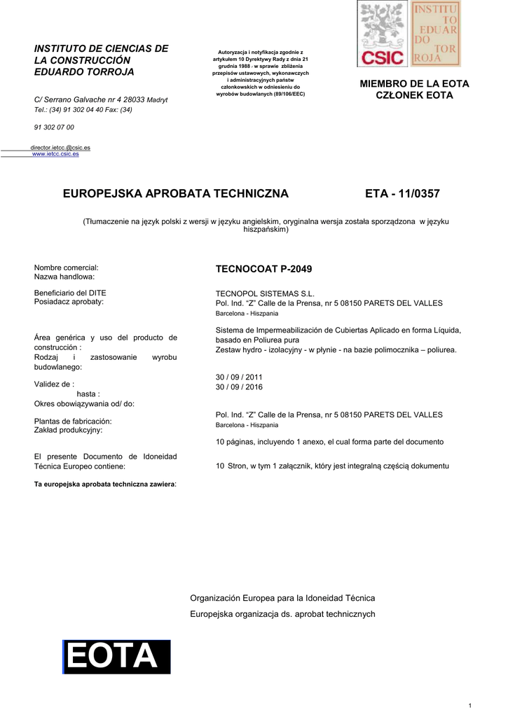 INSTITUTO DE CIENCIAS DE LA CONSTRUCCIÓN EDUARDO TORROJA C/ Serrano Galvache nr 4 28033 Madryt Autoryzacja i notyfikacja zgodnie z artykułem 10 Dyrektywy Rady z dnia 21 grudnia 1988 r w sprawie zbliżenia przepisów ustawowych, wykonawczych i administracyjnych państw członkowskich w odniesieniu do wyrobów budowlanych (89/106/EEC) MIEMBRO DE LA EOTA CZŁONEK EOTA Tel.: (34) 91 302 04 40 Fax: (34) 91 302 07 00 [email protected] www.ietcc.csic.es EUROPEJSKA APROBATA TECHNICZNA ETA - 11/0357 (Tłumaczenie na język polski z wersji w języku angielskim, oryginalna wersja została sporządzona w języku hiszpańskim) Nombre comercial: Nazwa handlowa: TECNOCOAT P-2049 Beneficiario del DITE Posiadacz aprobaty: TECNOPOL SISTEMAS S.L. Pol. Ind. “Z” Calle de la Prensa, nr 5 08150 PARETS DEL VALLES Barcelona - Hiszpania Área genérica y uso del producto de construcción : Rodzaj i zastosowanie wyrobu budowlanego: Validez de : hasta : Okres obowiązywania od/ do: Plantas de fabricación: Zakład produkcyjny: Sistema de Impermeabilización de Cubiertas Aplicado en forma Líquida, basado en Poliurea pura Zestaw hydro - izolacyjny - w płynie - na bazie polimocznika – poliurea. 30 / 09 / 2011 30 / 09 / 2016 Pol. Ind. “Z” Calle de la Prensa, nr 5 08150 PARETS DEL VALLES Barcelona - Hiszpania 10 páginas, incluyendo 1 anexo, el cual forma parte del documento El presente Documento de Idoneidad Técnica Europeo contiene: 10 Stron, w tym 1 załącznik, który jest integralną częścią dokumentu Ta europejska aprobata techniczna zawiera: Organización Europea para la Idoneidad Técnica Europejska organizacja ds. aprobat technicznych EOTA 1 Strona 8 Europejskiej aprobaty technicznej ETA - 11/00xx I. PODSTAWY PRAWNE I POSTANOWIENIA OGÓLNE 1. 1 2 Niniejsza Europejska Aprobata Techniczna jest wydana przez Instituto de Ciencias de la Construccion Eduardo Torroja zgodnie z: - Dyrektywą Rady (89/106/EWG) z dnia 21 grudnia 1988 r. w sprawie zbliżenia przepisów ustawowych, wykonawczych i administracyjnych państw członkowskich w odniesieniu do 1 wyrobów budowlanych, zmienioną przez Dyrektywę Rady 93/68/EWG z lipca 1993 roku . - Real Decreto 1630/1992 de 29 de diciembre, por el que se dictan disposiciones para la libre 2 circulación de productos de construcción en aplicación de la Directiva 89/106/CEE . REAL DECRETO 1328/1995, de 28 de julio, por el que se modifican, en aplicación de la Directiva 93/68/CEE las disposiciones para la libre circulación, aprobadas por el Real Decreto 1630/1992, de 29 de diciembre. (B.O.E. 19.895) y la Orden CTE/2276/2002 de 4 de septiembre. - Ogólnymi zasadami proceduralnymi dotyczącymi składania wniosków, opracowywania i przyznawania Europejskich Aprobat Technicznych, określonymi w załączniku do Decyzji 4 Komisji 94/23/WE . - Wytycznymi do europejskiej aprobaty technicznej dotyczącymi zestawów hydro – izolacyjnych w płynie, ETAG 2005, wydanie 2000, część 1'' Informacje Ogólne " oraz Część 6 " Postanowienia szczegółowe dotyczące zestawów na bazie poliuretanu”. 2. Instytut - Instituto de Ciencias de la Construcción Eduardo Torroja jest upoważniony do kontroli, czy postanowienia niniejszej Europejskiej Aprobaty Technicznej są spełnione. Kontrola może mieć miejsce w zakładzie produkcyjnym (np. dotycząca realizacji założeń zawartych w niniejszej Europejskiej Aprobacie Technicznej w odniesieniu do produkcji). Niemniej jednak odpowiedzialność za zgodność wyrobów z Europejską Aprobatą Techniczną oraz za ich przydatność do zamierzonego zastosowania spoczywa na posiadaczu Europejskiej Aprobaty Technicznej. 3. Niniejsza Europejska Aprobata Techniczna nie może być przeniesiona na innych producentów lub przedstawicieli producentów, innych niż wymienieni na stronie 1, lub zakłady produkcyjne inne niż te / wskazane na stronie 1 / ustalone w kontekście niniejszej Europejskiej Aprobaty Technicznej . 4. Niniejsza Europejska Aprobata Techniczna może być wycofana przez Instytut - Instituto de Ciencias de la Construcción Eduardo Torroja zgodnie z artykułem 5.1 Dyrektywy 89/106/EWG. 5. Powielanie niniejszej Europejskiej Aprobaty Technicznej, w tym rozprowadzanie drogą elektroniczną, powinno odbywać się w całości. Jednakże częściowe powielanie może być dopuszczone, za pisemną zgodą Instytutu - Instituto de Ciencias de la Construccion Eduardo Torroja. W takim przypadku częściowe powielenie musi być oznaczone jako takowe. Teksty i rysunki broszur reklamowych nie mogą być sprzeczne z Europejską Aprobatą Techniczną. 6. Europejska Aprobata Techniczna jest wydawana przez organ zatwierdzający w jego języku urzędowym. Ta wersja odpowiada wersji EOTA. Tłumaczenia na inne języki muszą być oznaczone jako takowe. Dziennik Urzędowy Wspólnoty Europejskiej nr L 220, 30.8.1993, str.1 Boletín Oficial del Estado nr 34 de 9 de febrero de 01993. 2 Strona 3 z 10 Europejskiej aprobaty technicznej ETA - 11/00xx ……………………………………………………………………………………………………………………………………………………………………………………………………………………………………………………………………………………………………………………………………………………………………………………………………………………………………………………………………………………………………………………………………………………………………………………………………………………………………………………………………………………………………………………………………………………………………………………………………………………………………………………………………………………………………………………………………………