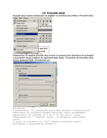 13. Przyciski akcji Przyciski akcji można umieszczać na slajdach za pomocą opcji Pokaz->Przyciski akcji: Umieściwszy na slajdzie przycisk akcji można za pomocą listy Hiperłącze do powiązać z przyciskiem akcję przejścia do odpowiedniego slajdu. Oczywiście do przycisku akcji można dodawać tekst i formatować go. Ćwiczenie: W prezentacji 13._Przyciski_akcji.ppt umieść w miejscach pól tekstowych na slajdzie drugim przyciski akcji prowadzące odpowiednio do slajdów od 3 do 6. W tym celu z listy "Hiperłącze do.." wybierz Slajd.. a następnie odpowiedni tytuł. Z kolej na slajdach od 3 do 6 umieść przyciski powrót prowadzące z powrotem do slajdu 2.