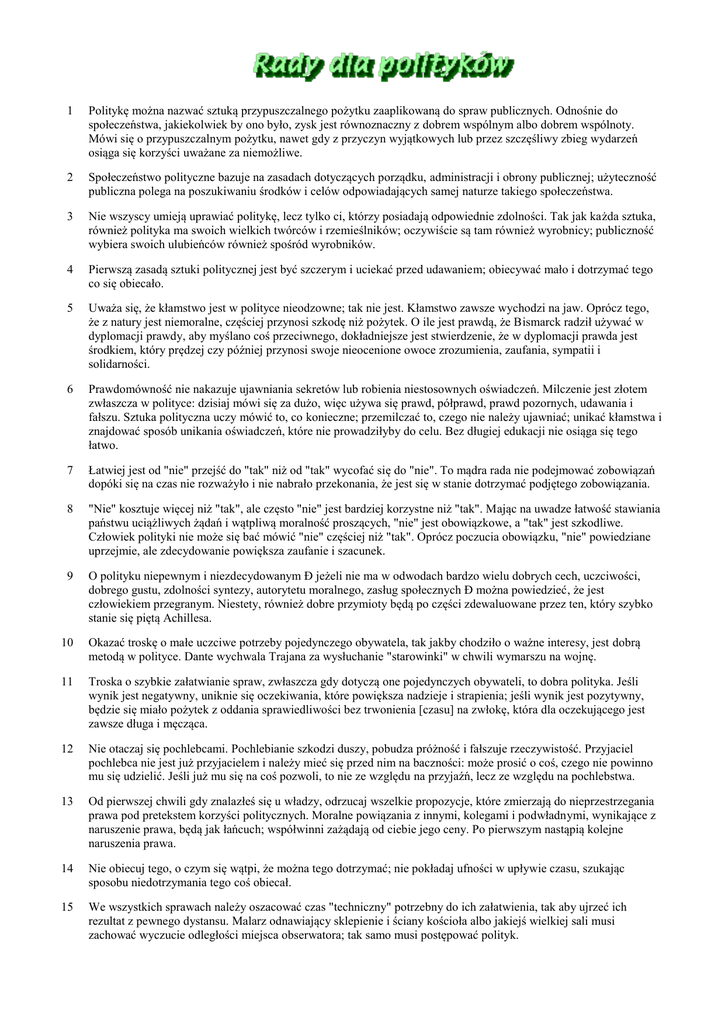 1 Politykę można nazwać sztuką przypuszczalnego pożytku zaaplikowaną do spraw publicznych. Odnośnie do społeczeństwa, jakiekolwiek by ono było, zysk jest równoznaczny z dobrem wspólnym albo dobrem wspólnoty. Mówi się o przypuszczalnym pożytku, nawet gdy z przyczyn wyjątkowych lub przez szczęśliwy zbieg wydarzeń osiąga się korzyści uważane za niemożliwe. 2 Społeczeństwo polityczne bazuje na zasadach dotyczących porządku, administracji i obrony publicznej; użyteczność publiczna polega na poszukiwaniu środków i celów odpowiadających samej naturze takiego społeczeństwa. 3 Nie wszyscy umieją uprawiać politykę, lecz tylko ci, którzy posiadają odpowiednie zdolności. Tak jak każda sztuka, również polityka ma swoich wielkich twórców i rzemieślników; oczywiście są tam również wyrobnicy; publiczność wybiera swoich ulubieńców również spośród wyrobników. 4 Pierwszą zasadą sztuki politycznej jest być szczerym i uciekać przed udawaniem; obiecywać mało i dotrzymać tego co się obiecało. 5 Uważa się, że kłamstwo jest w polityce nieodzowne; tak nie jest. Kłamstwo zawsze wychodzi na jaw. Oprócz tego, że z natury jest niemoralne, częściej przynosi szkodę niż pożytek. O ile jest prawdą, że Bismarck radził używać w dyplomacji prawdy, aby myślano coś przeciwnego, dokładniejsze jest stwierdzenie, że w dyplomacji prawda jest środkiem, który prędzej czy później przynosi swoje nieocenione owoce zrozumienia, zaufania, sympatii i solidarności. 6 Prawdomówność nie nakazuje ujawniania sekretów lub robienia niestosownych oświadczeń. Milczenie jest złotem zwłaszcza w polityce: dzisiaj mówi się za dużo, więc używa się prawd, półprawd, prawd pozornych, udawania i fałszu. Sztuka polityczna uczy mówić to, co konieczne; przemilczać to, czego nie należy ujawniać; unikać kłamstwa i znajdować sposób unikania oświadczeń, które nie prowadziłyby do celu. Bez długiej edukacji nie osiąga się tego łatwo. 7 Łatwiej jest od "nie" przejść do "tak" niż od "tak" wycofać się do "nie". To mądra rada nie podejmować zobowiązań dopóki się na czas nie rozważyło i nie nabrało przekonania, że jest się w stanie dotrzymać podjętego zobowiązania. 8 "Nie" kosztuje więcej niż "tak", ale często "nie" jest bardziej korzystne niż "tak". Mając na uwadze łatwość stawiania państwu uciążliwych żądań i wątpliwą moralność proszących, "nie" jest obowiązkowe, a "tak" jest szkodliwe. Człowiek polityki nie może się bać mówić "nie" częściej niż "tak". Oprócz poczucia obowiązku, "nie" powiedziane uprzejmie, ale zdecydowanie powiększa zaufanie i szacunek. 9 O polityku niepewnym i niezdecydowanym Đ jeżeli nie ma w odwodach bardzo wielu dobrych cech, uczciwości, dobrego gustu, zdolności syntezy, autorytetu moralnego, zasług społecznych Đ można powiedzieć, że jest człowiekiem przegranym. Niestety, również dobre przymioty będą po części zdewaluowane przez ten, który szybko stanie się piętą Achillesa. 10 Okazać troskę o małe uczciwe potrzeby pojedynczego obywatela, tak jakby chodziło o ważne interesy, jest dobrą metodą w polityce. Dante wychwala Trajana za wysłuchanie "starowinki" w chwili wymarszu na wojnę. 11 Troska o szybkie załatwianie spraw, zwłaszcza gdy dotyczą one pojedynczych obywateli, to dobra polityka. Jeśli wynik jest negatywny, uniknie się oczekiwania, które powiększa nadzieje i strapienia; jeśli wynik jest pozytywny, będzie się miało pożytek z oddania sprawiedliwości bez trwonienia [czasu] na zwłokę, która dla oczekującego jest zawsze długa i męcząca. 12 Nie otaczaj się pochlebcami. Pochlebianie szkodzi duszy, pobudza próżność i fałszuje rzeczywistość. Przyjaciel pochlebca nie jest już przyjacielem i należy mieć się przed nim na baczności: może prosić o coś, czego nie powinno mu się udzielić. Jeśli już mu się na coś pozwoli, to nie ze względu na przyjaźń, lecz ze względu na pochlebstwa. 13 Od pierwszej chwili gdy znalazłeś się u władzy, odrzucaj wszelkie propozycje, które zmierzają do nieprzestrzegania prawa pod pretekstem korzyści politycznych. Moralne powiązania z innymi, kolegami i podwładnymi, wynikające z naruszenie prawa, będą jak łańcuch; współwinni zażądają od ciebie jego ceny. Po pierwszym nastąpią kolejne naruszenia prawa. 14 Nie obiecuj tego, o czym się wątpi, że można tego dotrzymać; nie pokładaj ufności w upływie czasu, szukając sposobu niedotrzymania tego coś obiecał. 15 We wszystkich sprawach należy oszacować czas "techniczny" potrzebny do ich załatwienia, tak aby ujrzeć ich rezultat z pewnego dystansu. Malarz odnawiający sklepienie i ściany kościoła albo jakiejś wielkiej sali musi zachować wyczucie odległości miejsca obserwatora; tak samo musi postępować polityk. Na dodatek trzeba oszacować czas "polityczny" do psychicznego przygotowania współpracowników i społeczeństwa; czas "parlamentarny" w przypadku demokracji i czas "przedsionków" w przypadku dyktatury. To jeszcze za mało. Trzeba też przewidzieć czas "biurokracji", najdłuższy i najbardziej stracony. Dopiero na końcu przychodzi czas "techniczny" na realizację. Kto chce zlikwidować jeden z tych czasów, często marnuje całe zamierzone dzieło, a nawet całą swą politykę i siebie samego. 16 Nie odkładaj na jutro tego, co możesz zrobić dzisiaj; ale nie rób dzisiaj w pośpiechu tego co możesz zrobić jutro spokojnie. 17 Cierpliwość polityka powinna naśladować cierpliwość Boga w stosunku do ludzi. Nigdy nie należy tracić odpowiedniej chwili, lecz zawsze chwytać właściwy moment na nagrodę lub karę. 18 Nie ma współpracy bez zaufania. Kiedy się dowiesz, że twój współpracownik nie jest lojalny, tego samego dnia znajdź sposób na pozbycie się go jak najszybciej, i już nigdy więcej nie przyjmuj go z powrotem. 19 Nie zasłaniaj swym autorytetem błęd