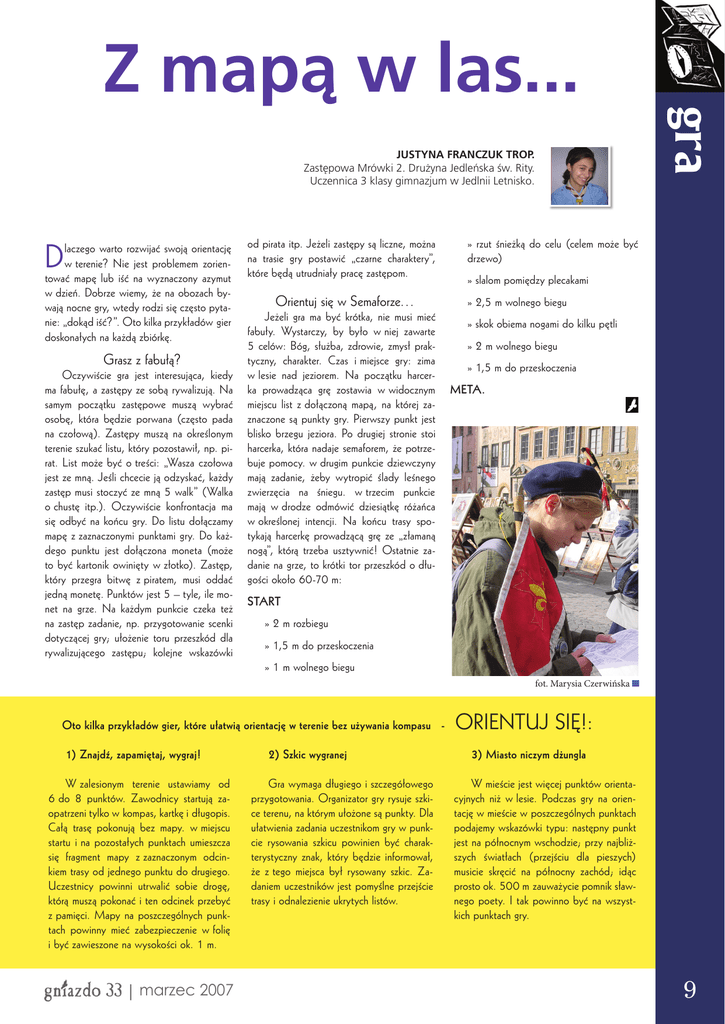 JUSTYNA FRANCZUK TROP. Zastępowa Mrówki 2. Drużyna Jedleńska św. Rity. Uczennica 3 klasy gimnazjum w Jedlnii Letnisko. D laczego warto rozwijać swoją orientację w terenie? Nie jest problemem zorientować mapę lub iść na wyznaczony azymut w dzień. Dobrze wiemy, że na obozach bywają nocne gry, wtedy rodzi się często pytanie: „dokąd iść?”. Oto kilka przykładów gier doskonałych na każdą zbiórkę. Grasz z fabułą? Oczywiście gra jest interesująca, kiedy ma fabułę, a zastępy ze sobą rywalizują. Na samym początku zastępowe muszą wybrać osobę, która będzie porwana (często pada na czołową). Zastępy muszą na określonym terenie szukać listu, który pozostawił, np. pirat. List może być o treści: „Wasza czołowa jest ze mną. Jeśli chcecie ją odzyskać, każdy zastęp musi stoczyć ze mną 5 walk” (Walka o chustę itp.). Oczywiście konfrontacja ma się odbyć na końcu gry. Do listu dołączamy mapę z zaznaczonymi punktami gry. Do każdego punktu jest dołączona moneta (może to być kartonik owinięty w złotko). Zastęp, który przegra bitwę z piratem, musi oddać jedną monetę. Punktów jest 5 – tyle, ile monet na grze. Na każdym punkcie czeka też na zastęp zadanie, np. przygotowanie scenki dotyczącej gry; ułożenie toru przeszkód dla rywalizującego zastępu; kolejne wskazówki od pirata itp. Jeżeli zastępy są liczne, można na trasie gry postawić „czarne charaktery”, które będą utrudniały pracę zastępom. Orientuj się w Semaforze… Jeżeli gra ma być krótka, nie musi mieć fabuły. Wystarczy, by było w niej zawarte 5 celów: Bóg, służba, zdrowie, zmysł praktyczny, charakter. Czas i miejsce gry: zima w lesie nad jeziorem. Na początku harcerka prowadząca grę zostawia w widocznym miejscu list z dołączoną mapą, na której zaznaczone są punkty gry. Pierwszy punkt jest blisko brzegu jeziora. Po drugiej stronie stoi harcerka, która nadaje semaforem, że potrzebuje pomocy. w drugim punkcie dziewczyny mają zadanie, żeby wytropić ślady leśnego zwierzęcia na śniegu. w trzecim punkcie mają w drodze odmówić dziesiątkę różańca w określonej intencji. Na końcu trasy spotykają harcerkę prowadzącą grę ze „złamaną nogą”, którą trzeba usztywnić! Ostatnie zadanie na grze, to krótki tor przeszkód o długości około 60-70 m: gra Z mapą w las... » rzut śnieżką do celu (celem może być drzewo) » slalom pomiędzy plecakami » 2,5 m wolnego biegu » skok obiema nogami do kilku pętli » 2 m wolnego biegu » 1,5 m do przeskoczenia META. START » 2 m rozbiegu » 1,5 m do przeskoczenia » 1 m wolnego biegu fot. Marysia Czerwińska Oto kilka przykładów gier, które ułatwią orientację w terenie bez używania kompasu 1) Znajdź, zapamiętaj, wygraj! W zalesionym terenie ustawiamy od 6 do 8 punktów. Zawodnicy startują zaopatrzeni tylko w kompas, kartkę i długopis. Całą trasę pokonują bez mapy. w miejscu startu i na pozostałych punktach umieszcza się fragment mapy z zaznaczonym odcinkiem trasy od jednego punktu do drugiego. Uczestnicy powinni utrwalić sobie drogę, którą muszą pokonać i ten odcinek przebyć z pamięci. Mapy na poszczególnych punktach powinny mieć zabezpieczenie w folię i być zawieszone na wysokości ok. 1 m. gniazdo 33 | marzec 2007 2) Szkic wygranej Gra wymaga długiego i szczegółowego przygotowania. Organizator gry rysuje szkice terenu, na którym ułożone są punkty. Dla ułatwienia zadania uczestnikom gry w punkcie rysowania szkicu powinien być charakterystyczny znak, który będzie informował, że z tego miejsca był rysowany szkic. Zadaniem uczestników jest pomyślne przejście trasy i odnalezienie ukrytych listów. ORIENTUJ SIĘ!: 3) Miasto niczym dżungla W mieście jest więcej punktów orientacyjnych niż w lesie. Podczas gry na orientację w mieście w poszczególnych punktach podajemy wskazówki typu: następny punkt jest na północnym wschodzie; przy najbliższych światłach (przejściu dla pieszych) musicie skręcić na północny zachód; idąc prosto ok. 500 m zauważycie pomnik sławnego poety. I tak powinno być na wszystkich punktach gry. 9